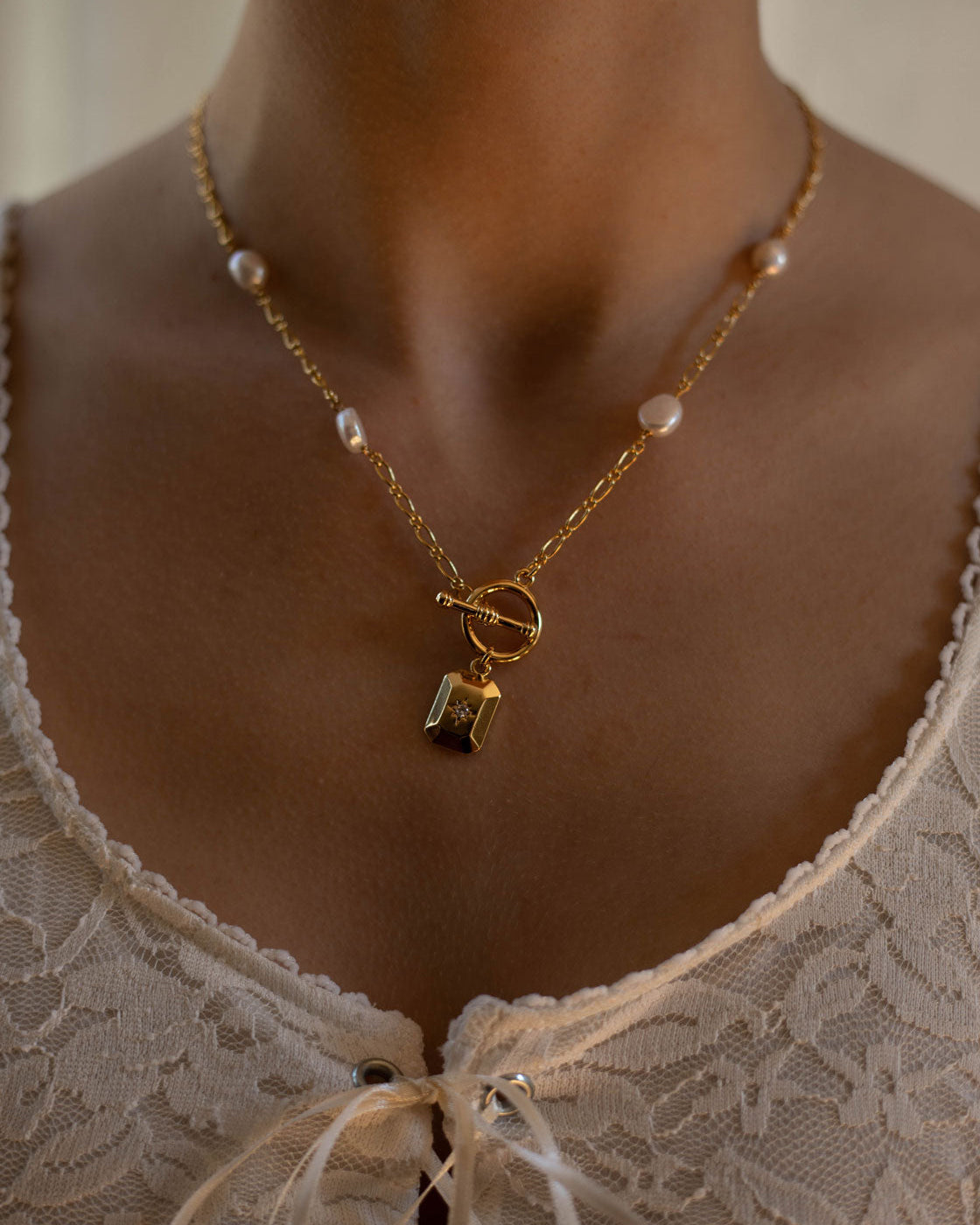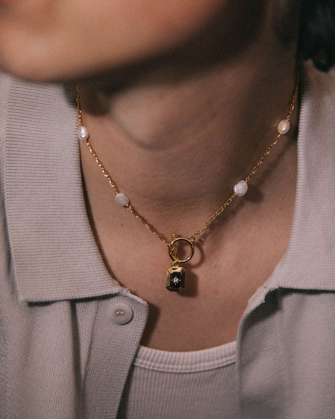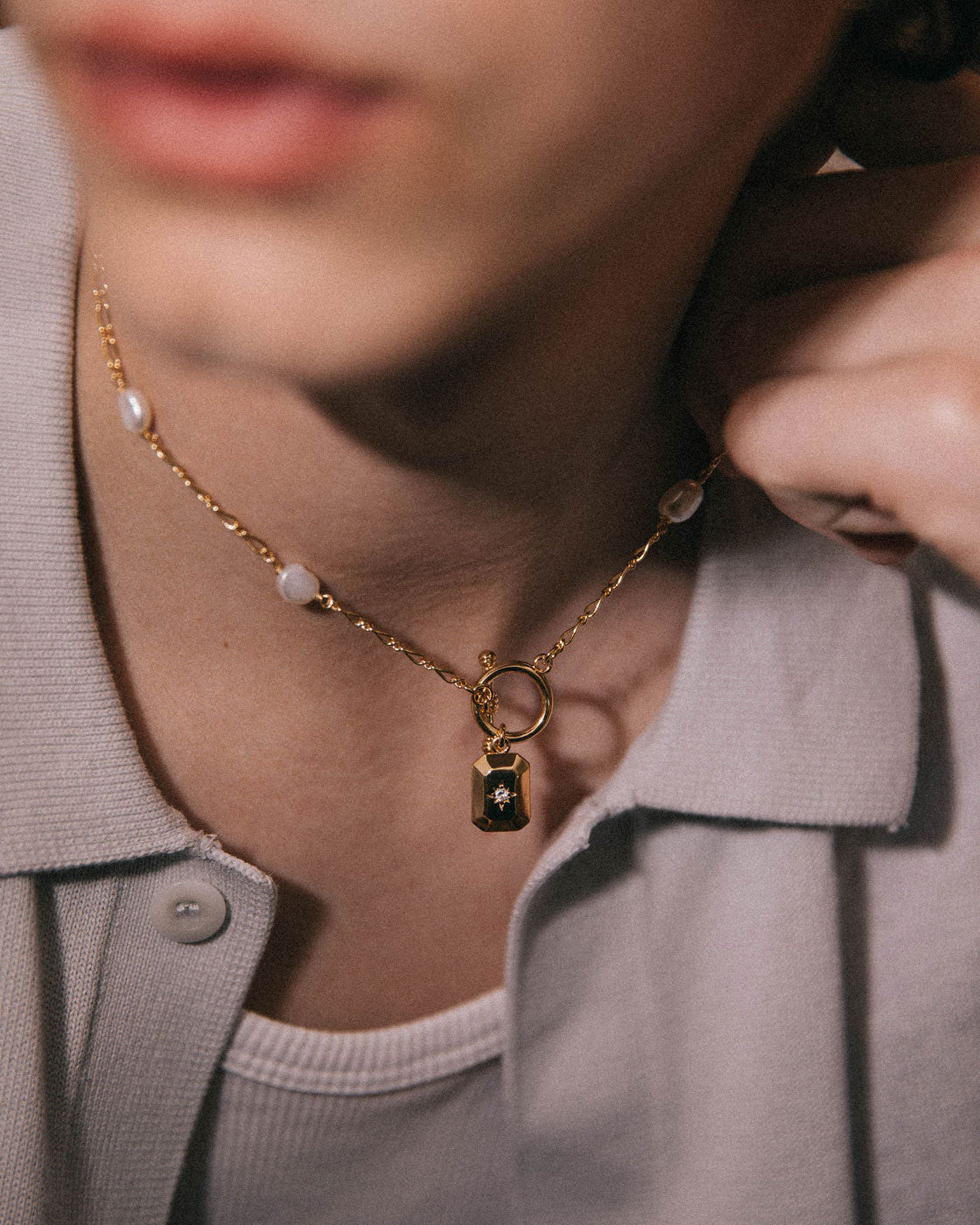 Material: 18k Gold Plated Brass with Emerald Glass Stones, Freshwater Pearl and Cubic Zirconia