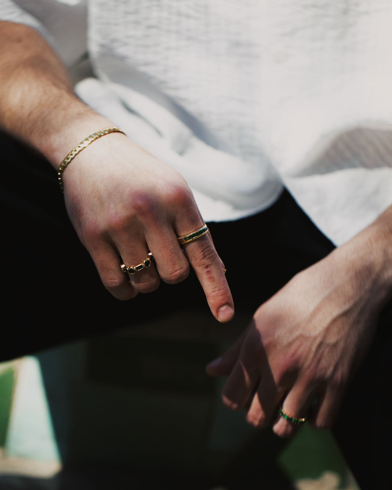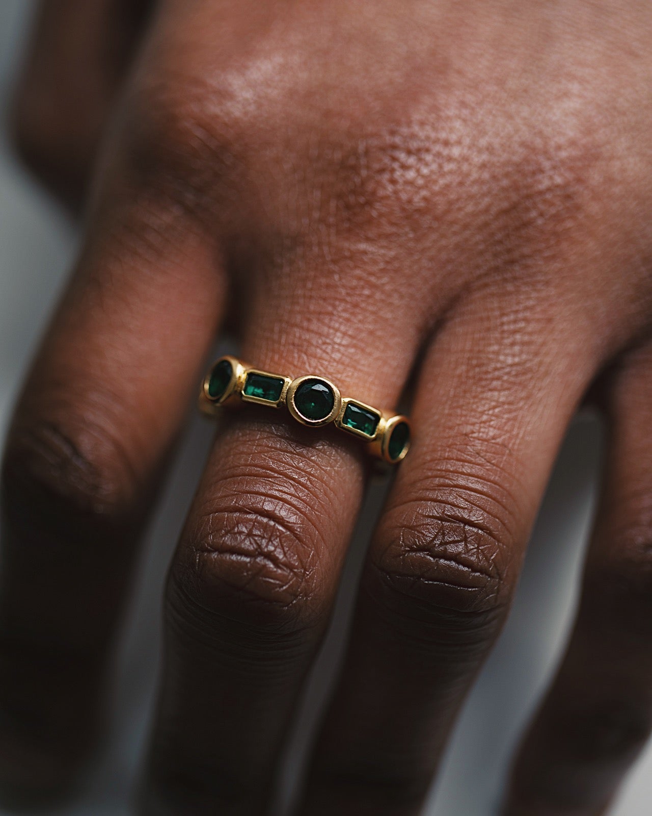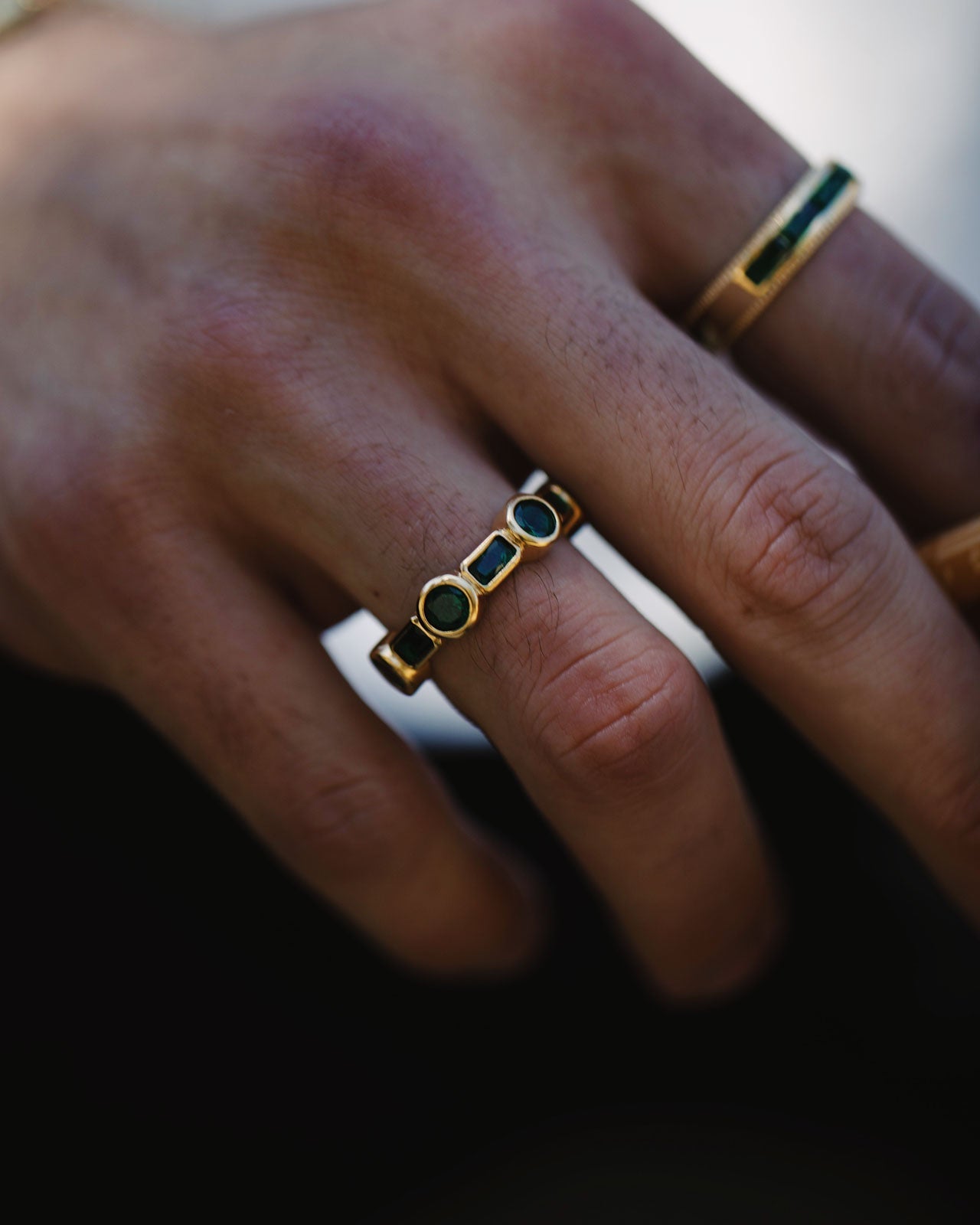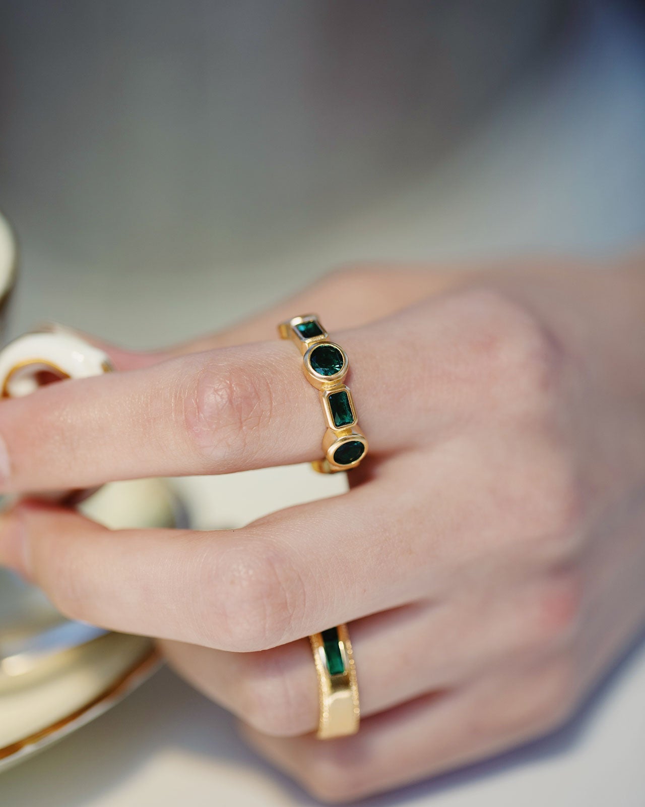 Introducing the captivating 'Arden' Ring, a stunning piece that combines elegance and allure. Crafted with 18k gold plated metal, this ring features emerald cubic zirconia stones that exude a mesmerising brilliance. The 'Arden' Ring effortlessly enhances your style with its timeless beauty and vibrant sparkle. Embrace the charm of this exquisite ring and let it become a statement piece in your collection.