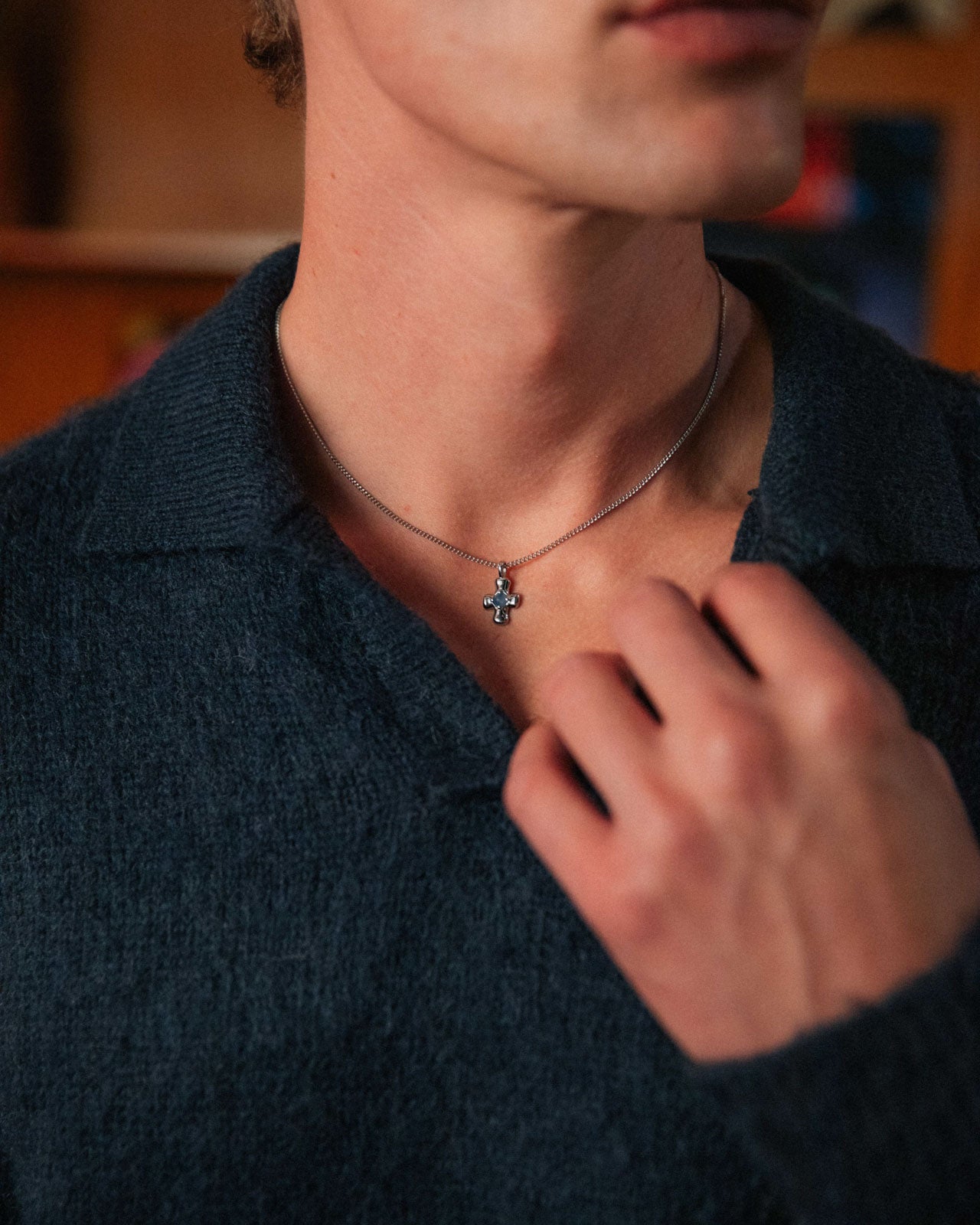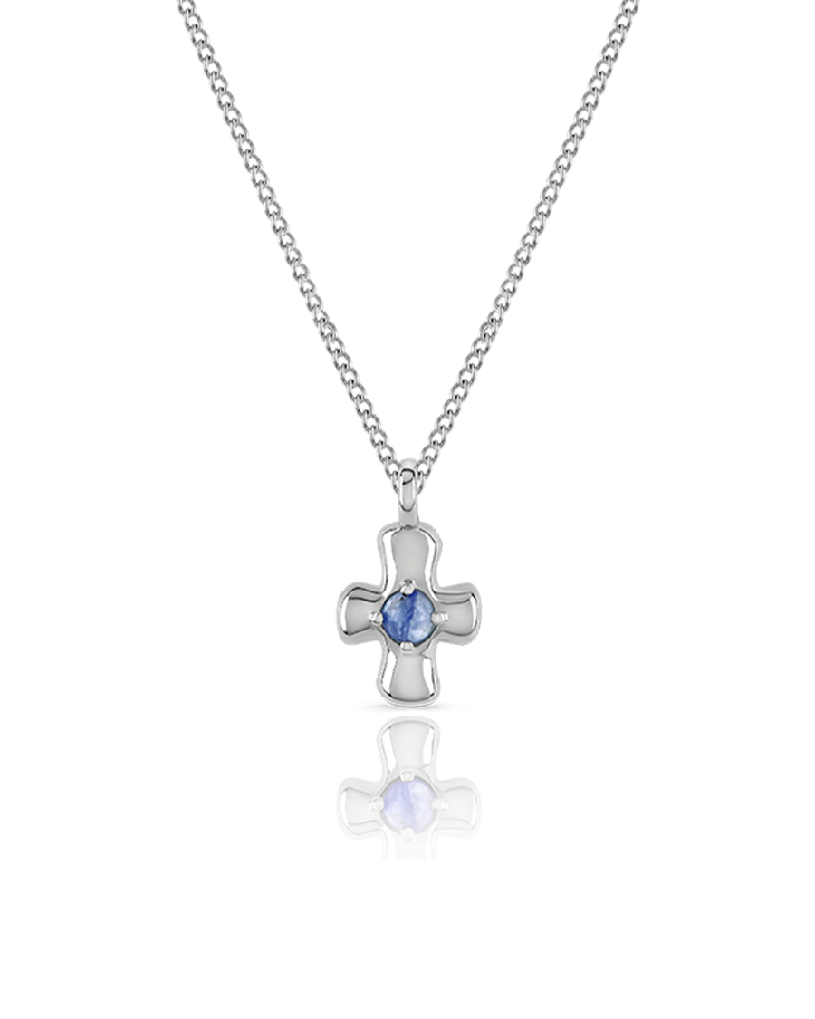 Rounded by nature, and by knowledge. Adorn your look with this smooth cross pendant with a claw set blue quartz gemstone.