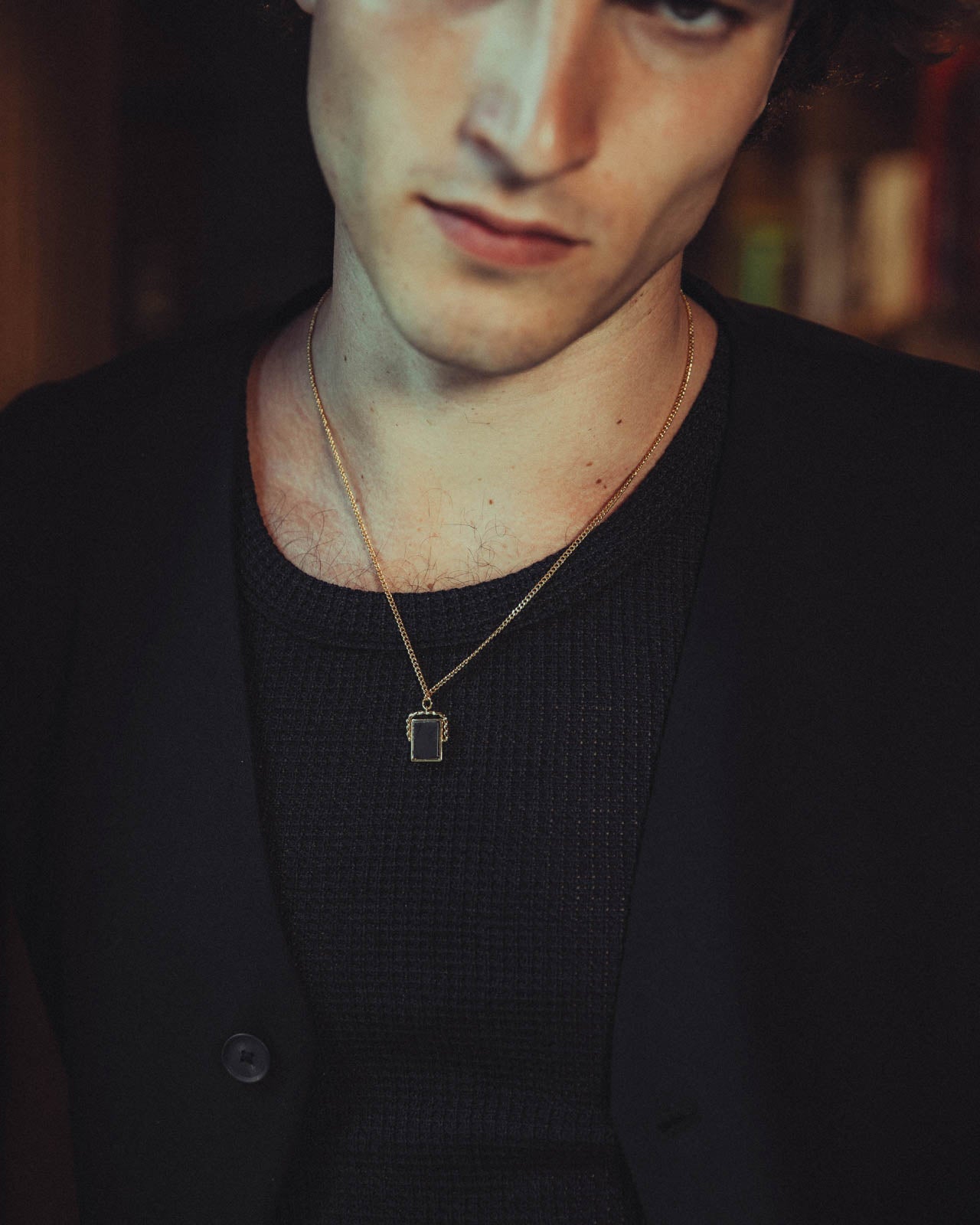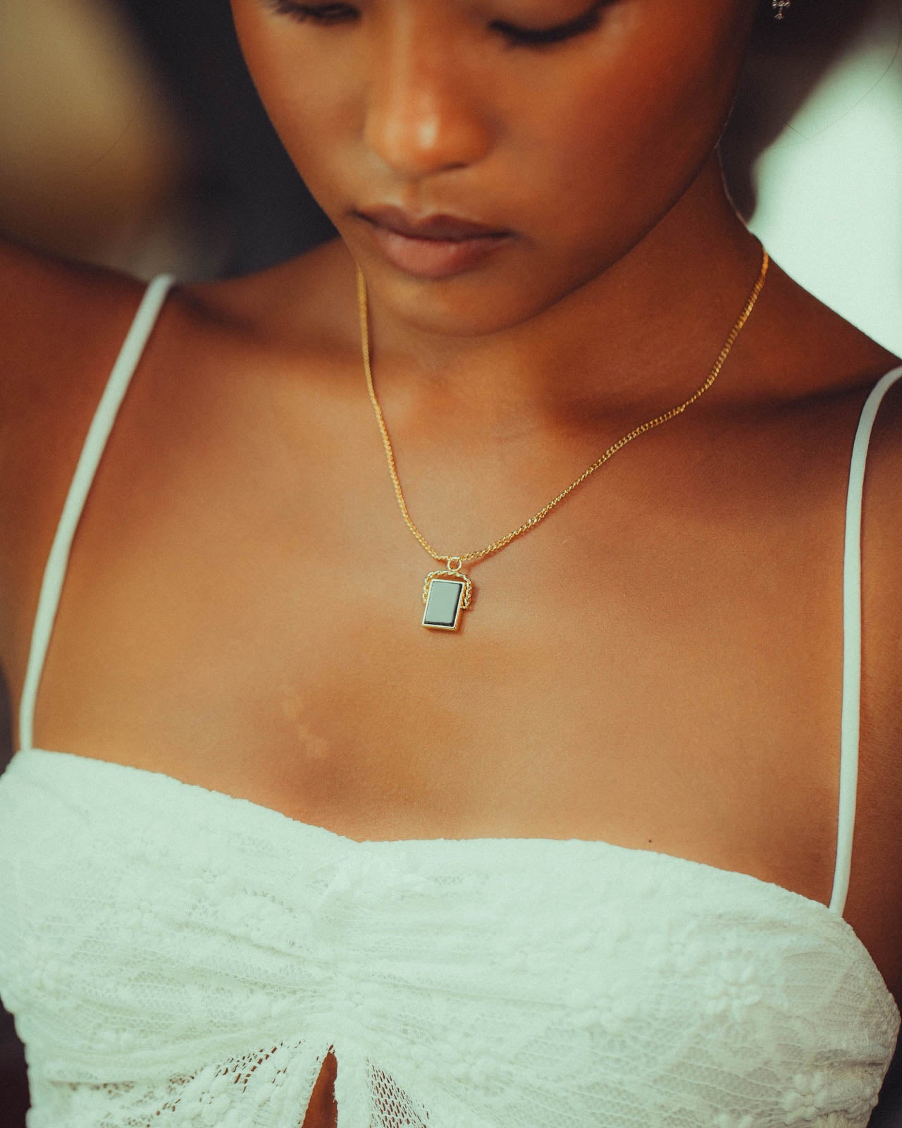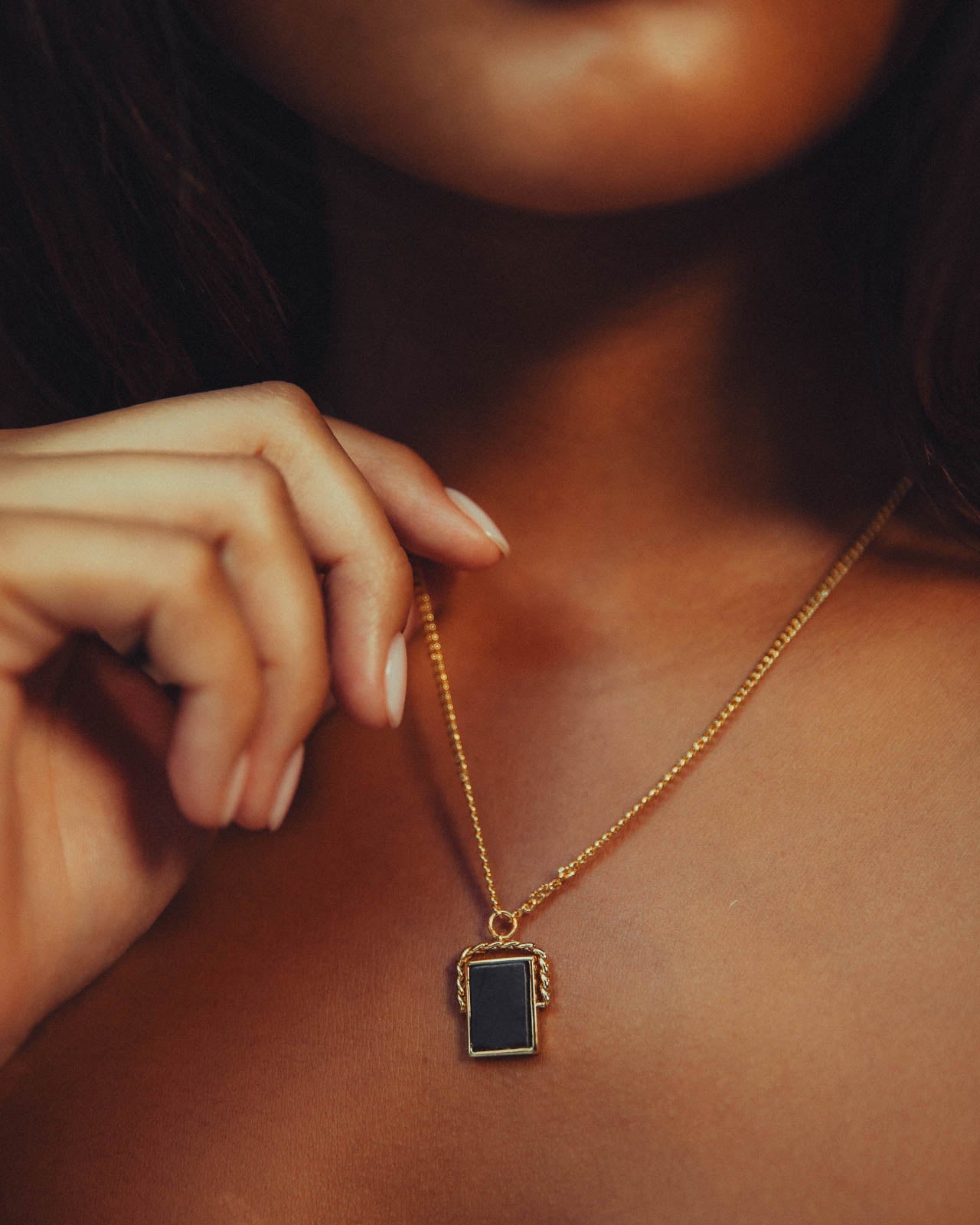 Introducing Cassius, a curb chain necklace that exudes contemporary elegance with a unique twist. Featuring a curb chain design and a flippable black onyx stone pendant.