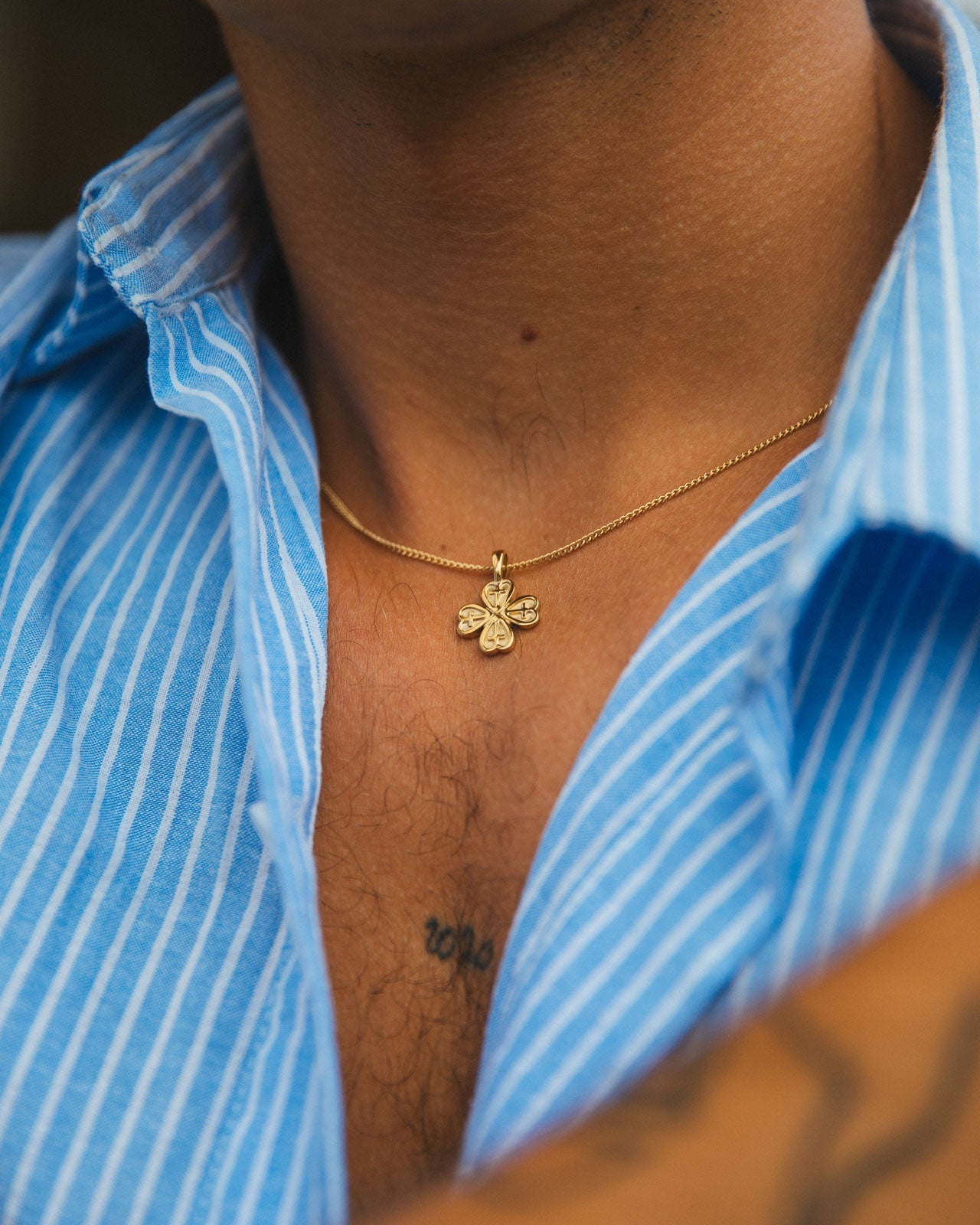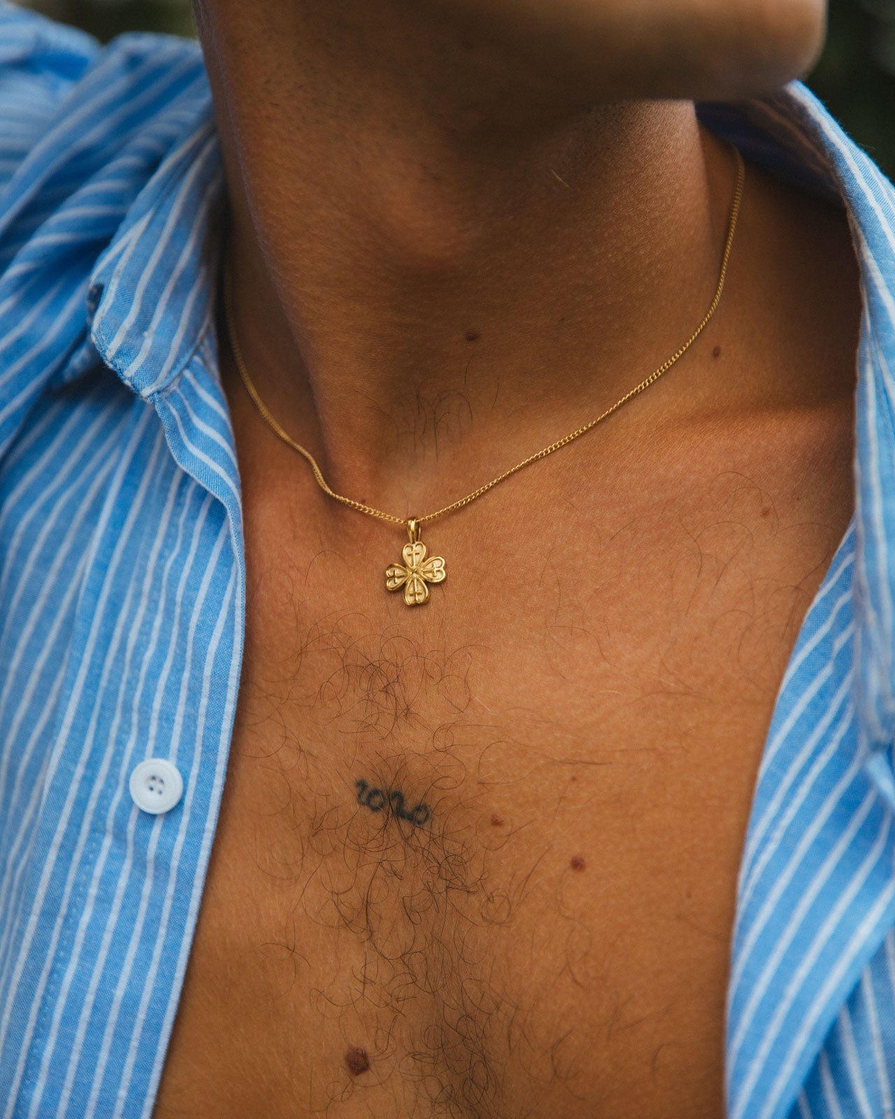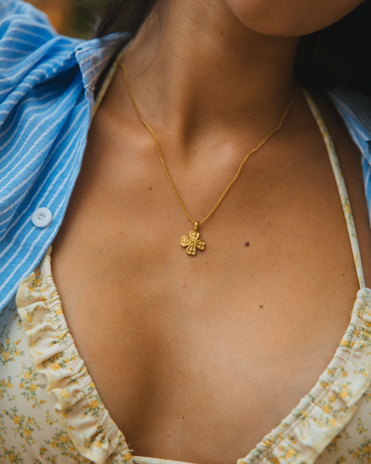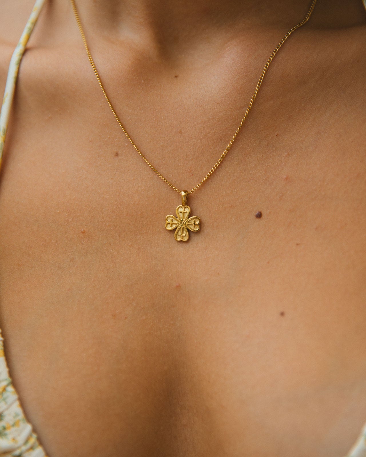 Chance is here to bring you good luck and prosperity featuring a delicate four-leaf clover design. Named to reflect the luck and fortune associated with this timeless symbol, this necklace is a charming reminder of the positive possibilities life has to offer. Made with 14k gold PVD plated stainless steel, it's waterproof and tarnish-free, perfect for beach days.