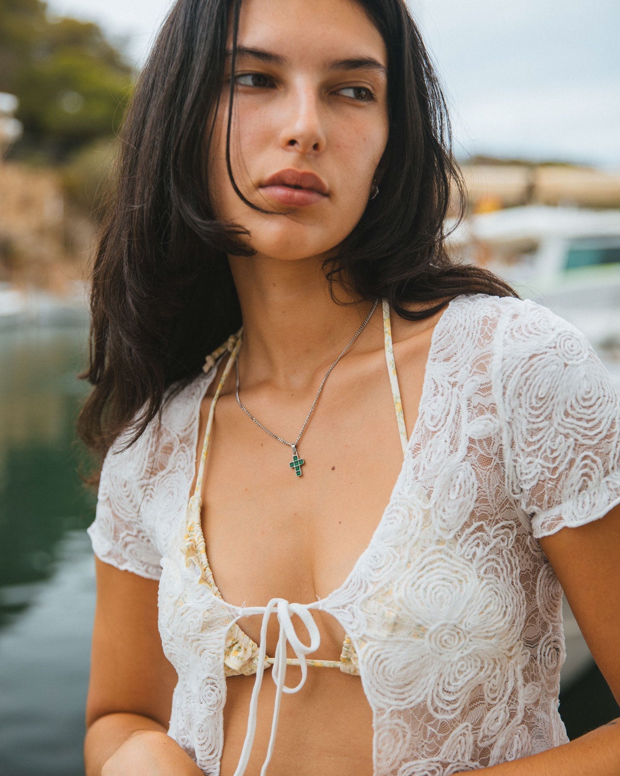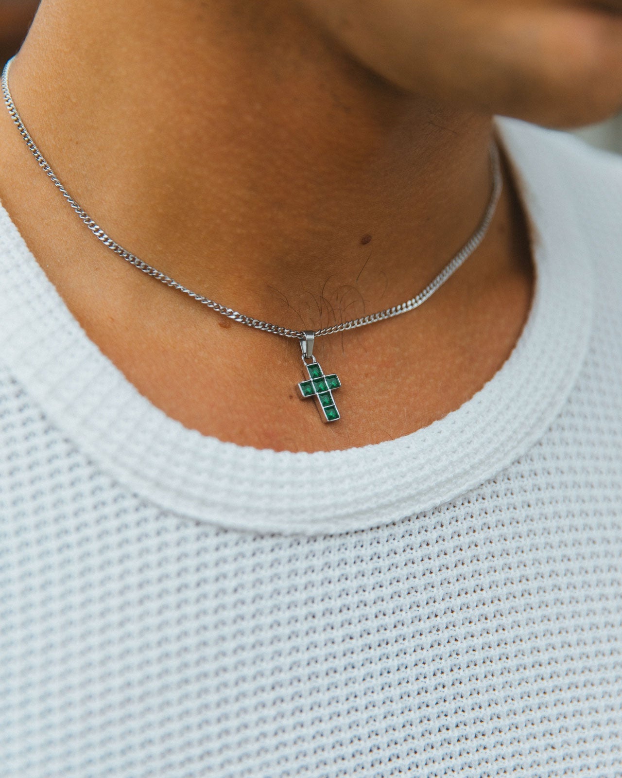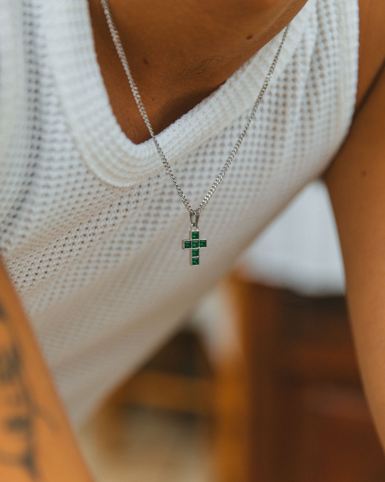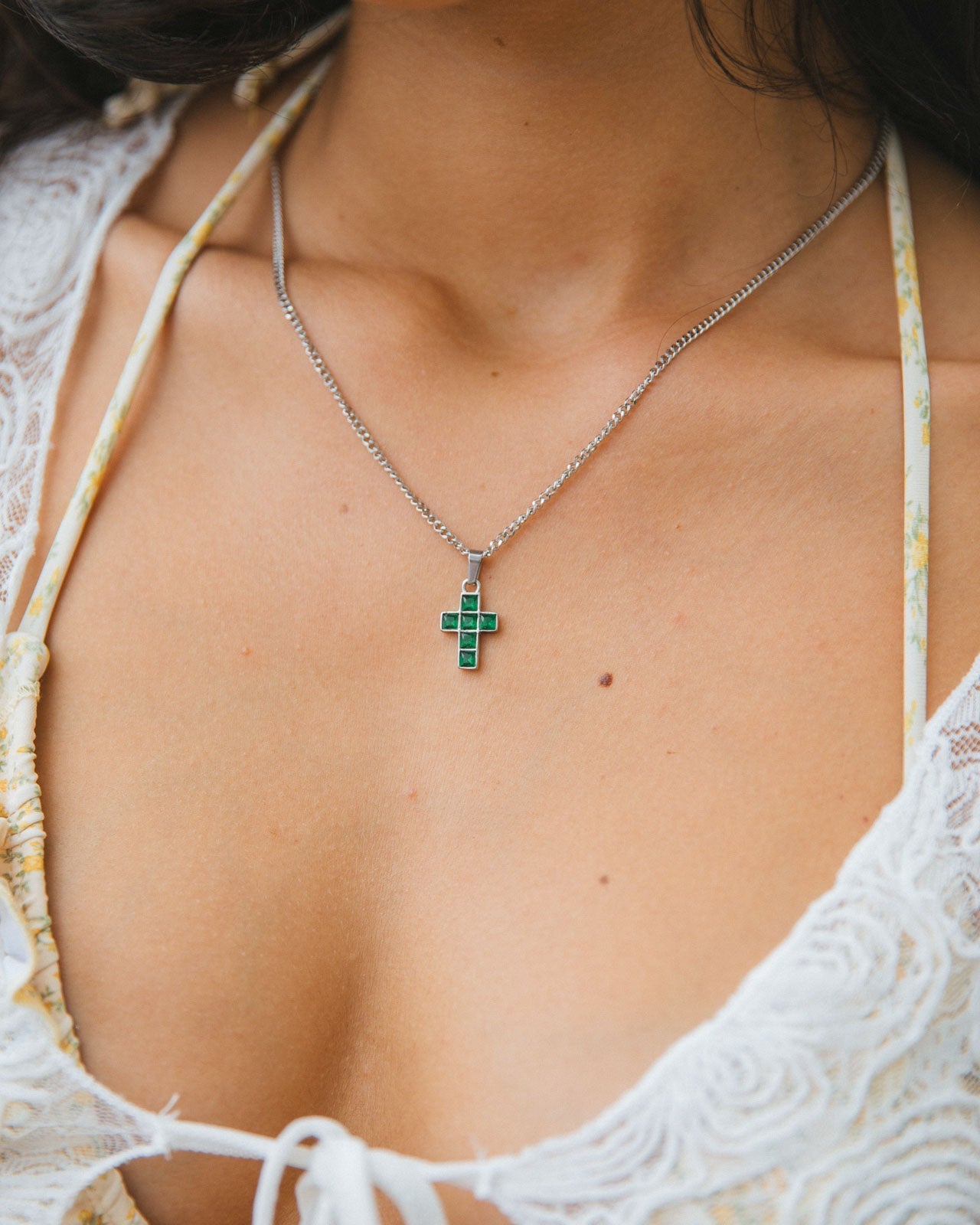 Cruz is full of vintage charm, with its mosaic stone placement and intricate detailing. Its name comes from the Spanish word for "cross" featuring our classic emerald green cubic zirconia gemstones. Made from stainless steel, it’s waterproof and tarnish-free, ensuring it remains beautiful wear after wear.