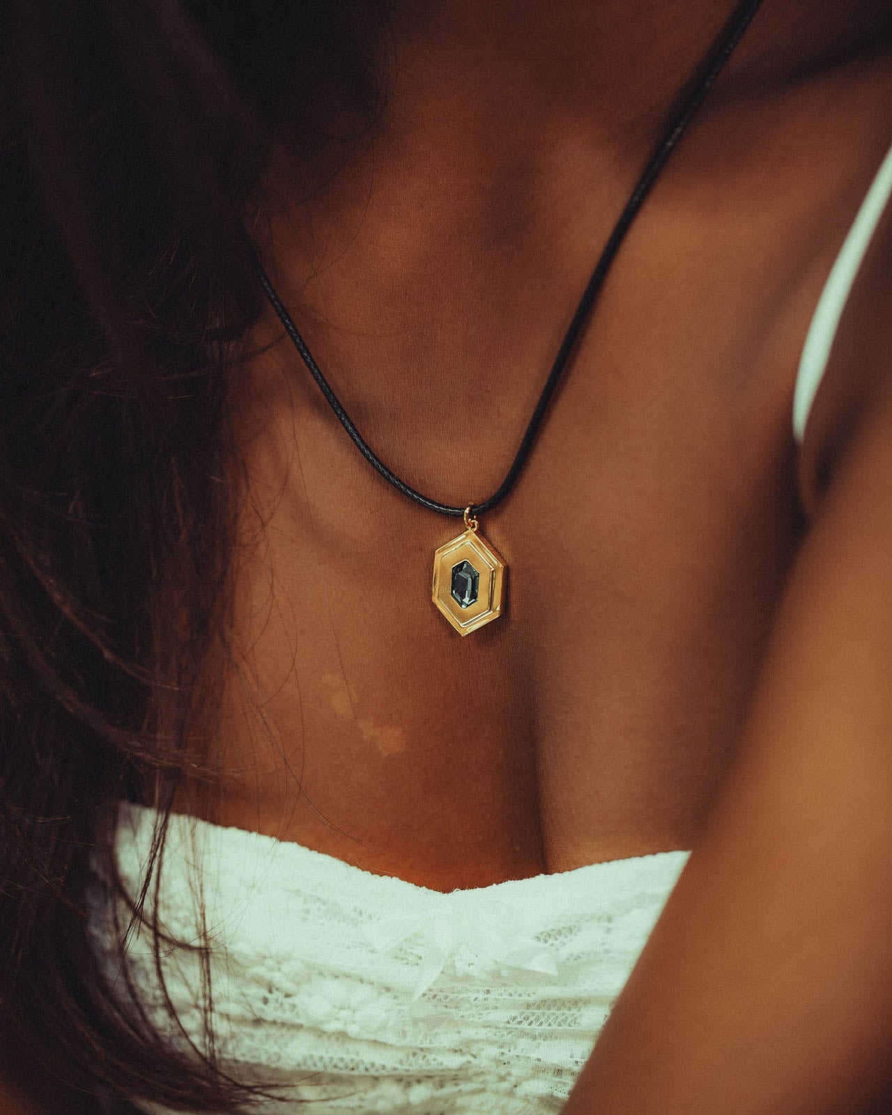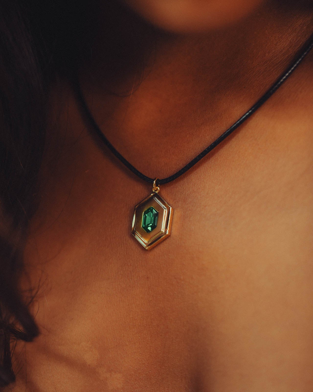 Dallas features a cotton wax cord with a luxurious gold pendant, featuring our signature emerald gemstones. This elegant piece effortlessly blends casual charm with timeless sophistication.