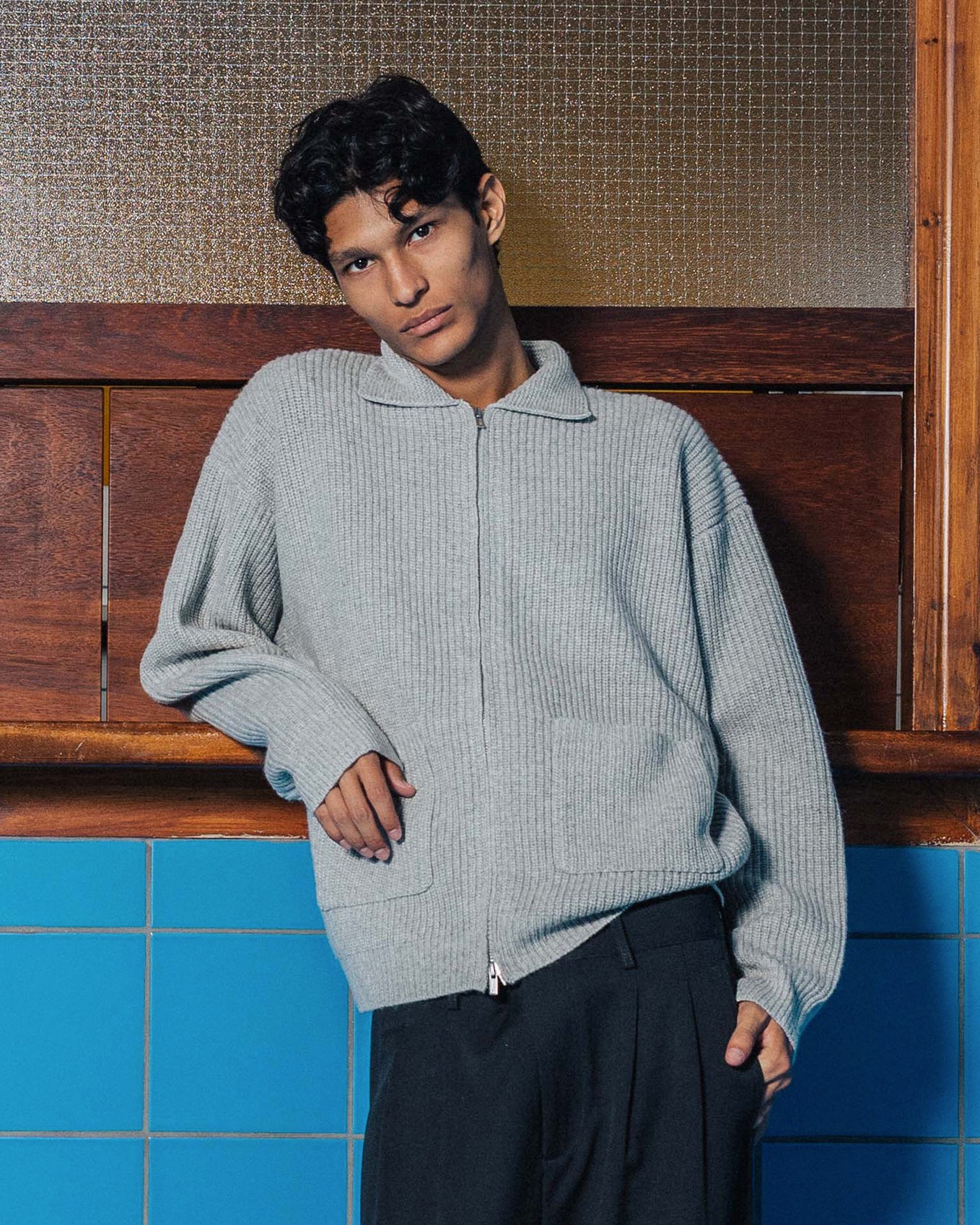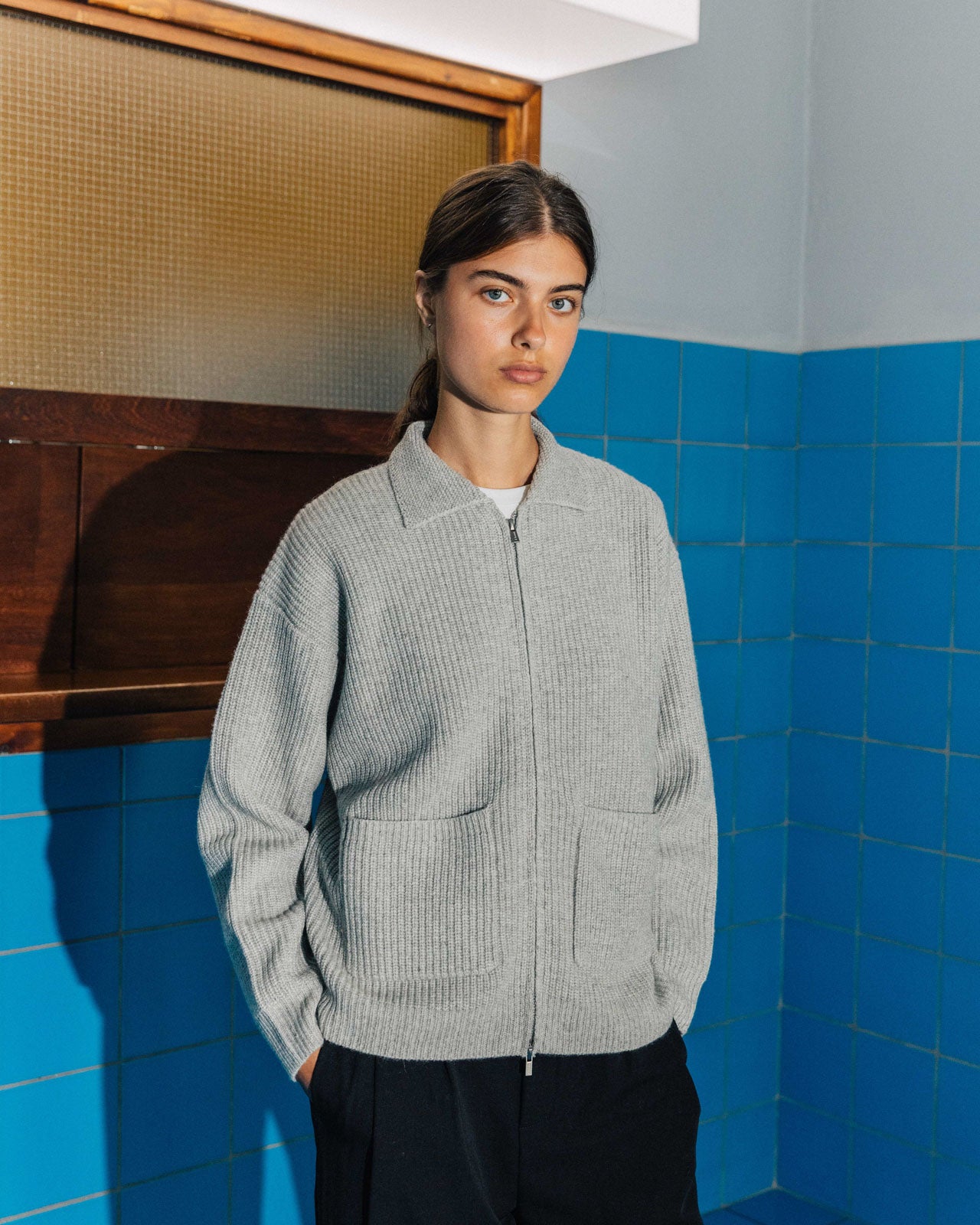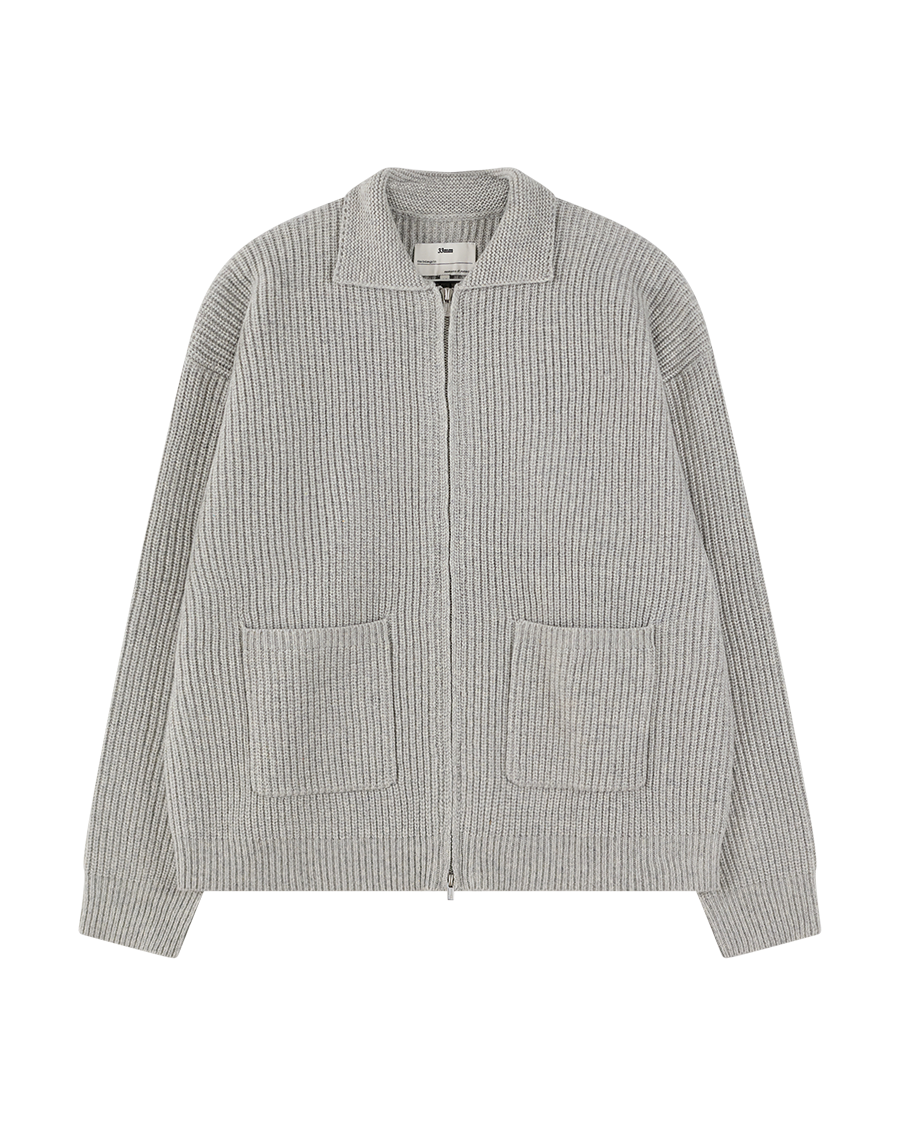A heavyweight knit zip-up with a flat-edged knit collar and front patch pockets. Adorned with double ended branded zips so you can layer and style it the way you want to.