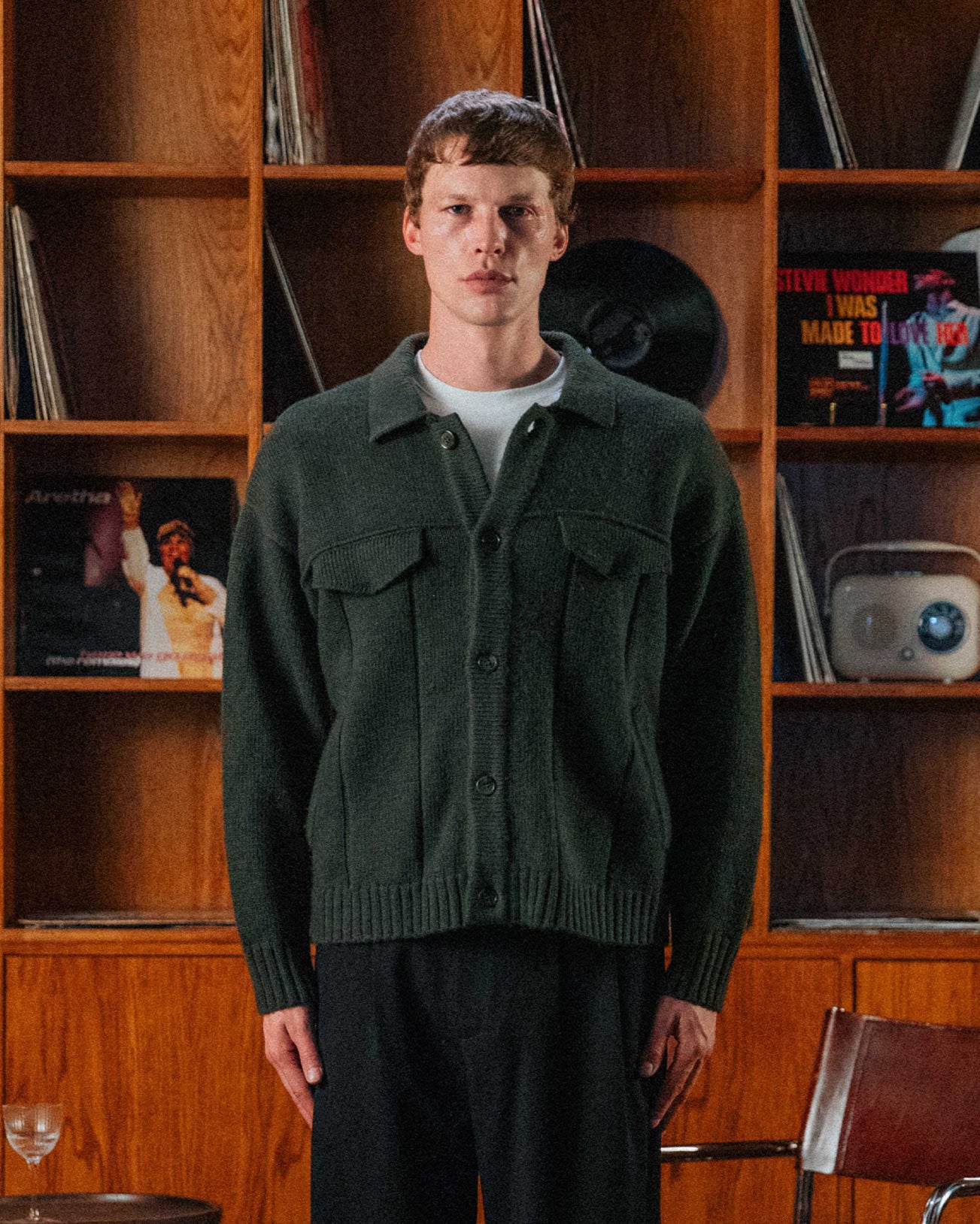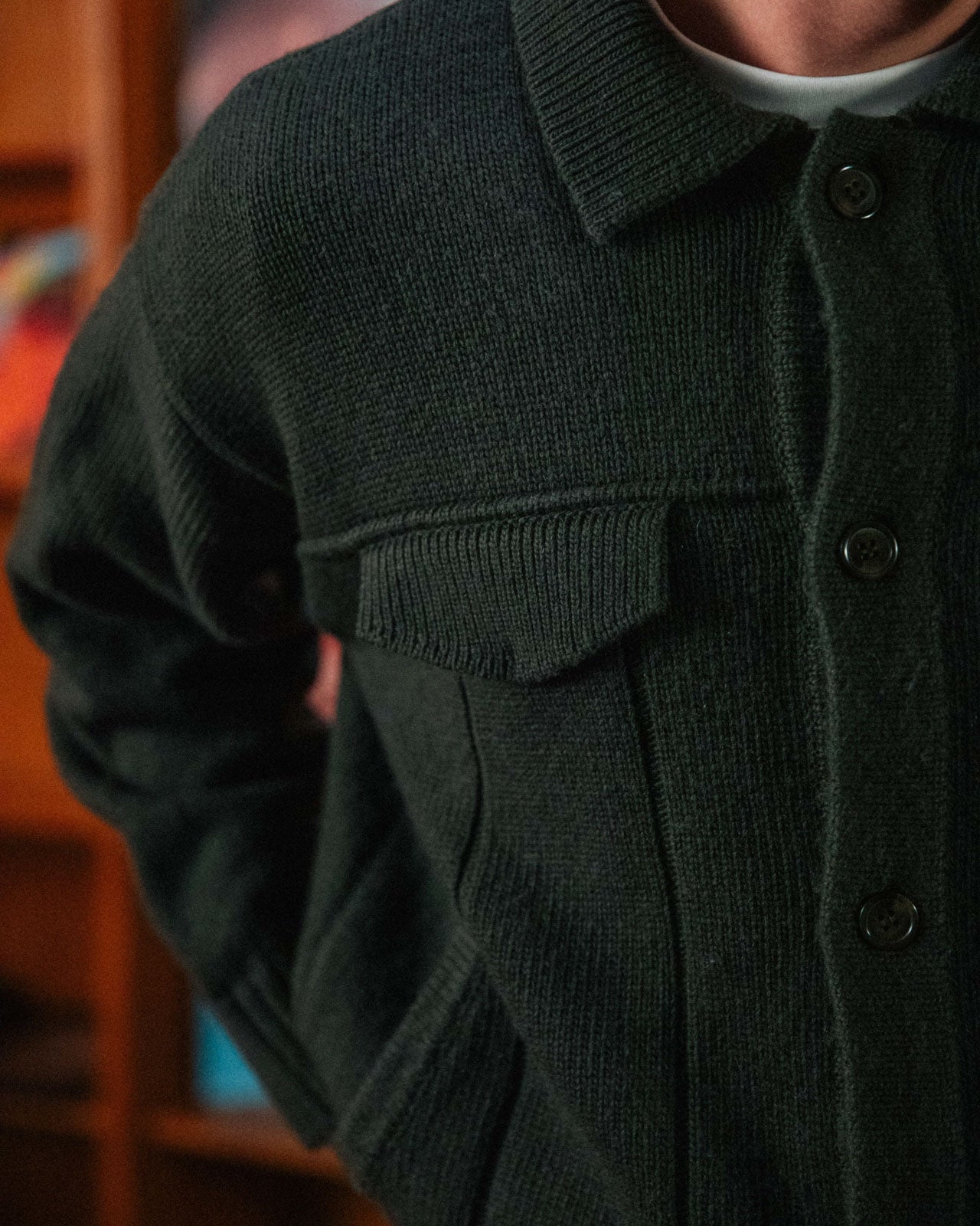 In a deep earthy green, Finley is a casual every day layer. It features two chest patch pockets, but it's the piped seams and front panel details that give it its vintage knitwear charm.