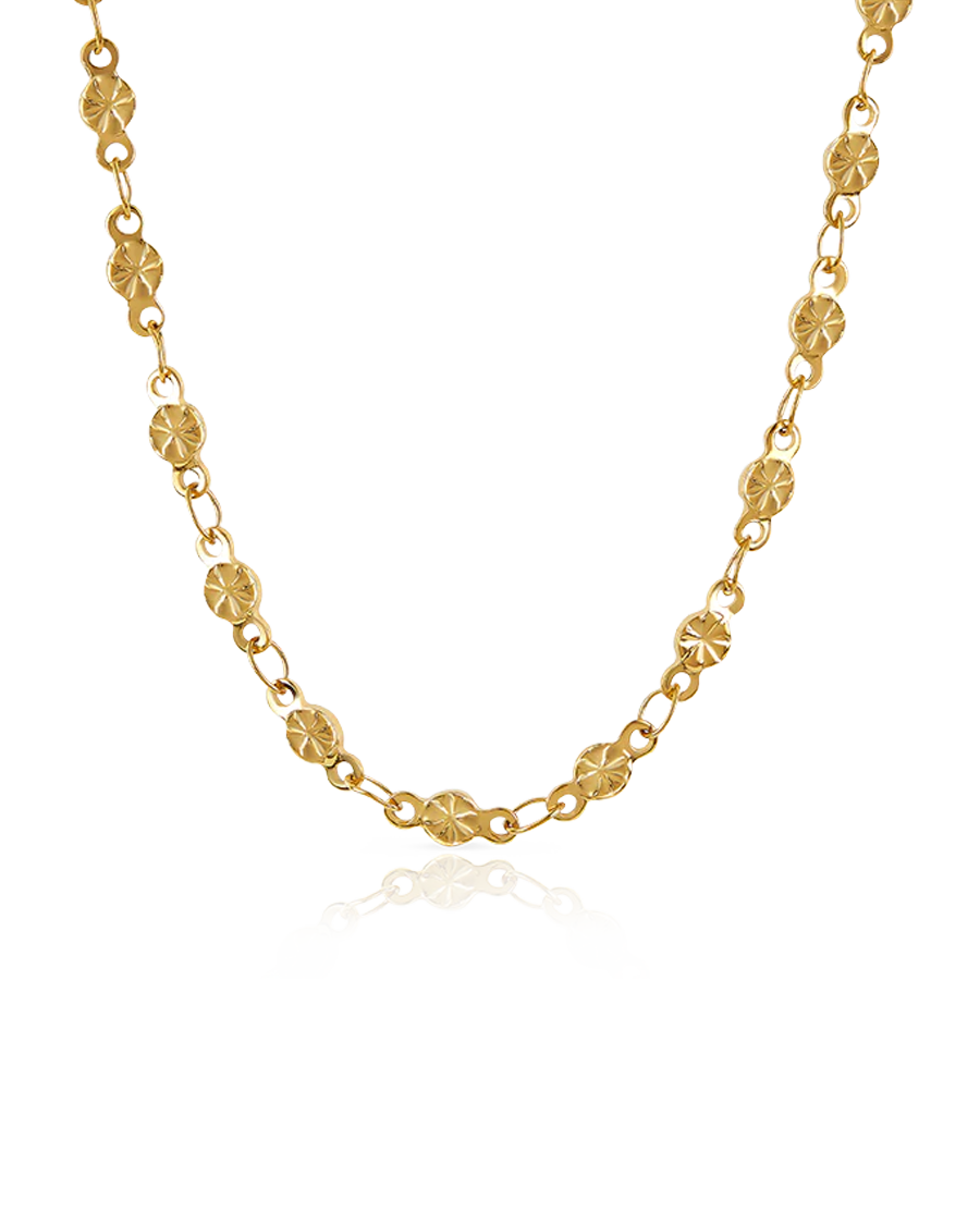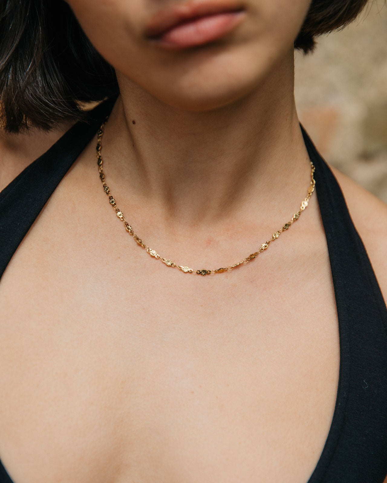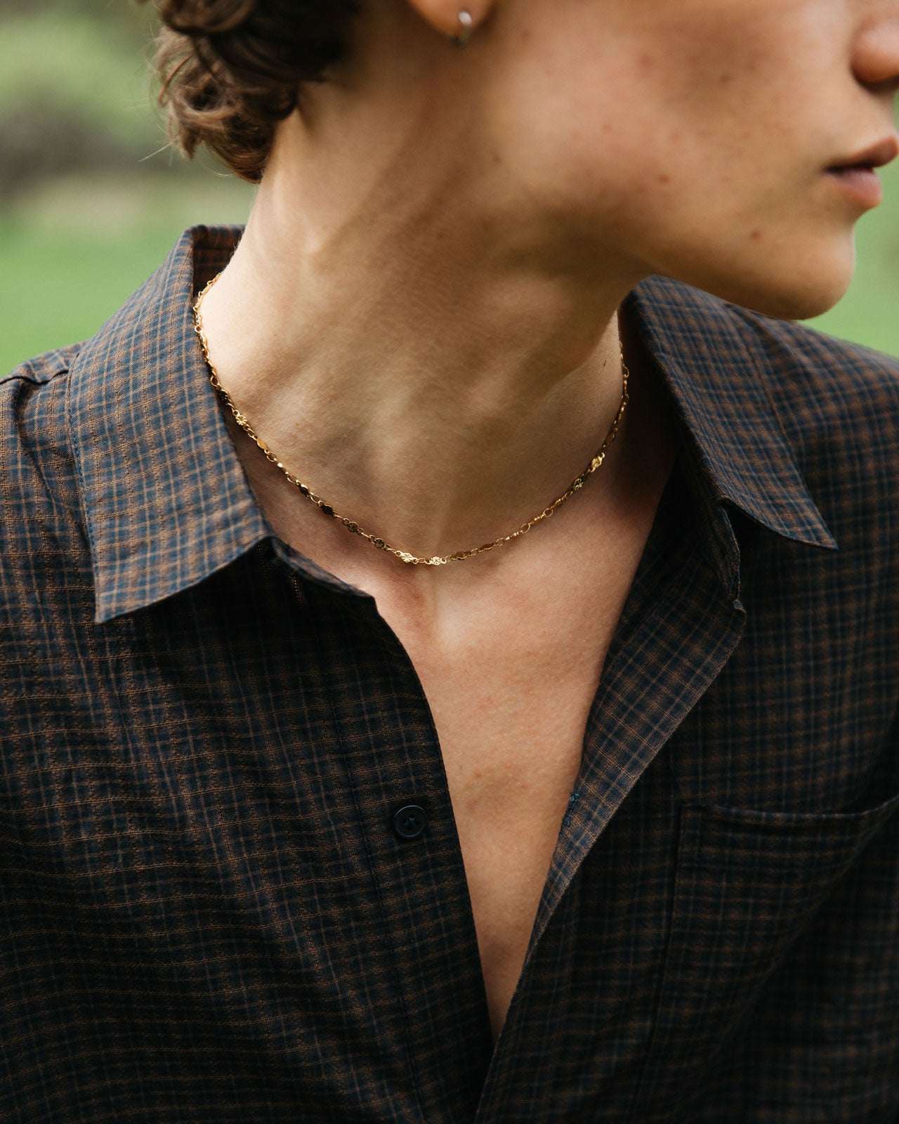 A delicate chain that gets to watch the world from your collar. With intricate chain detailing and some sparkle for extra impact.