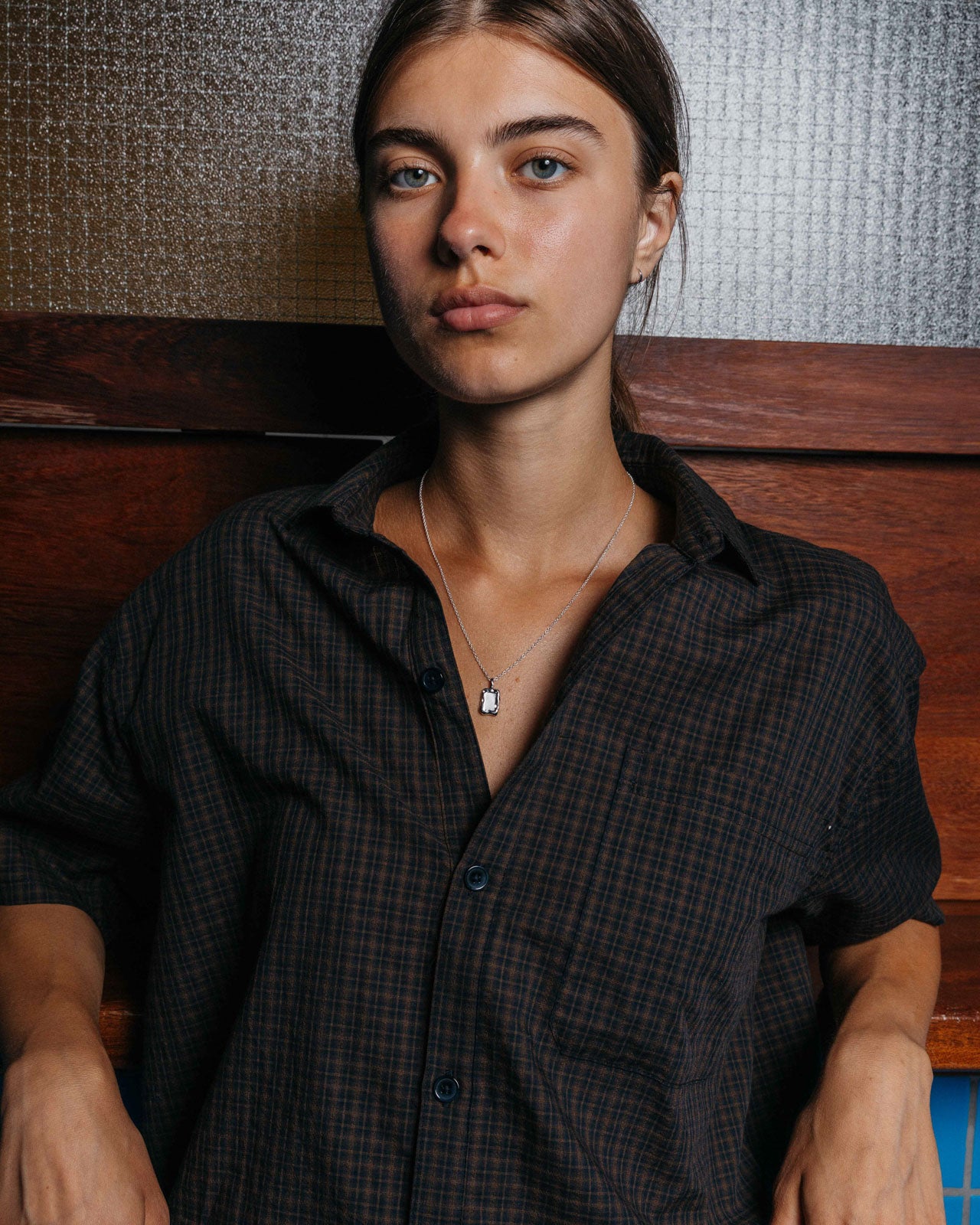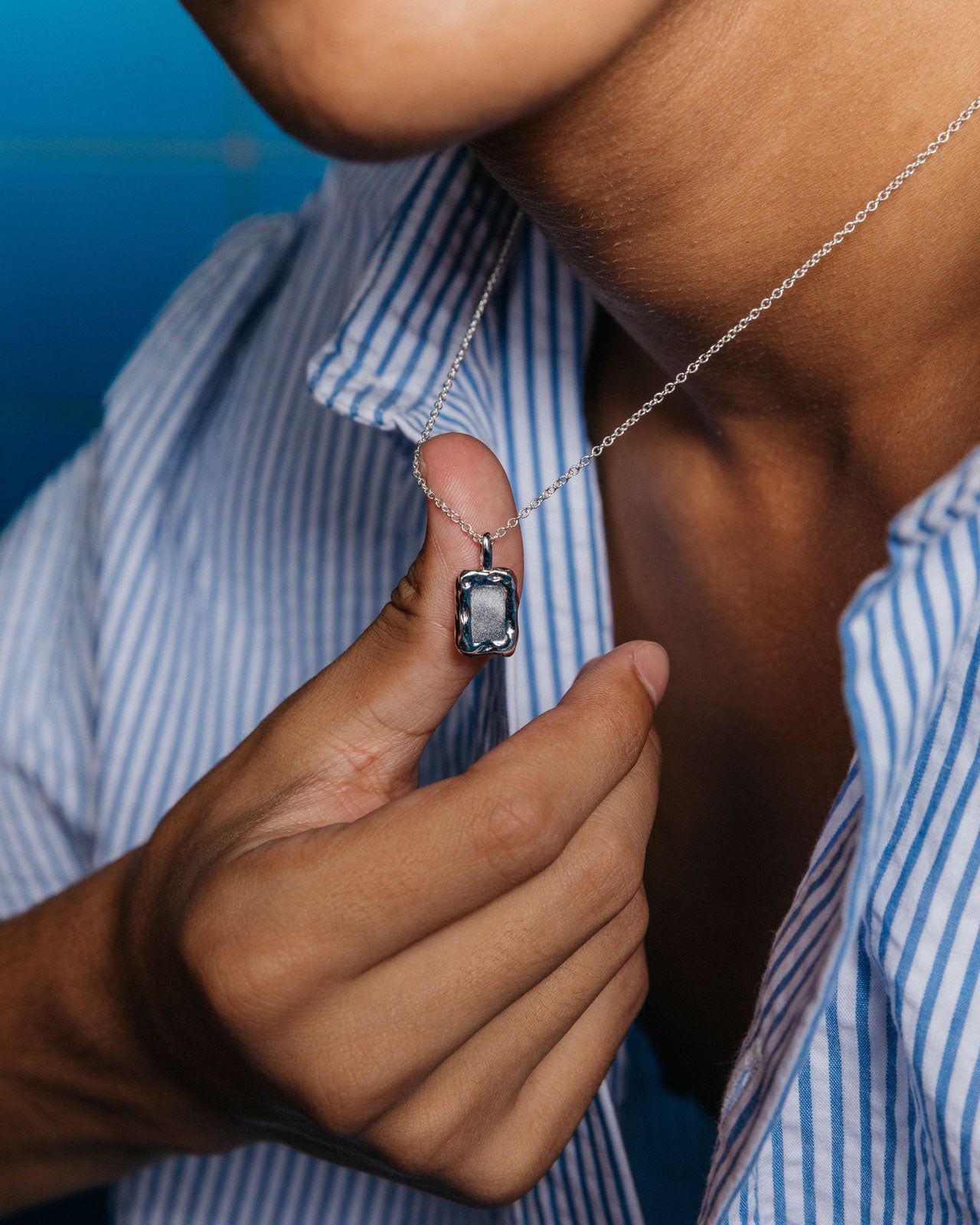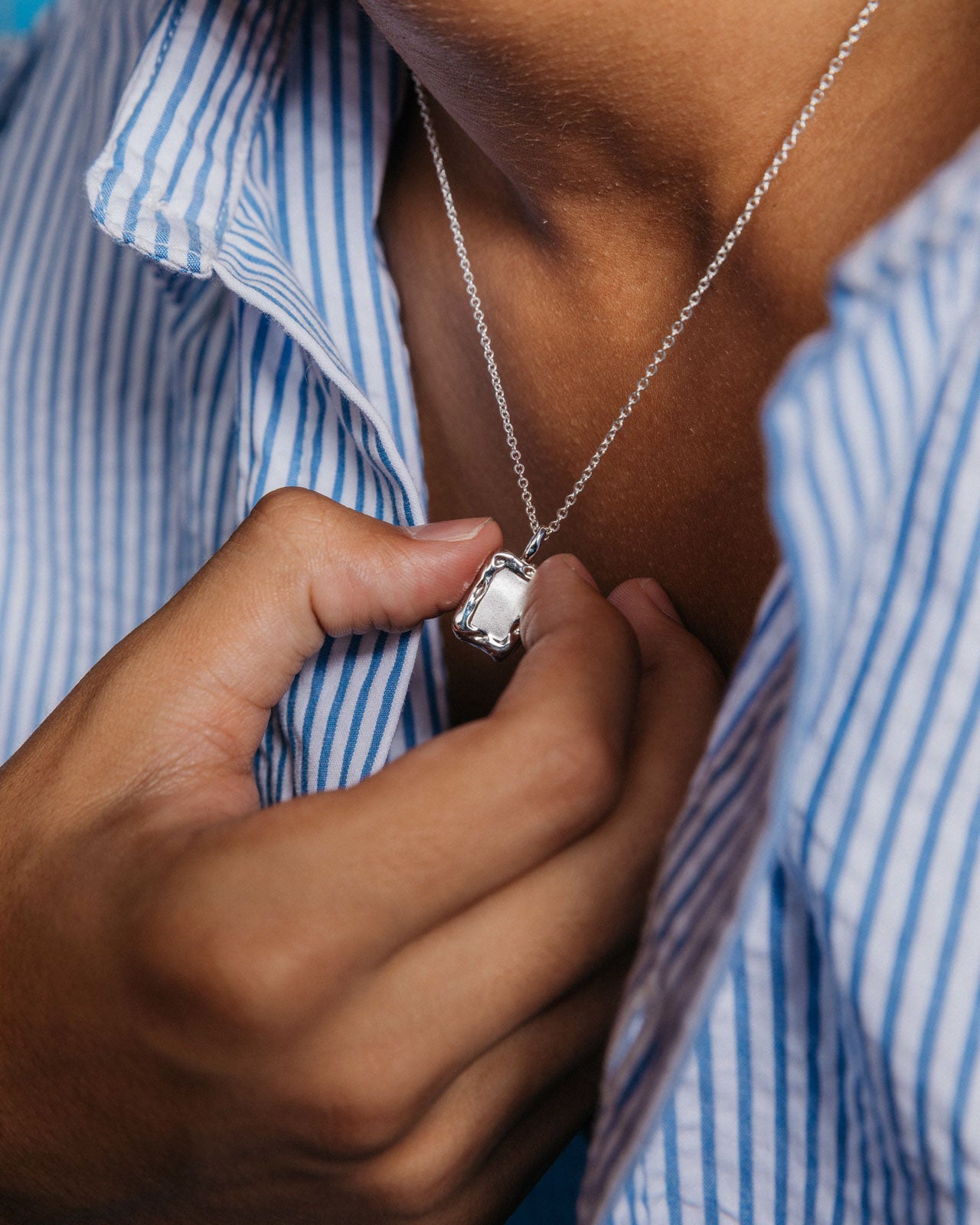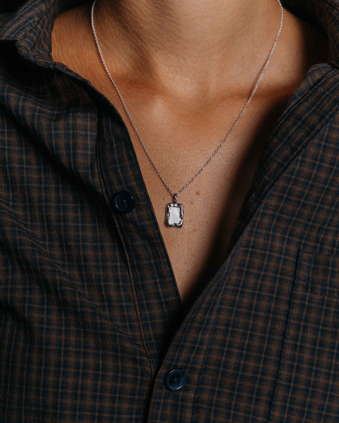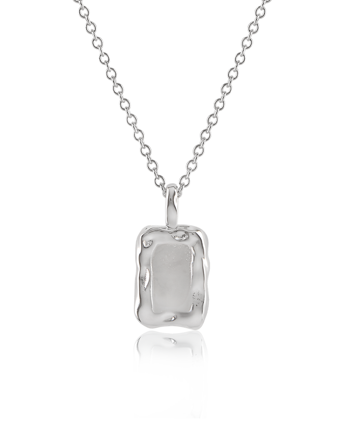 Minimalist rectangular pendant with a molten frame and matte-finished centre. Crafted from Sterling Silver for a lasting shine, and completed by a delicate curb chain.