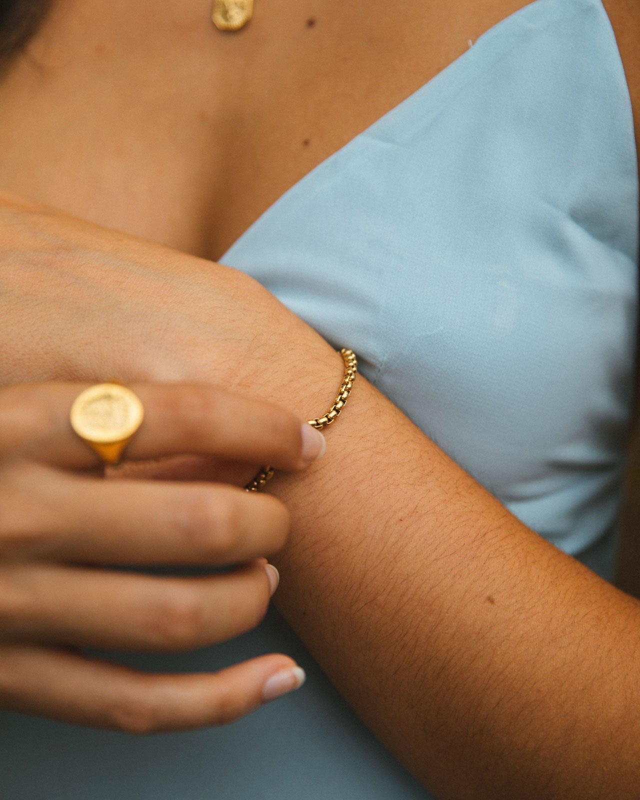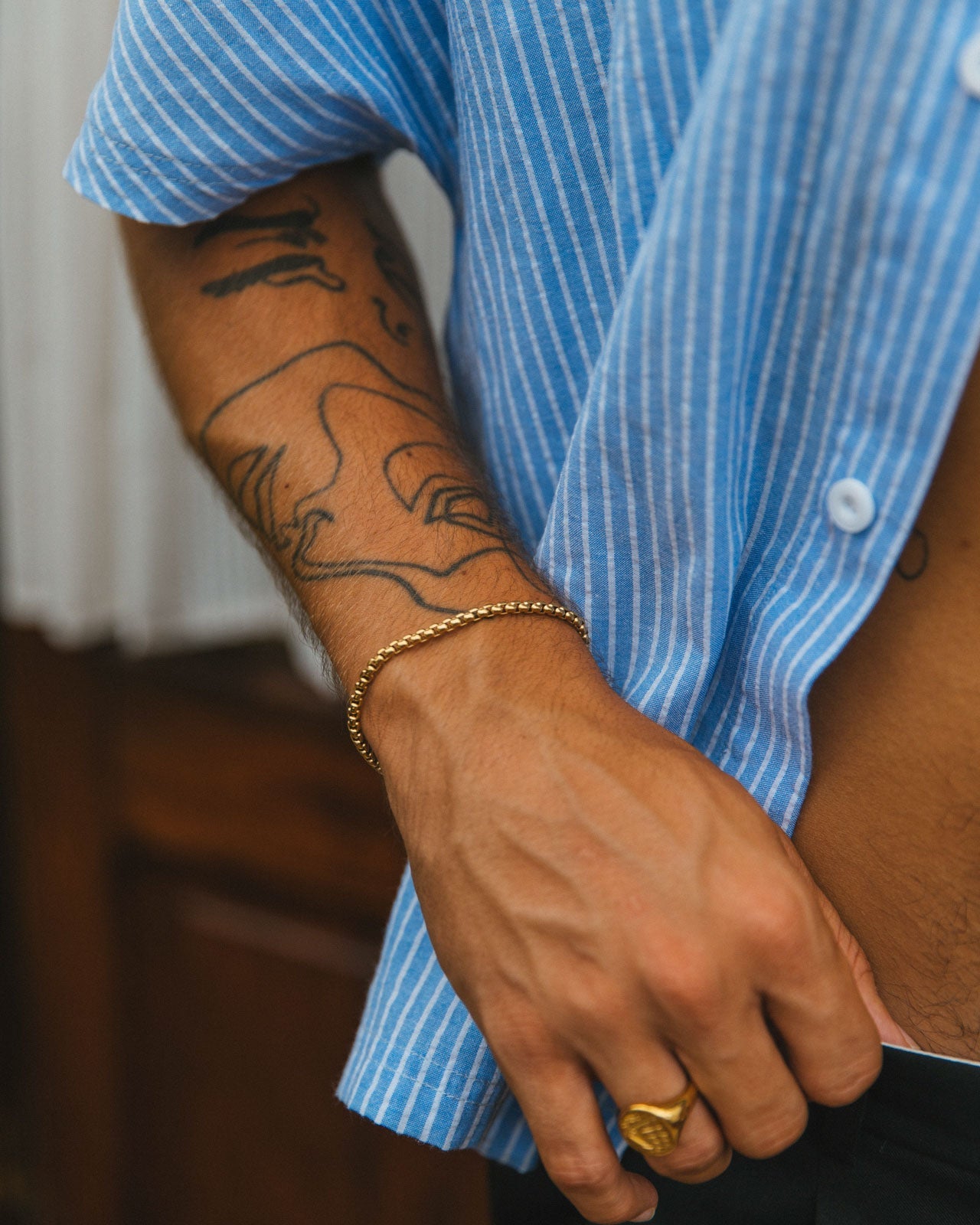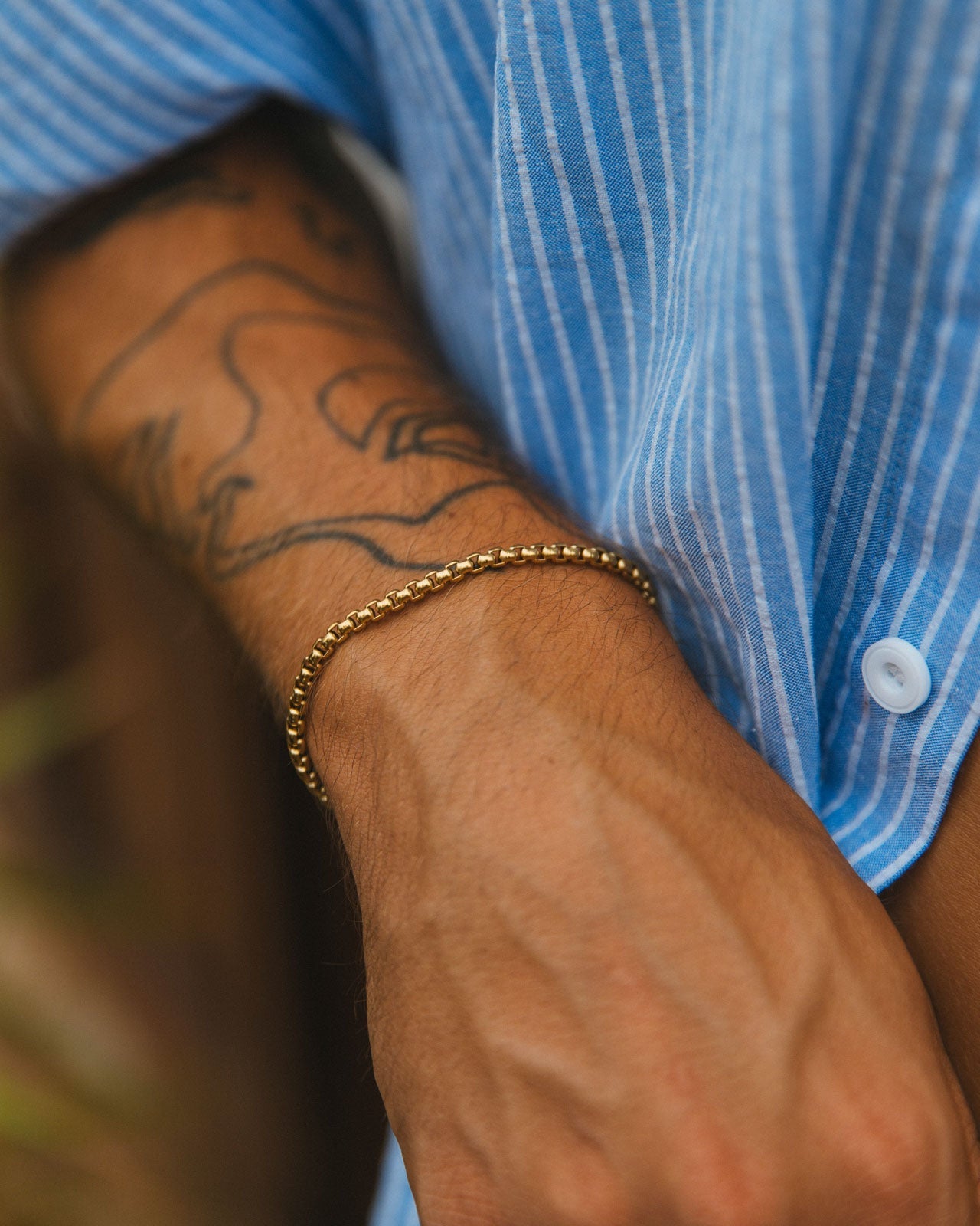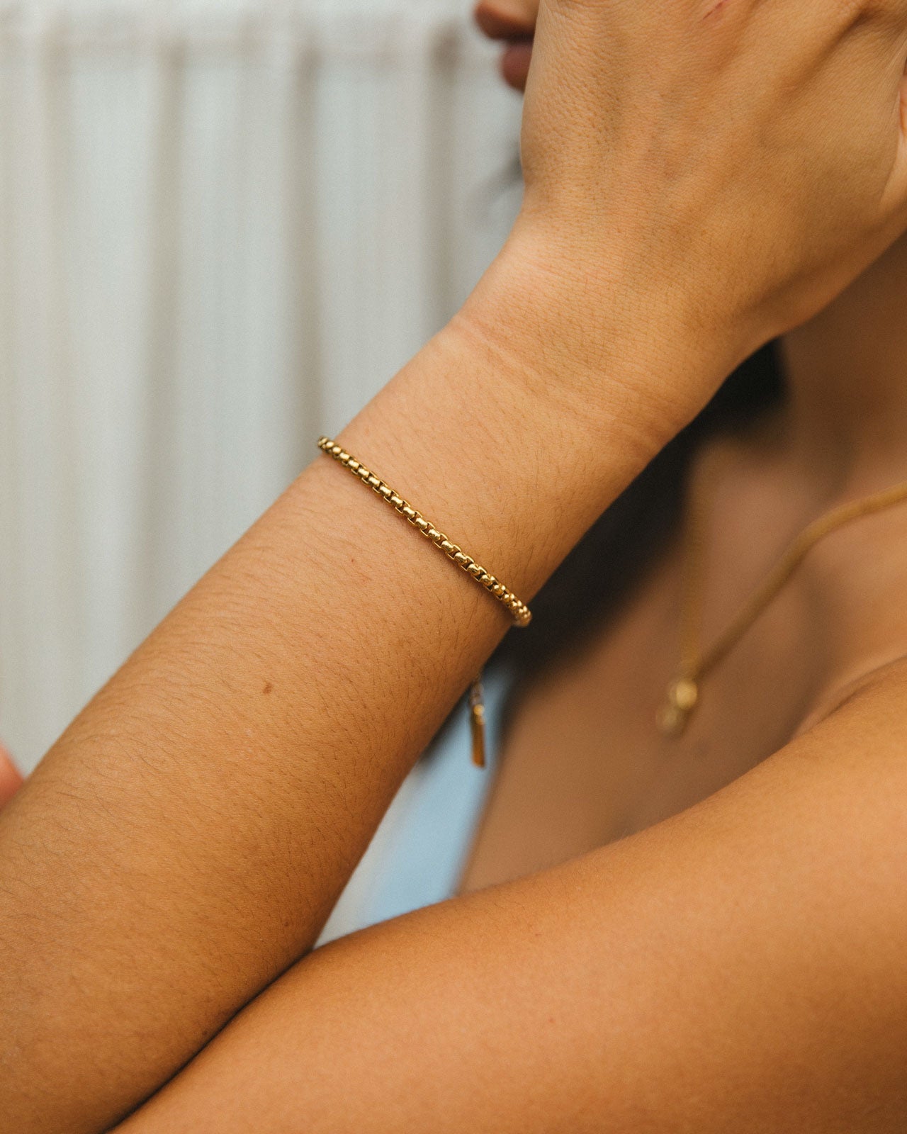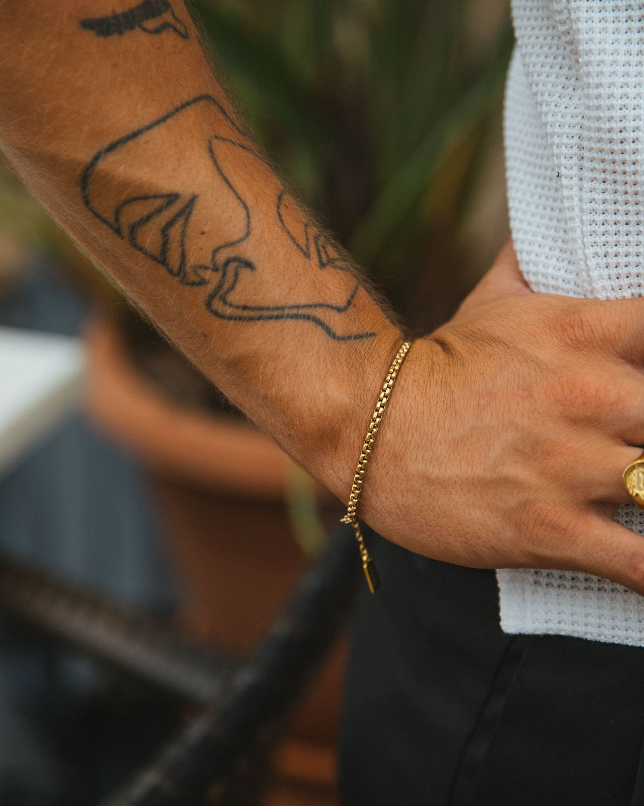 Jaxon, the bracelet you didn't know you needed. Its sleek, simple design making it the perfect everyday bracelet. Featuring an extension chain for adjustability and our signature 33mm logo tag. Made with 14k gold PVD plated stainless steel, it's waterproof and tarnish-free, so it will stay beautiful wear after wear.