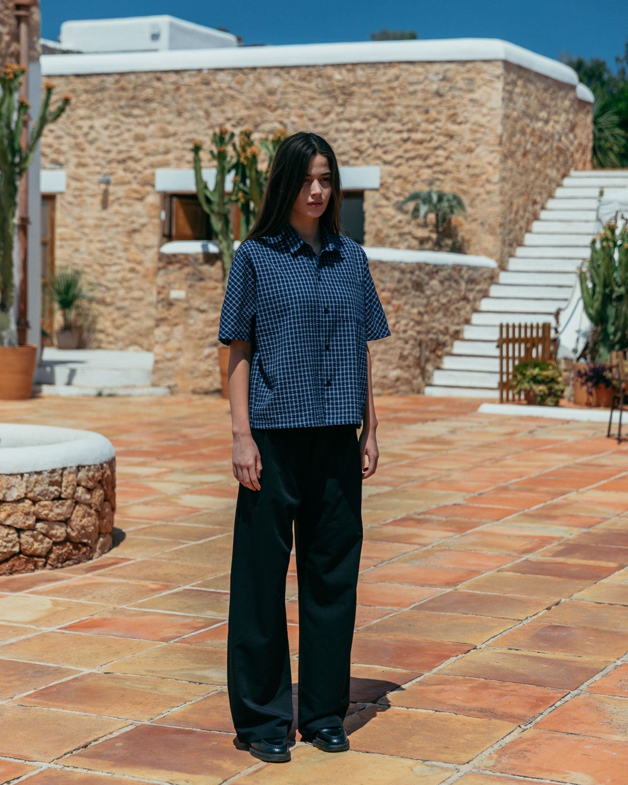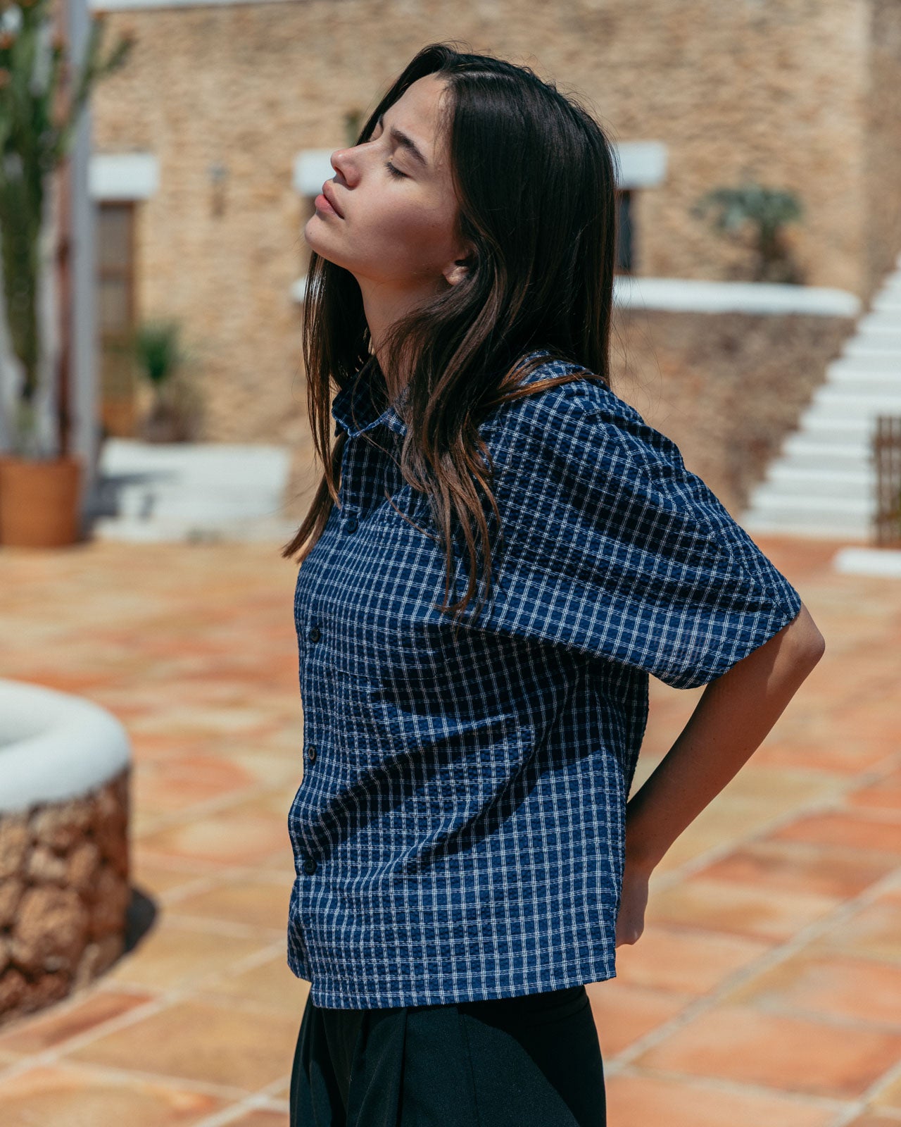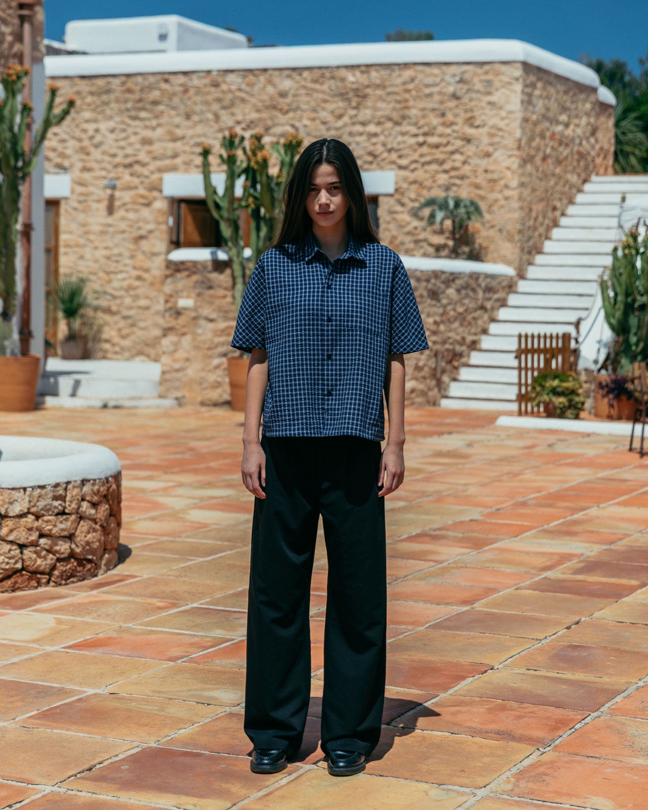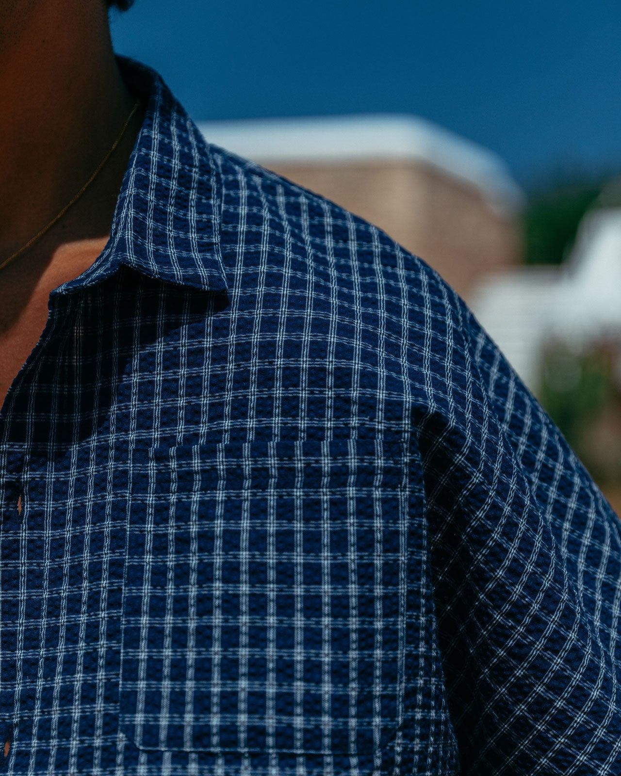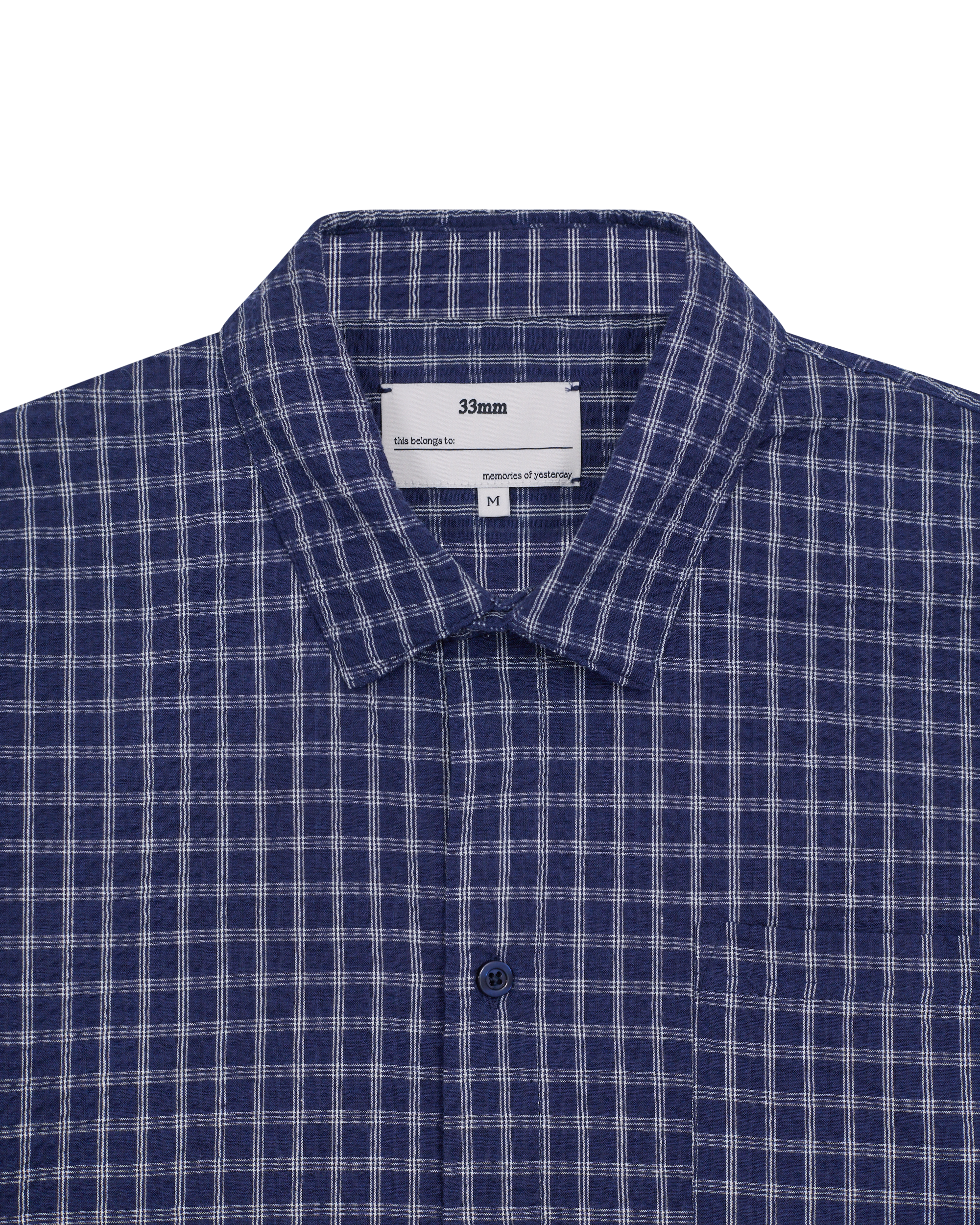 Our signature boxy fit, with a deep blue base and white check. Made from a raglan texture to add detail and reinforce structure.