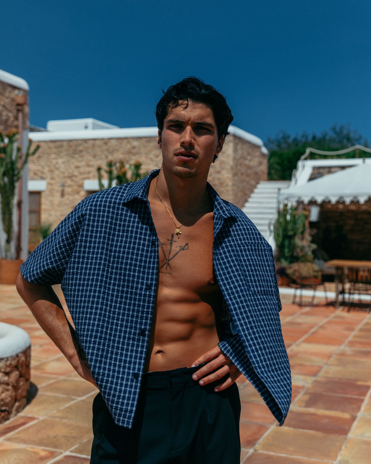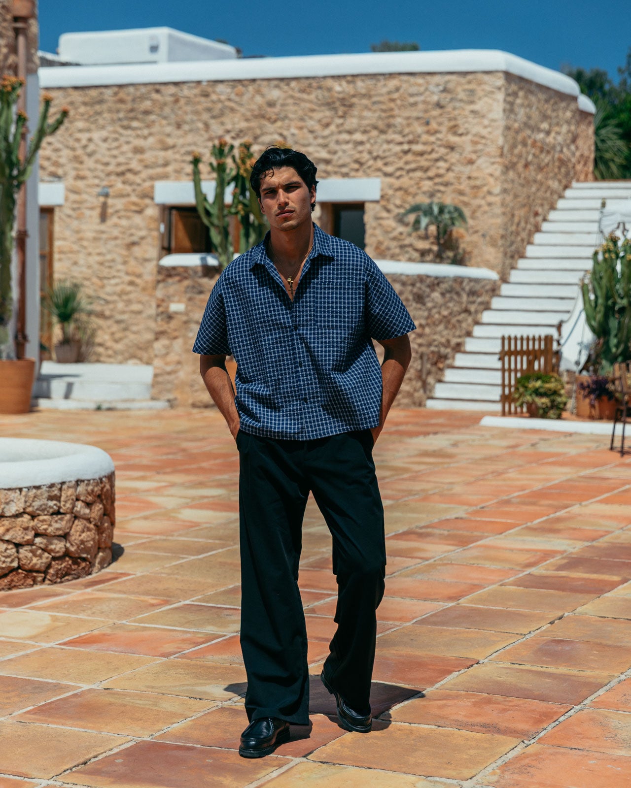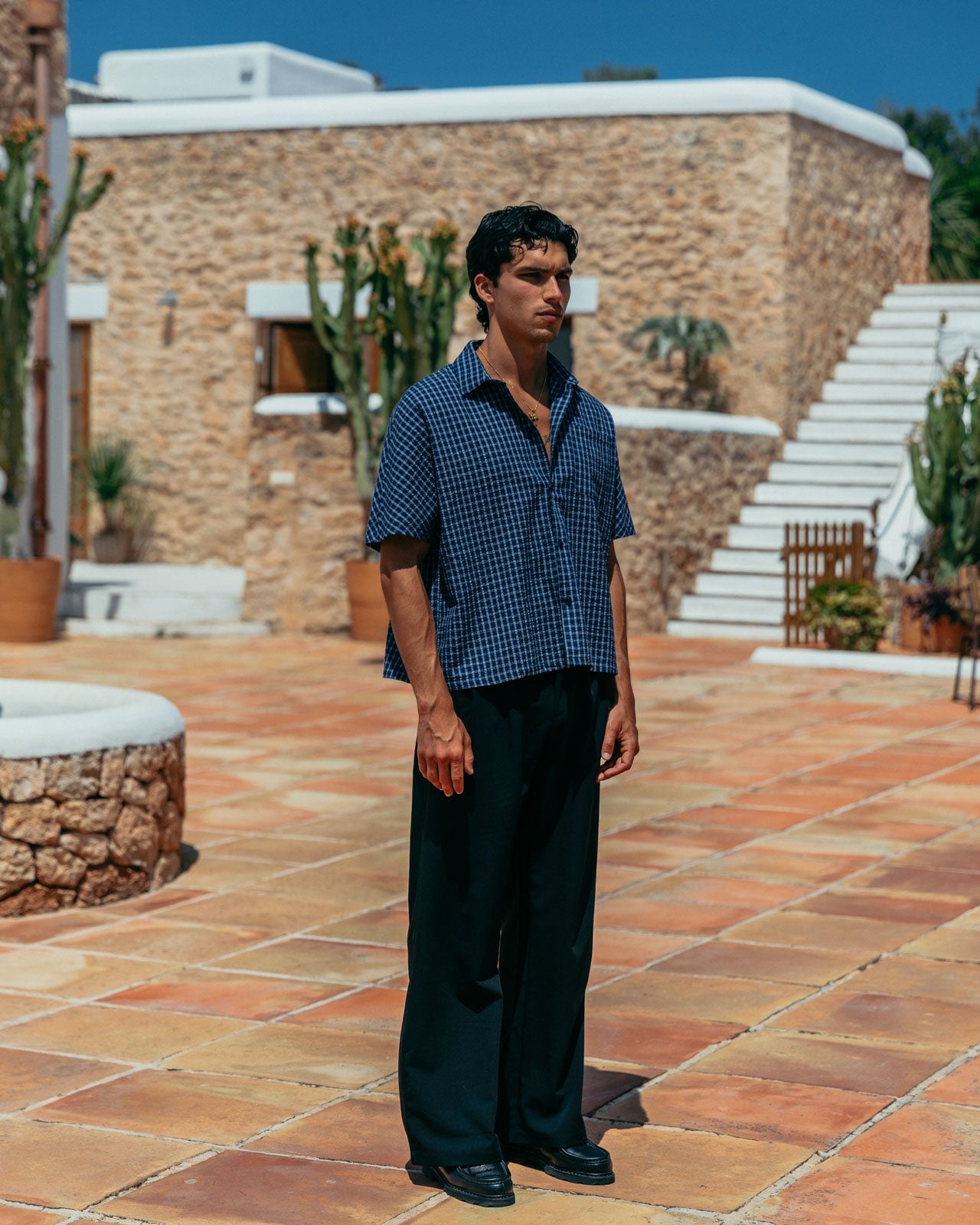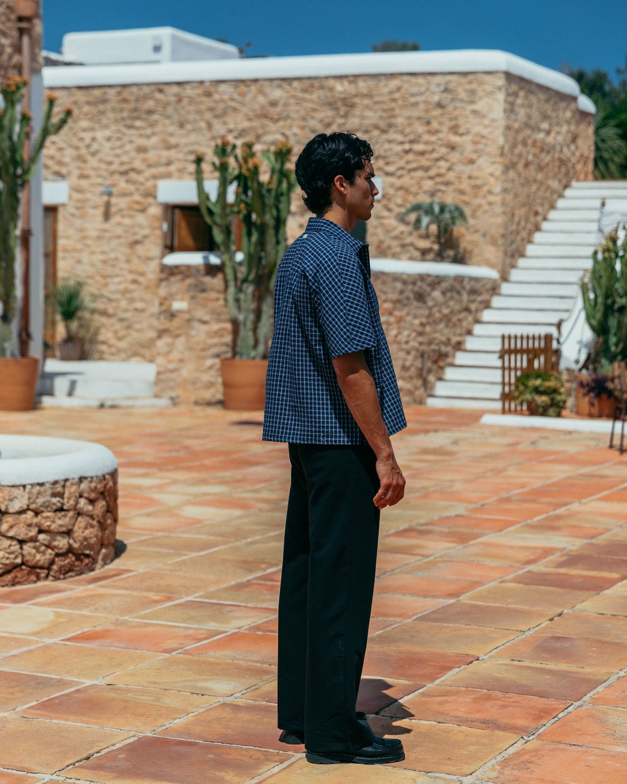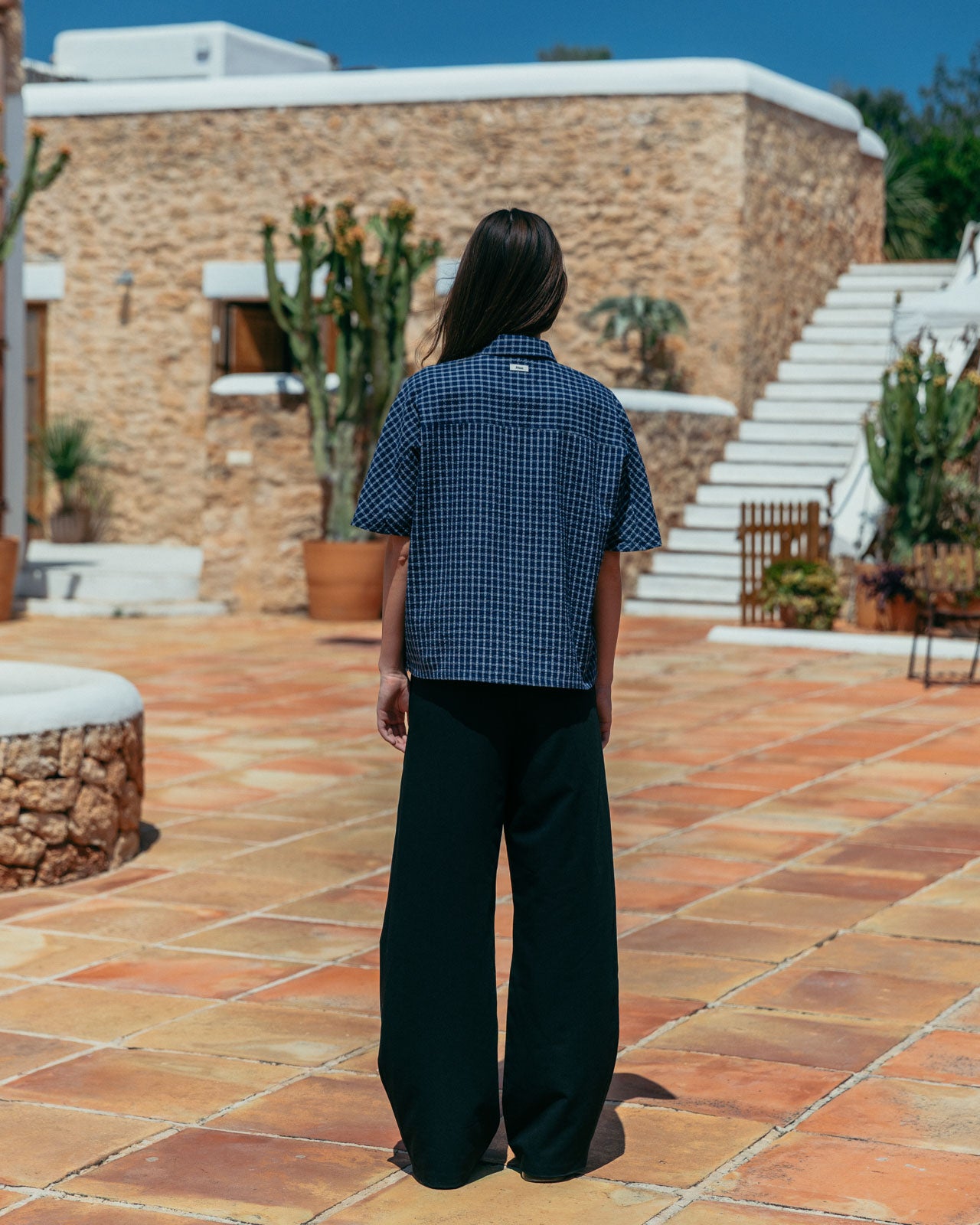 Our signature boxy fit, with a deep blue base and white check. Made from a raglan texture to add detail and reinforce structure.