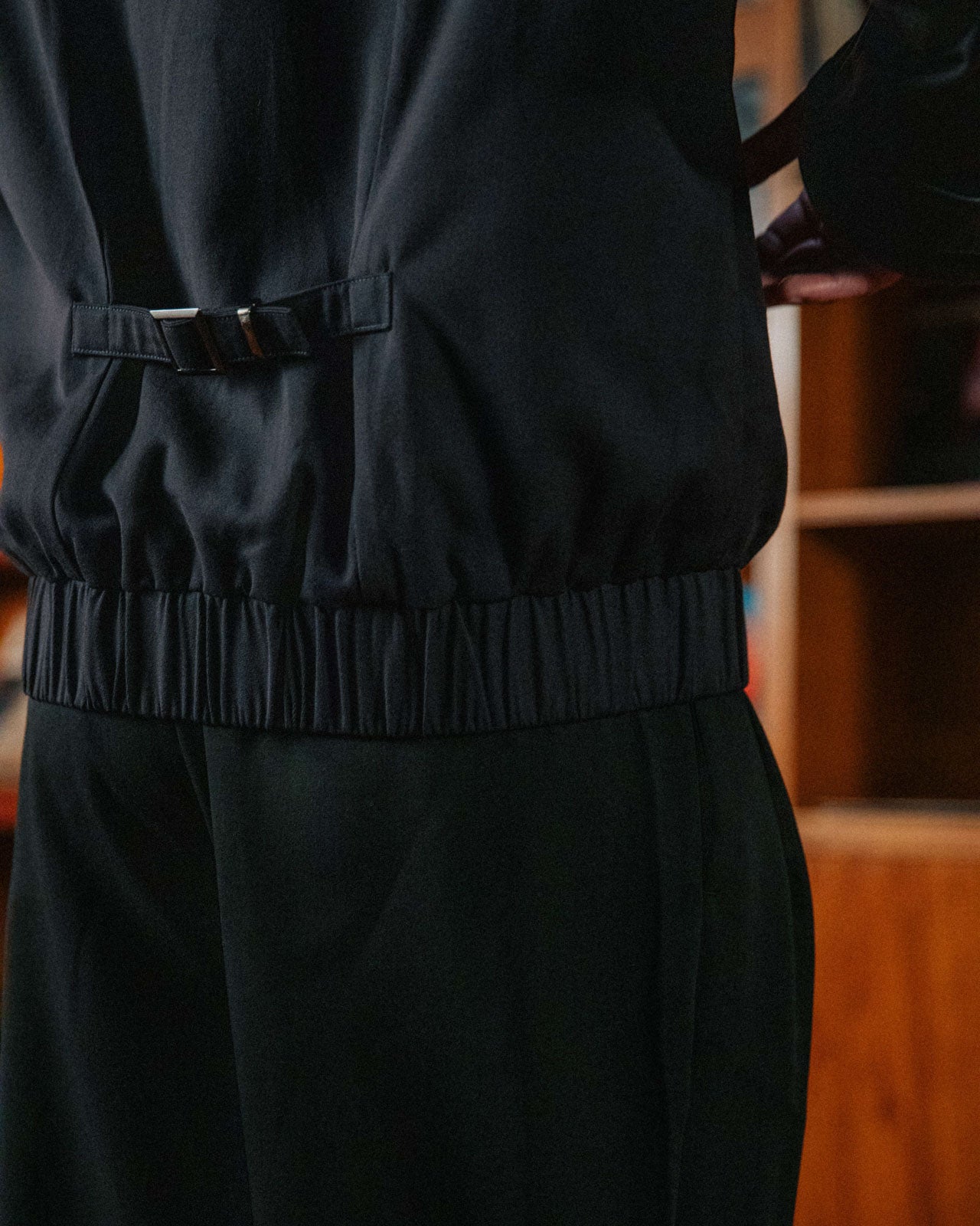 The jacket you wear to share gabagool with Tony Soprano. A high-neck track jacket with raglan sleeves, elevated by custom hardware and an adjustable waist buckle. Wear it unzipped to reveal the blue check lining. In homage to Alain Delon’s look in 'Once a Thief' (1965).