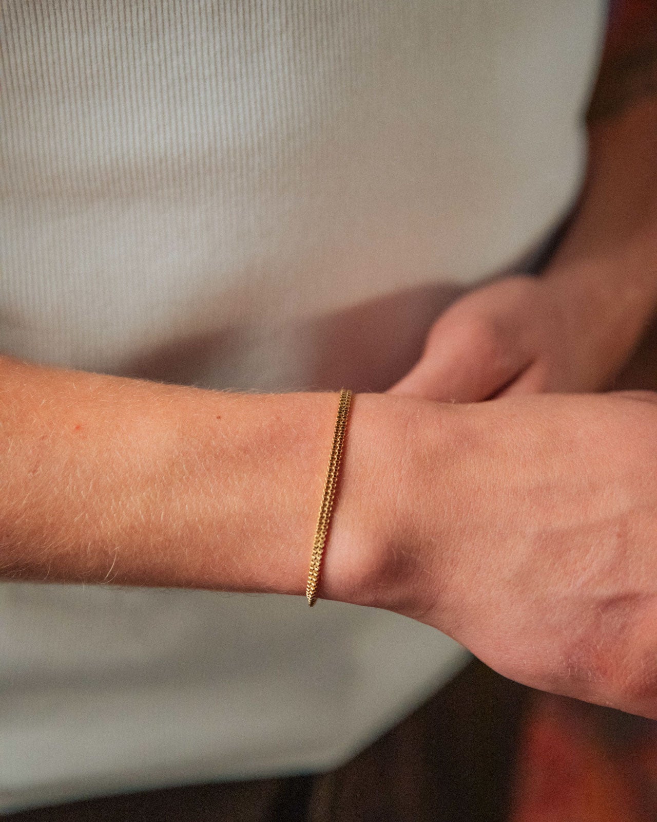 A double box chain bracelet that proves gentle is powerful. This fluid chain rests naturally, making it perfect for every day wear.