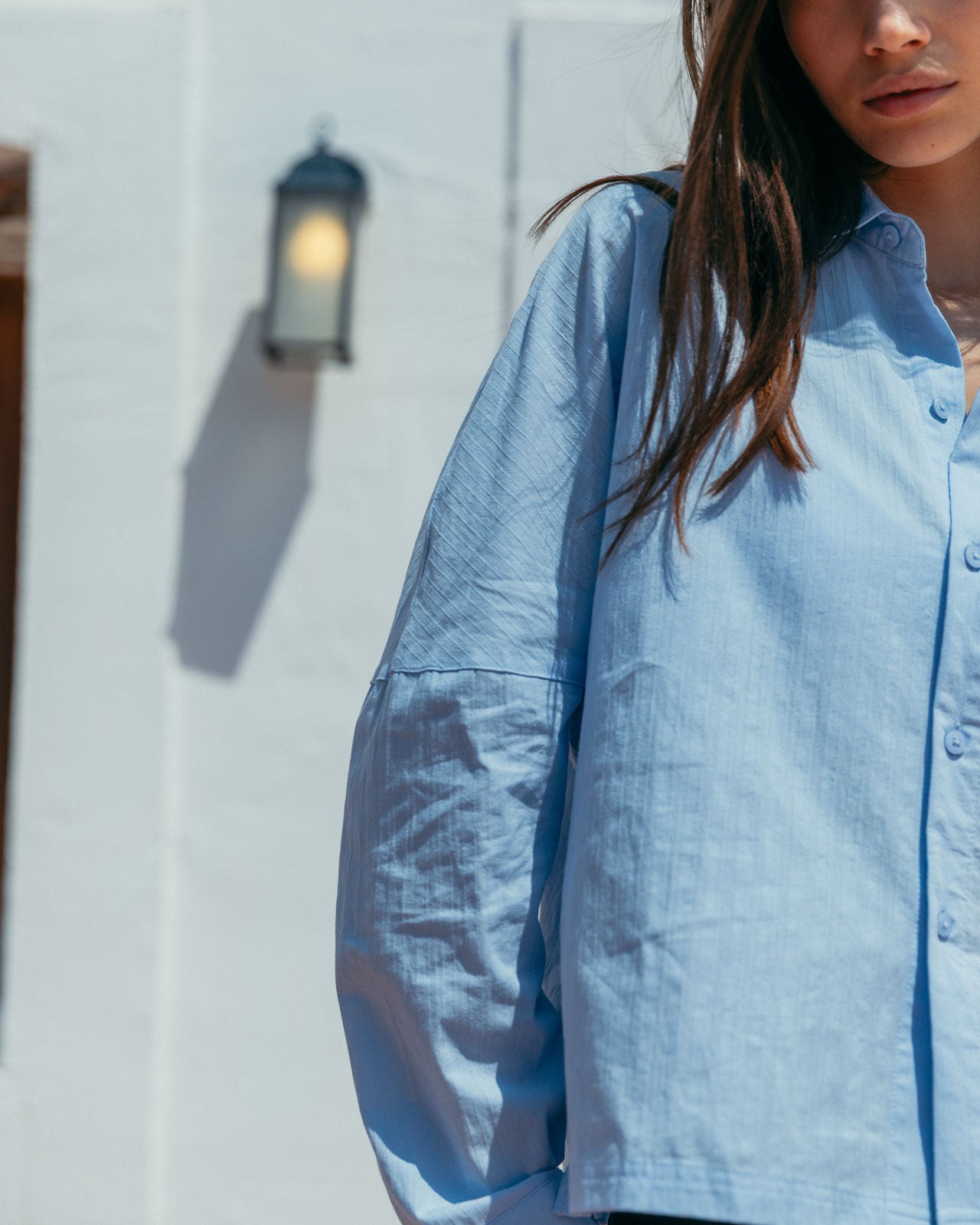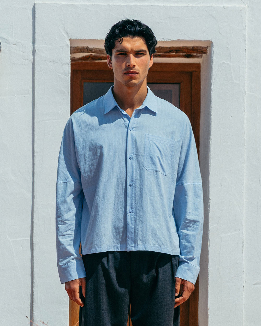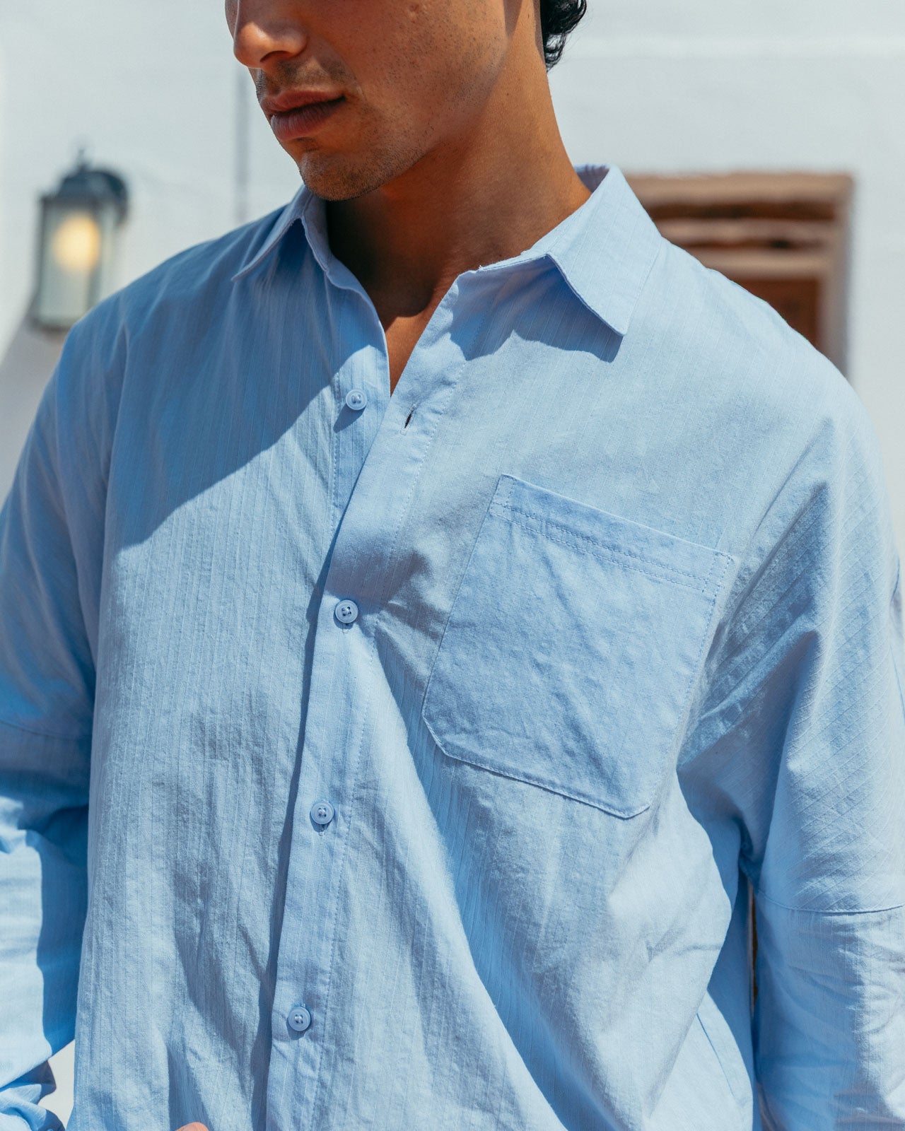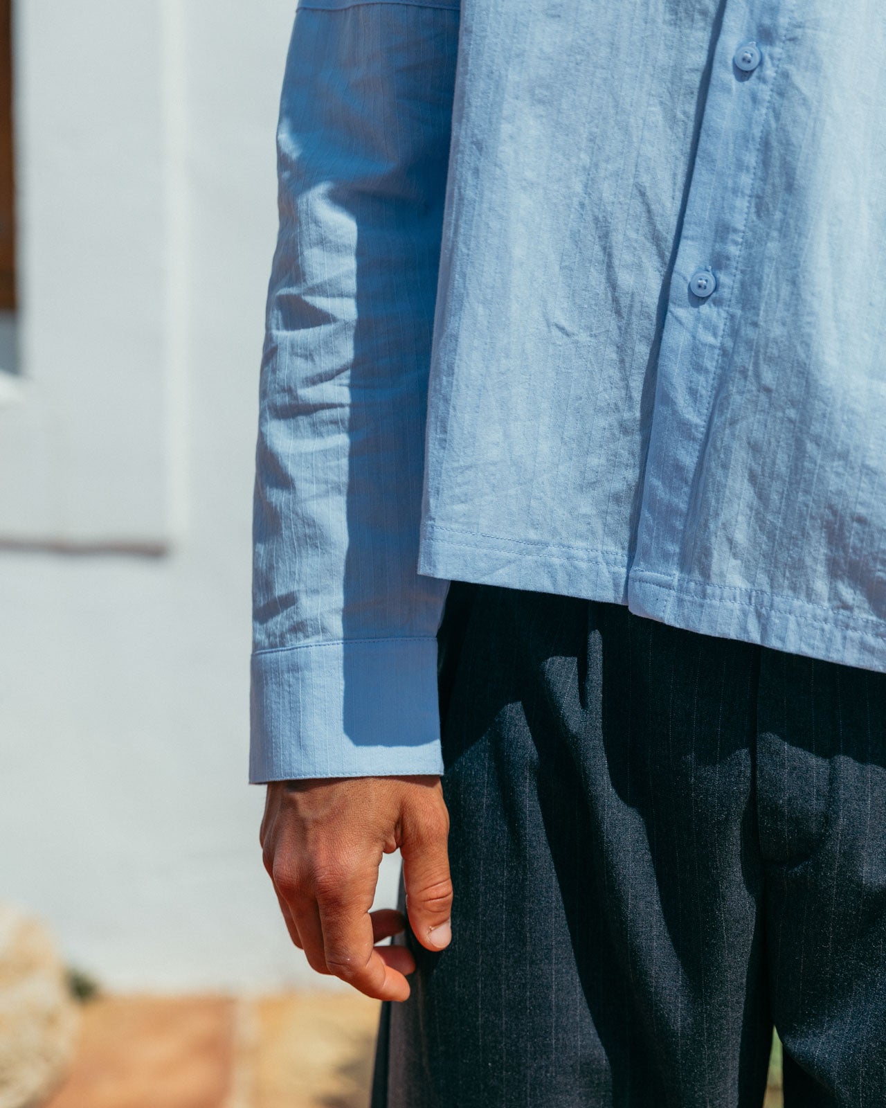 The shade of blue we want to see all summer. Its subtle striped texture and drop shoulder details give Lawrence modern classic status.