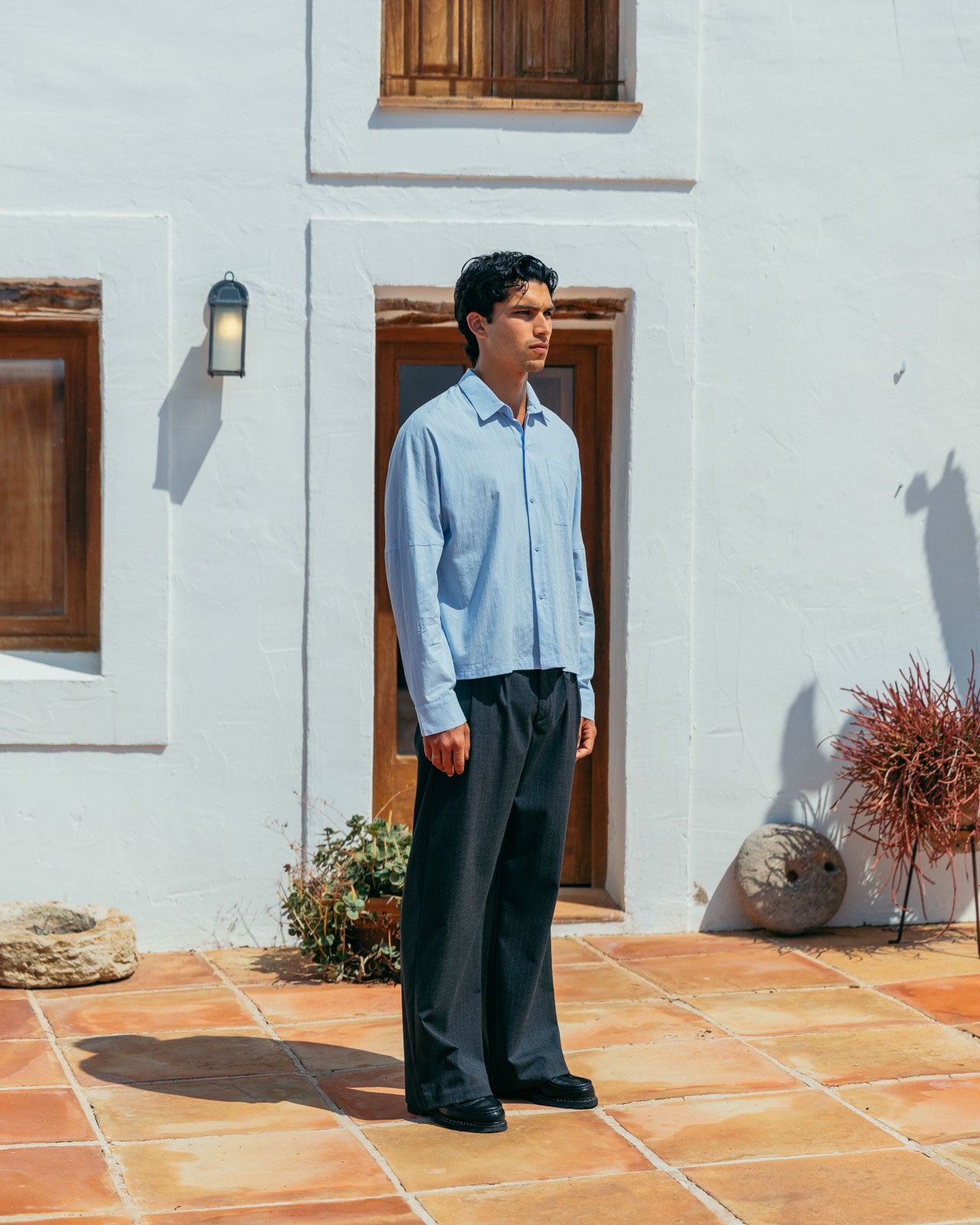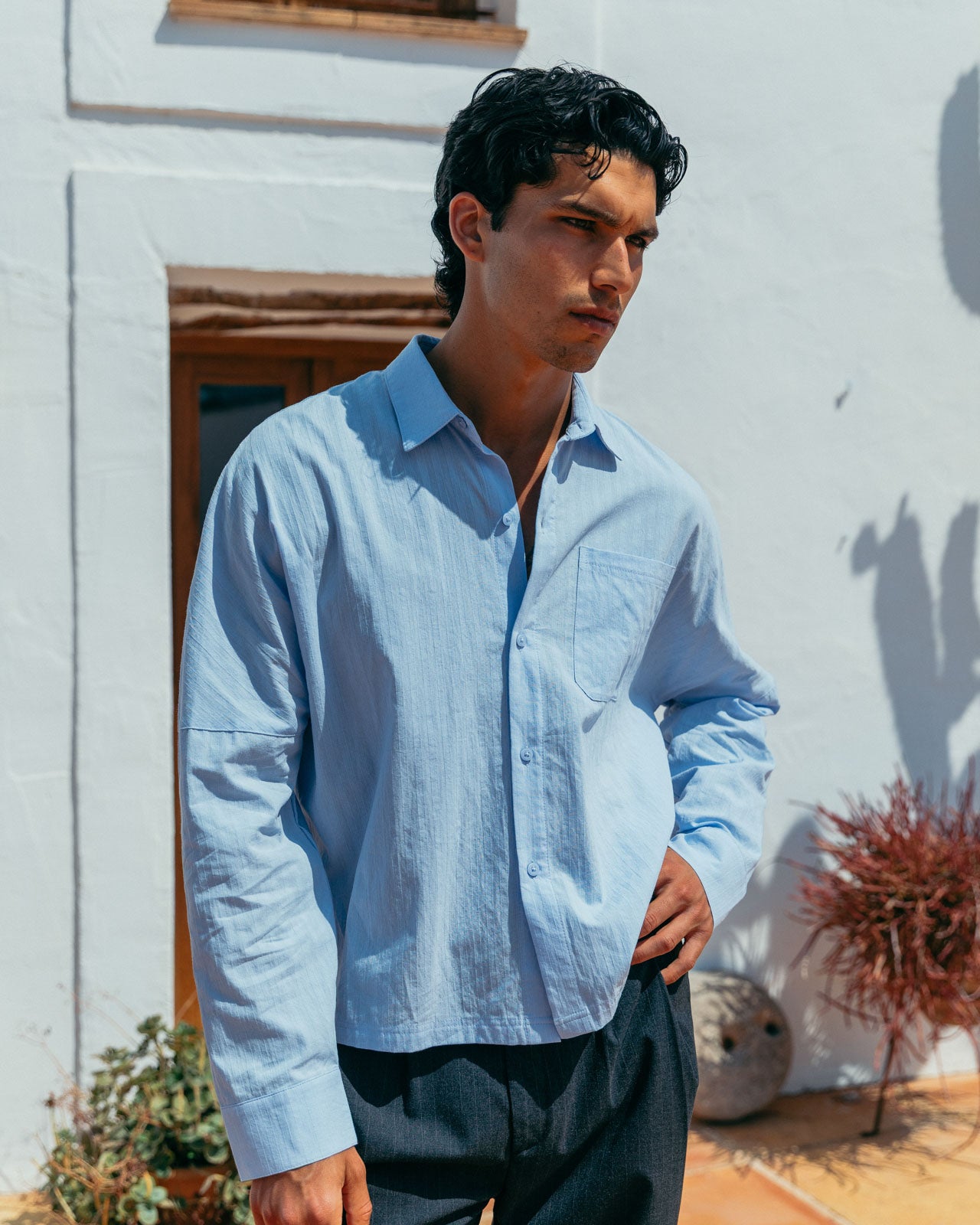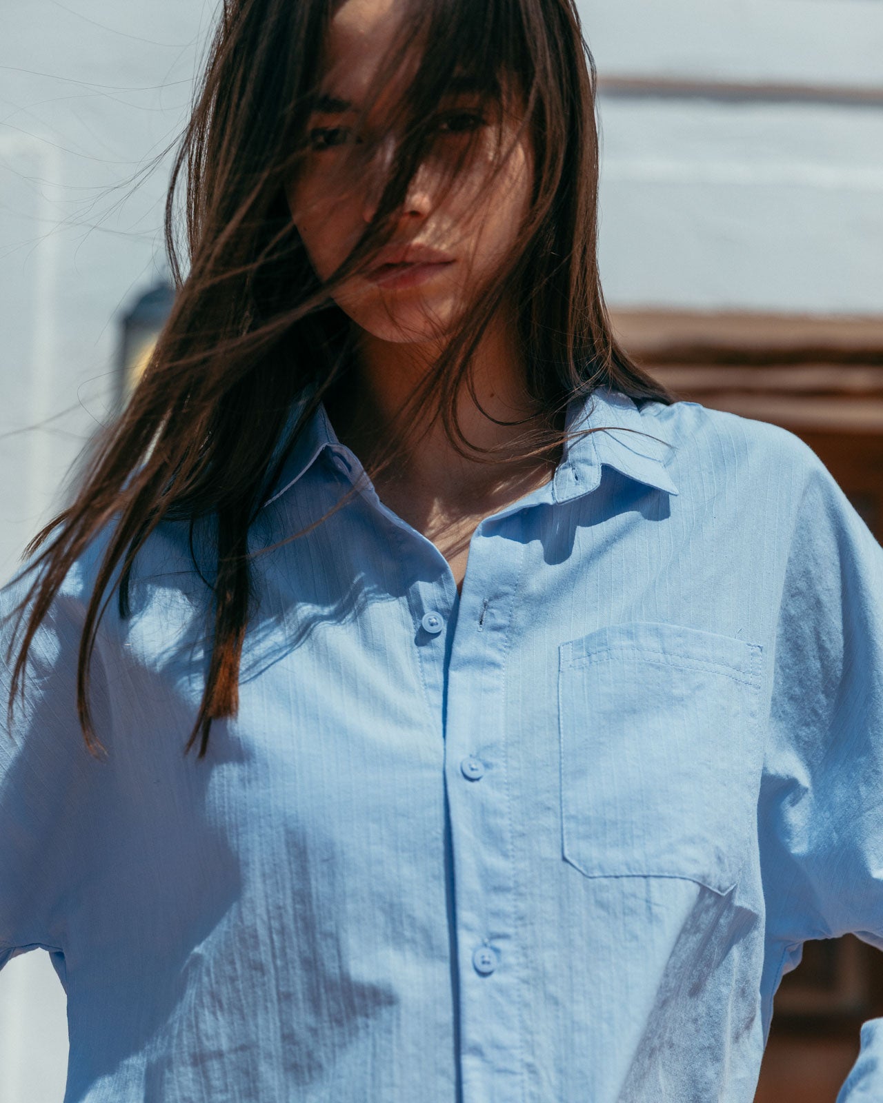 The shade of blue we want to see all summer. Its subtle striped texture and drop shoulder details give Lawrence modern classic status.