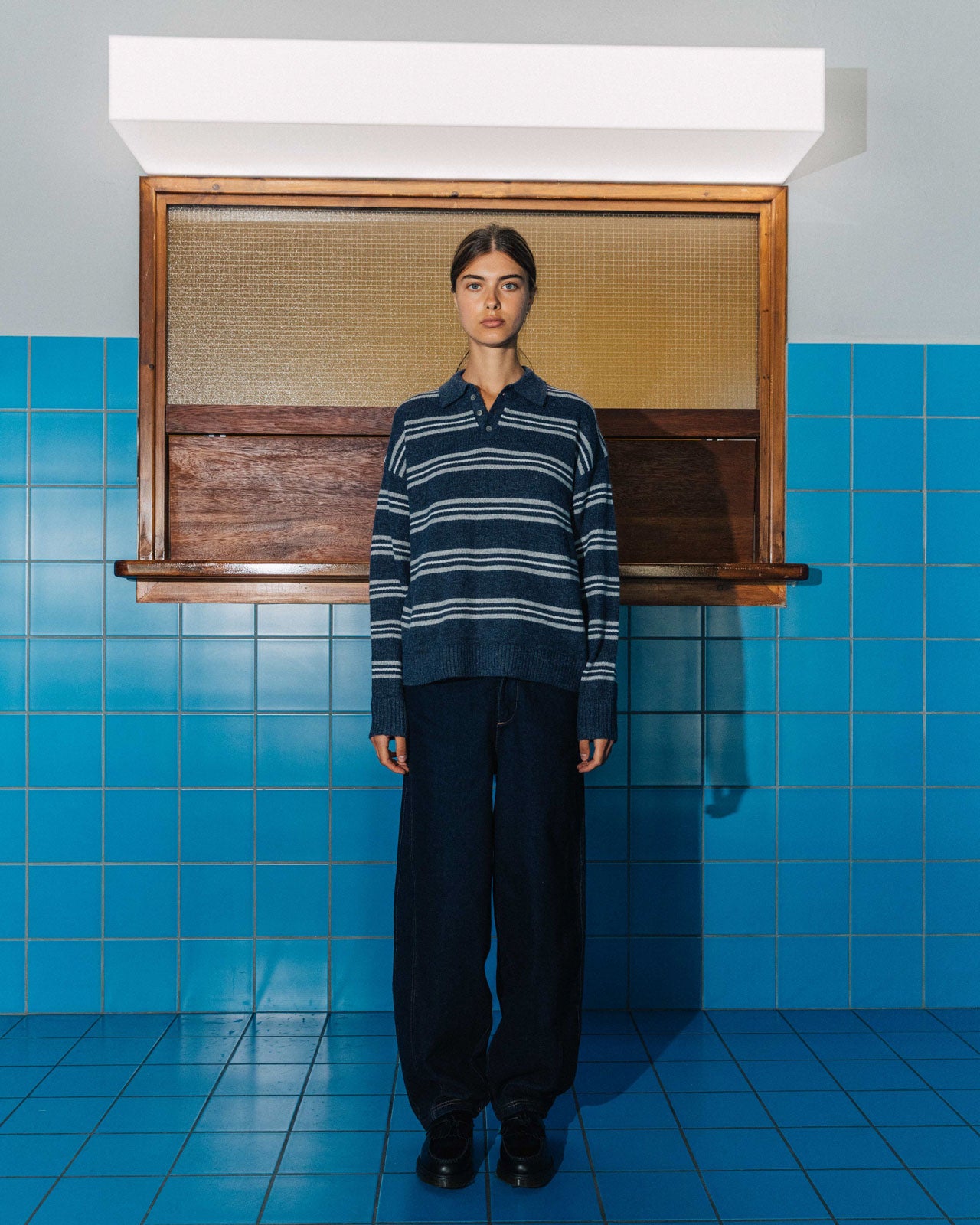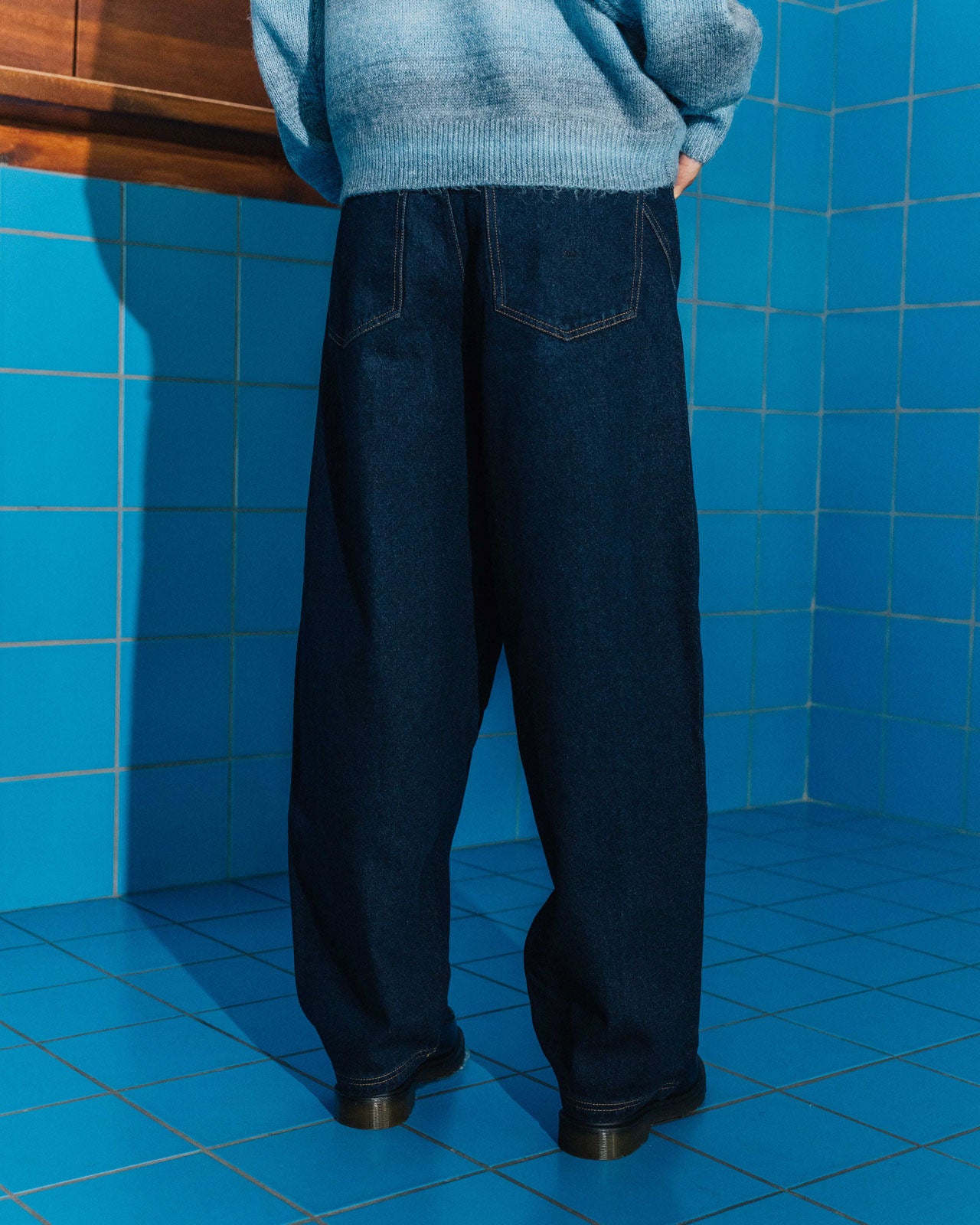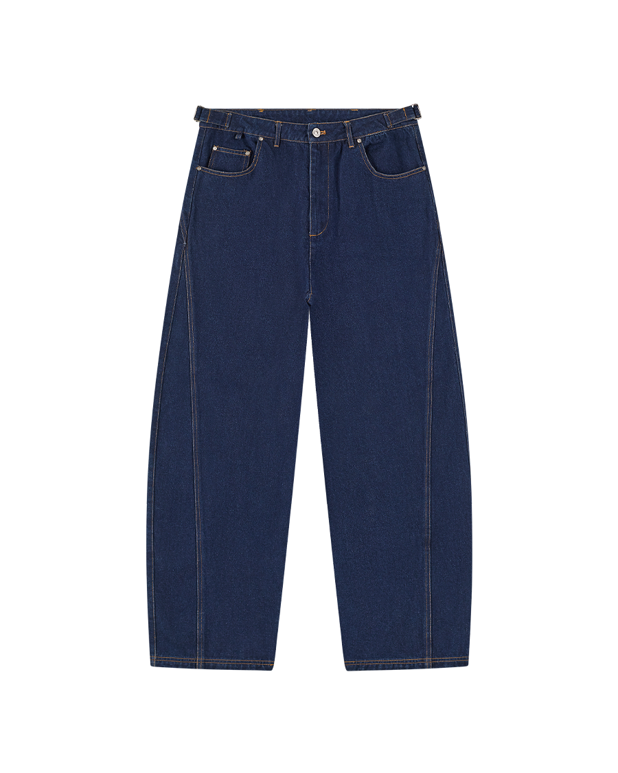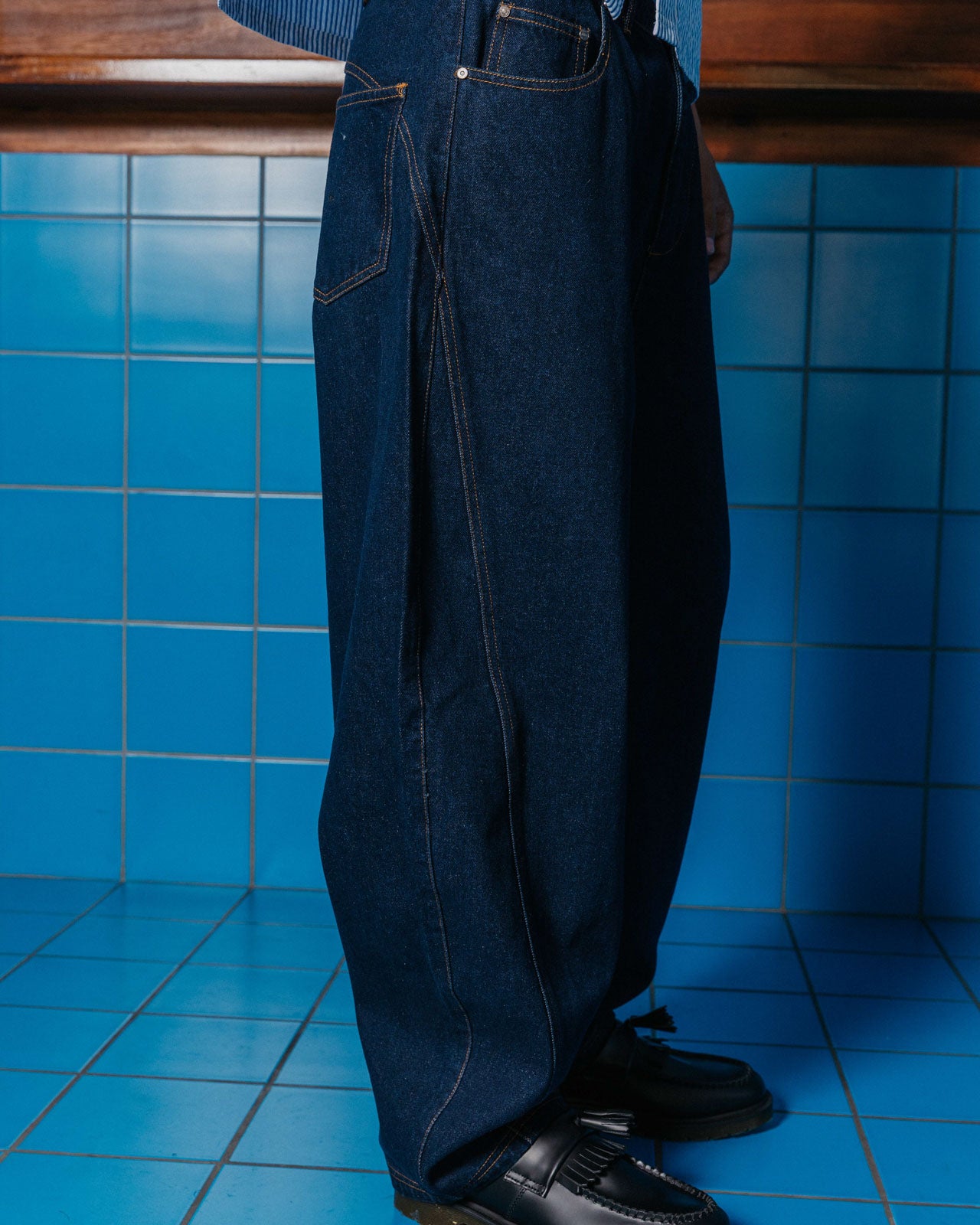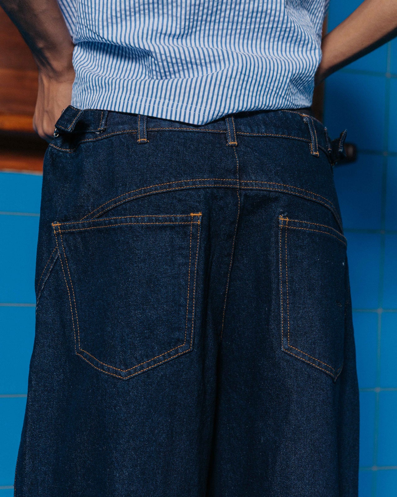 Meet Luka, our first barrel leg style. In a rich indigo denim with brown contrast stitching. Featuring curved seam details at the front and a curved yoke at the rear. With adjustable buckles on each side of the waistband, you can customise the fit to suit your look. The perfect meeting point between slouchy and structured.