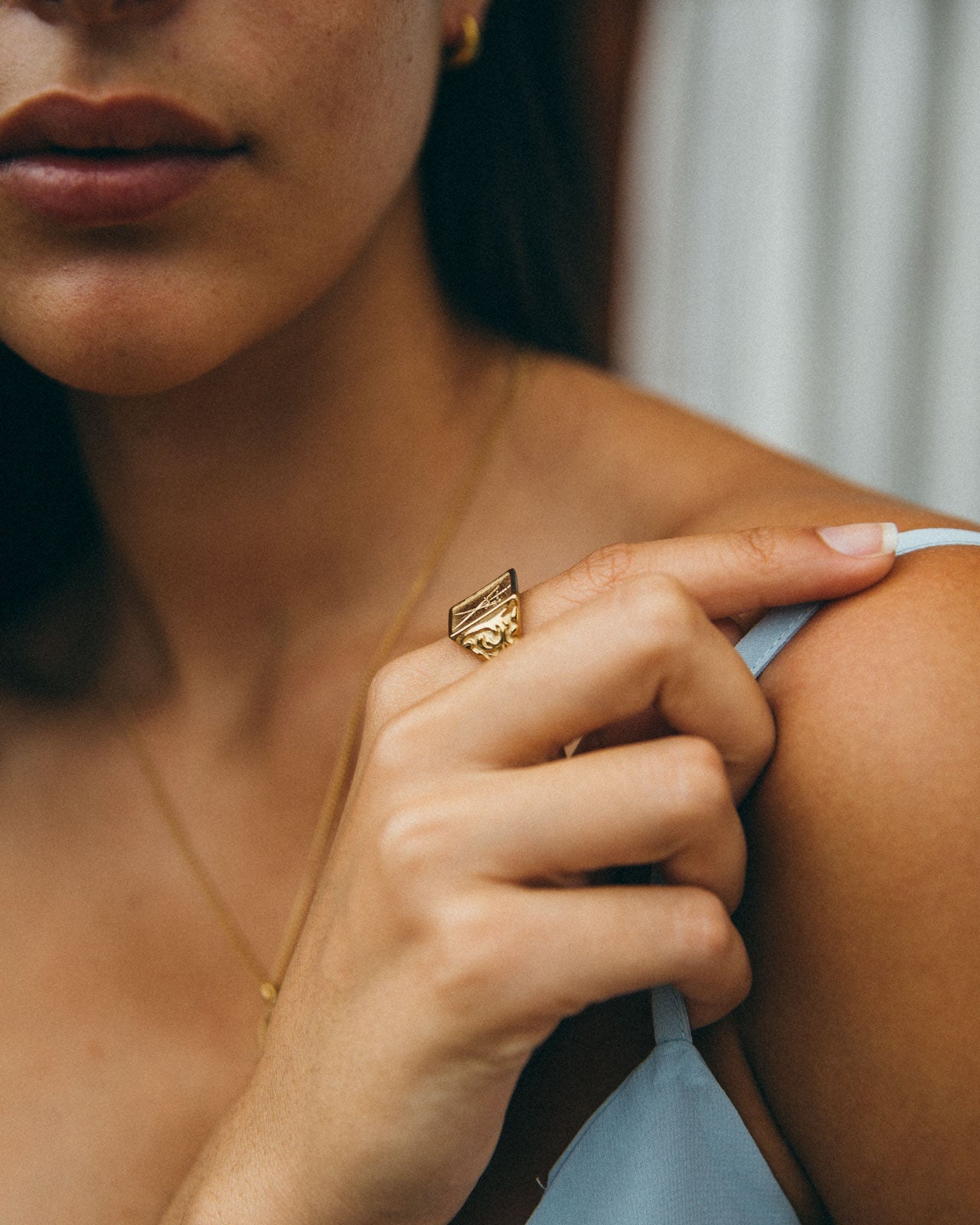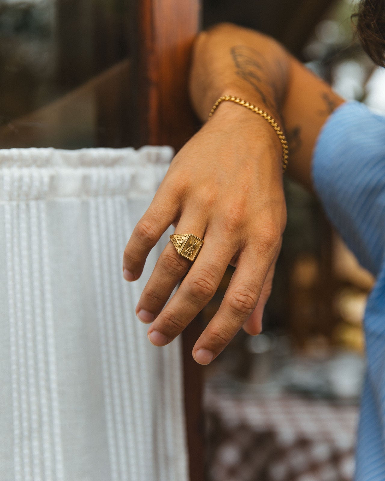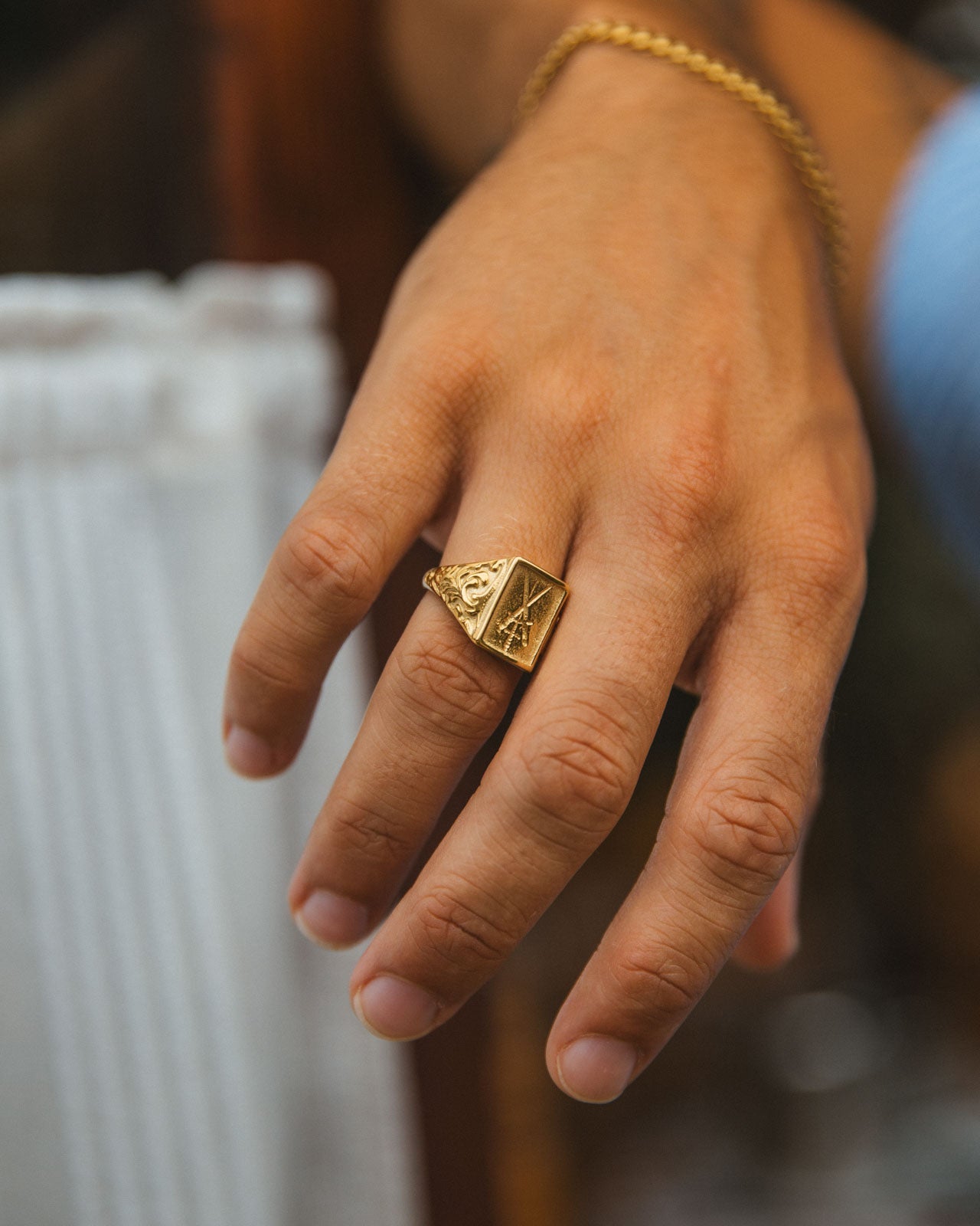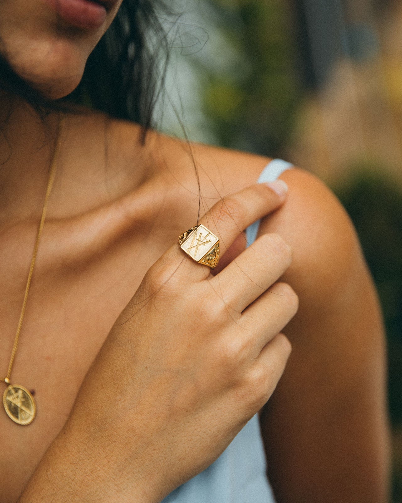 The three swords typically symbolise heartache, so we combined this with our shield to create a symbol of resilience and strength. Featuring three finely engraved swords, made with 14k gold PVD plated stainless steel, it's waterproof and tarnish-free, so it will stay beautiful wear after wear.