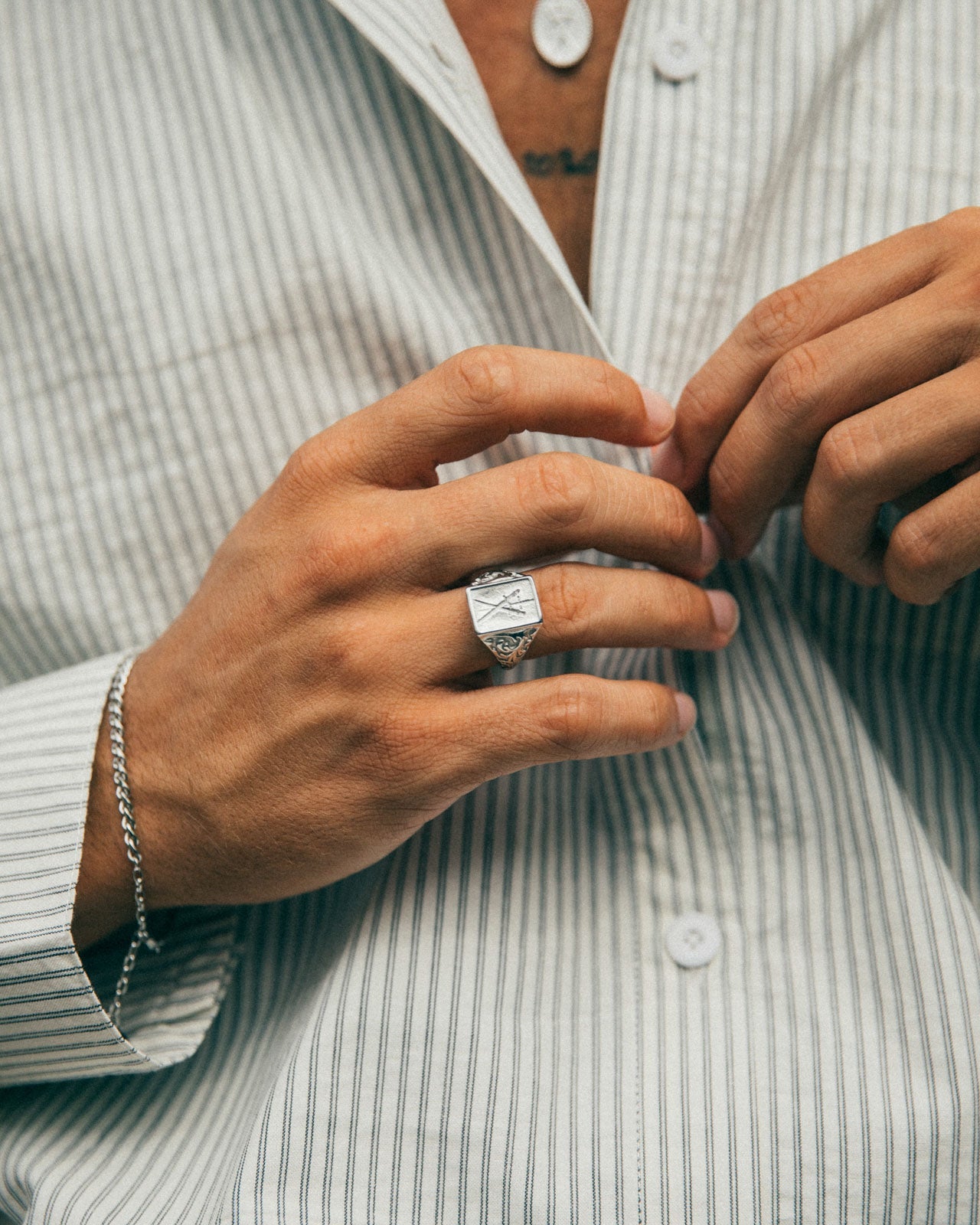 The three swords typically symbolise heartache, so we combined this with our shield to create a symbol of resilience and strength. Featuring three finely engraved swords, made from stainless steel, it’s waterproof and tarnish-free, ensuring it remains beautiful wear after wear.