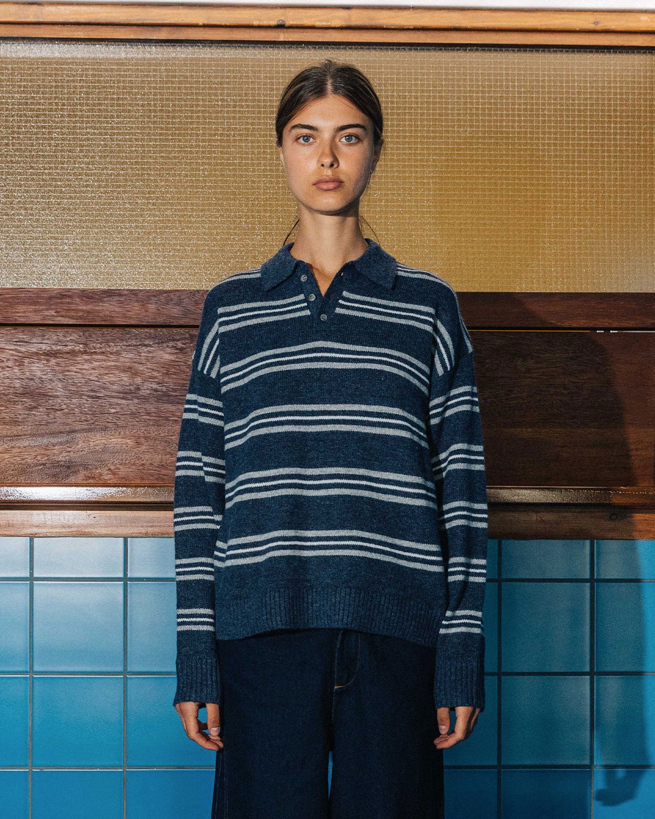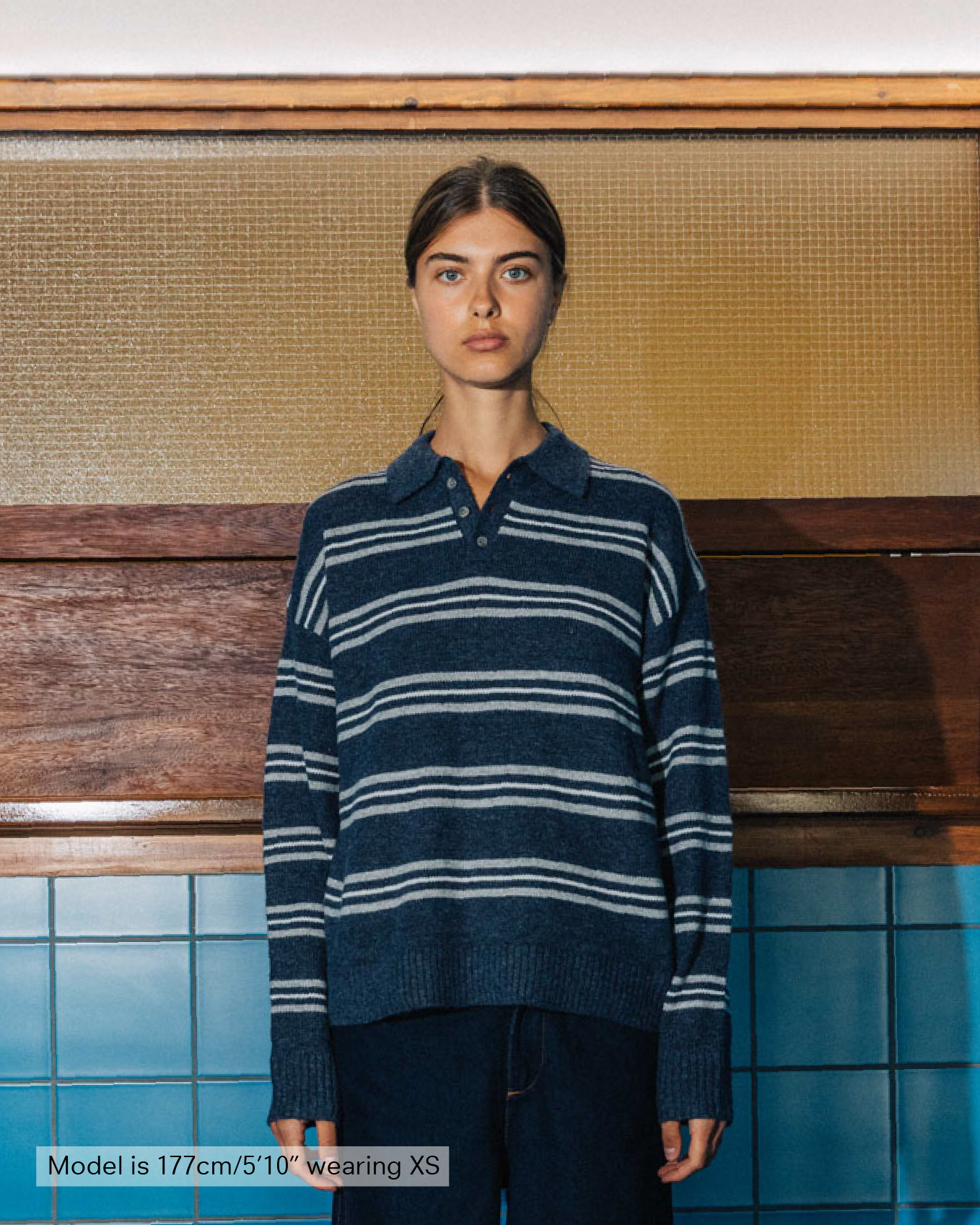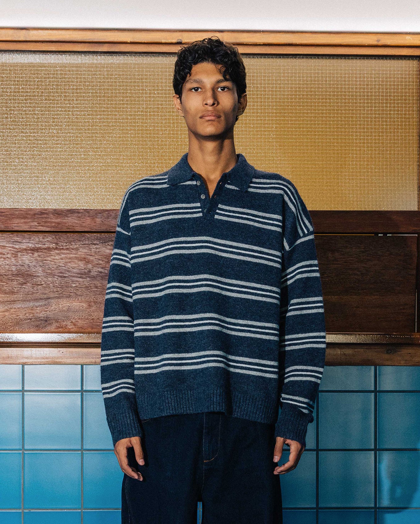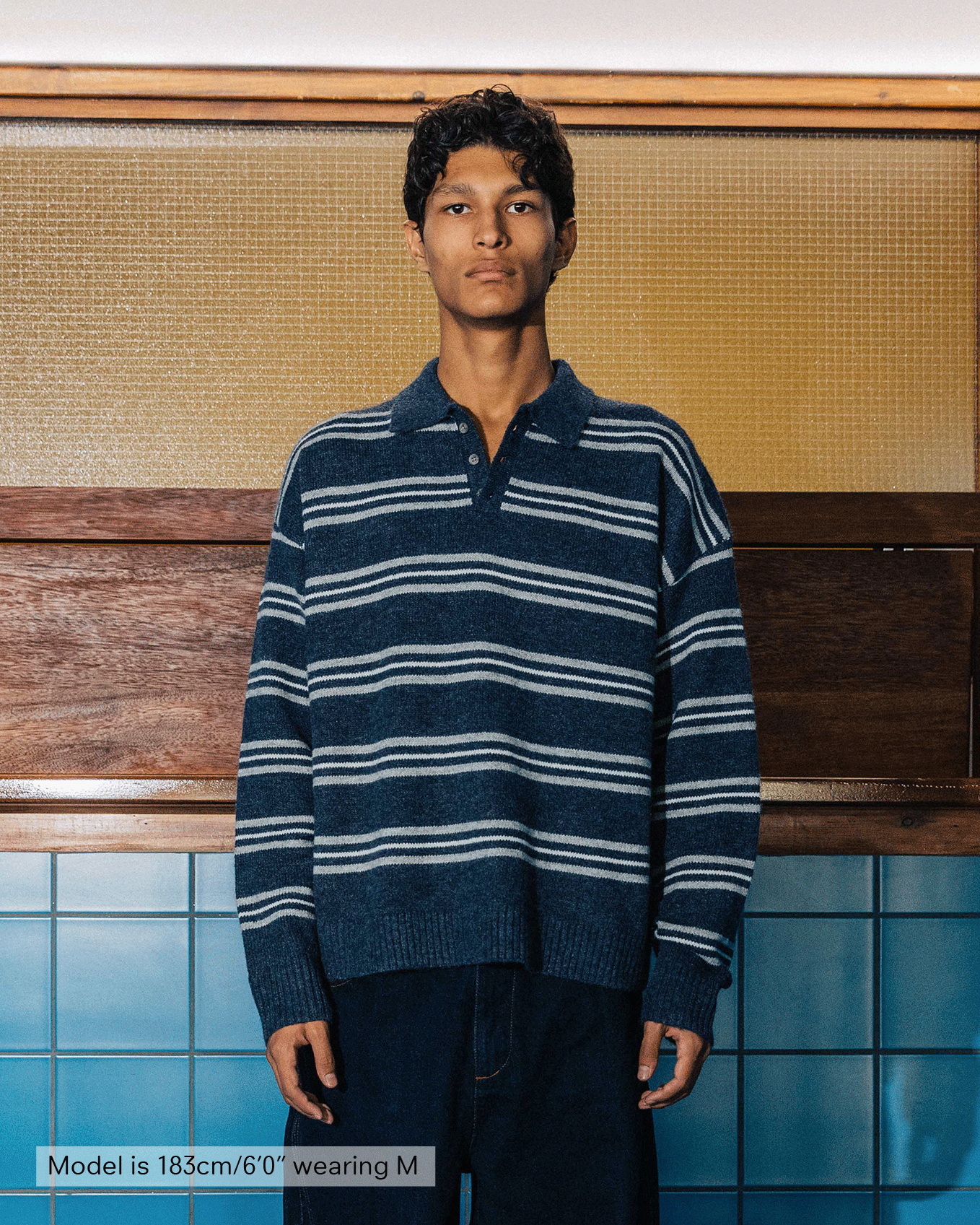 If we directed a coming-of-age movie, the main character would wear this. A classic polo structure meets relaxed knitwear to give you Myles, complete with stripes, a relaxed collar, and button detailing. Featuring dropped shoulders and ribbed edges around the openings.