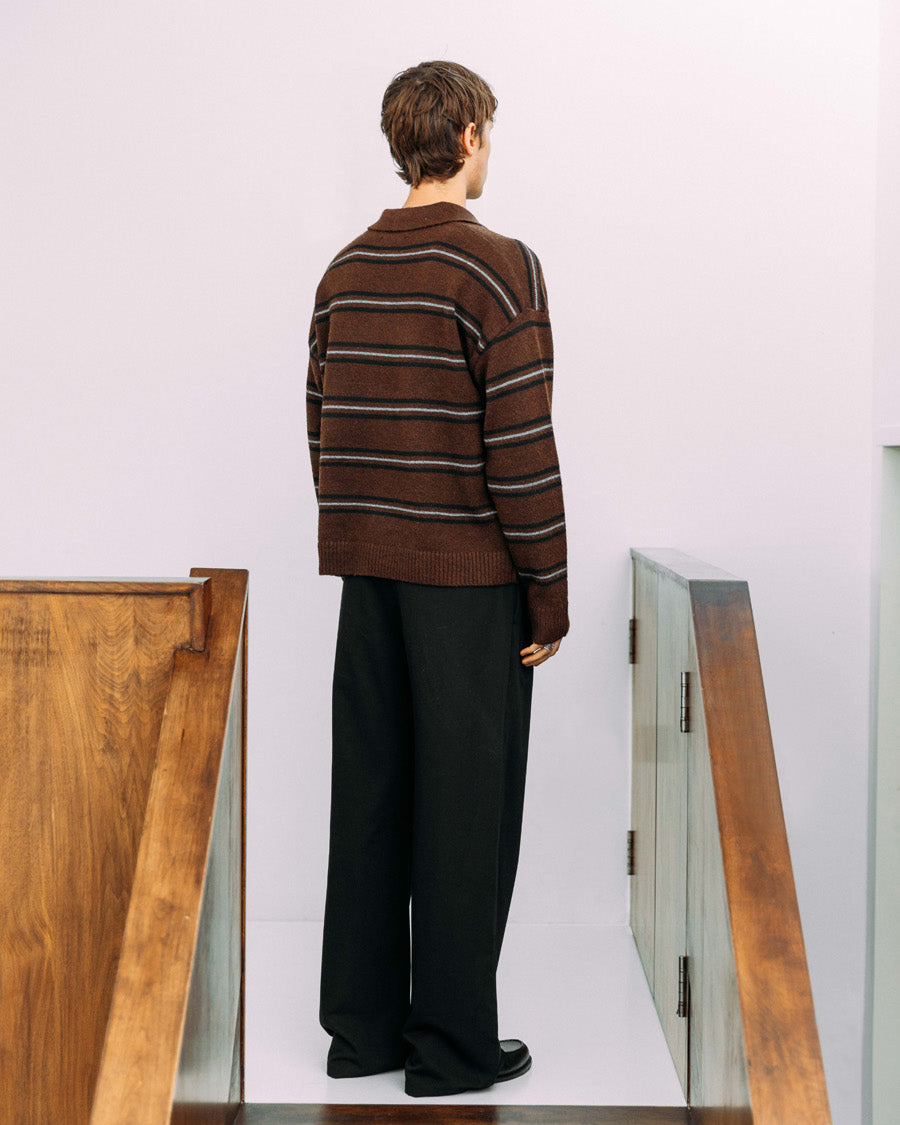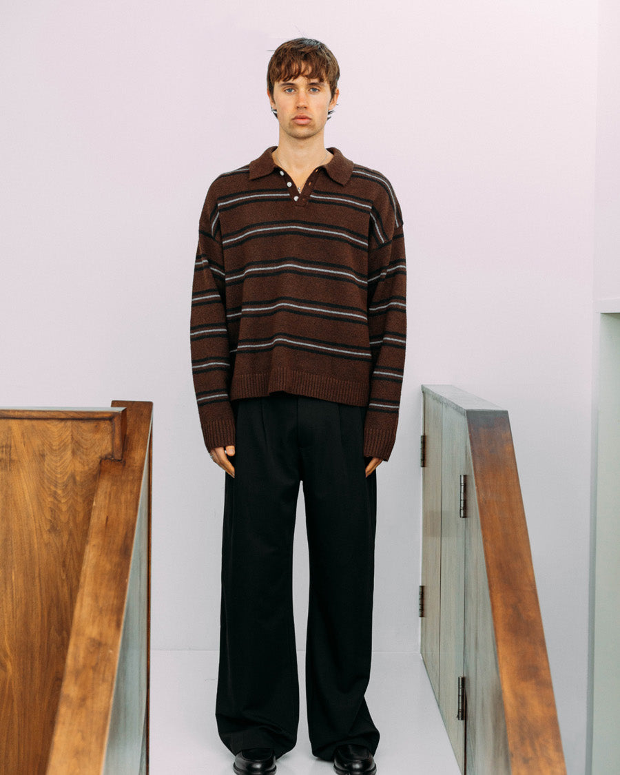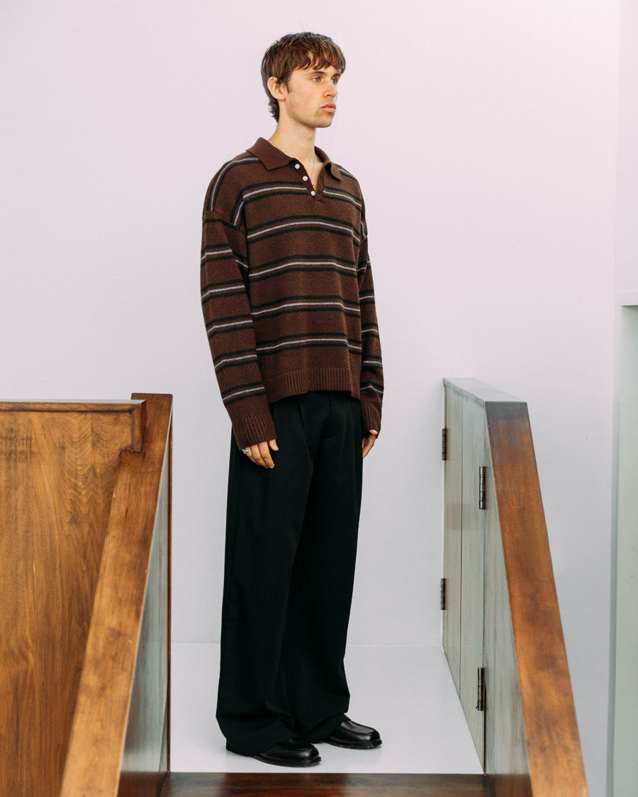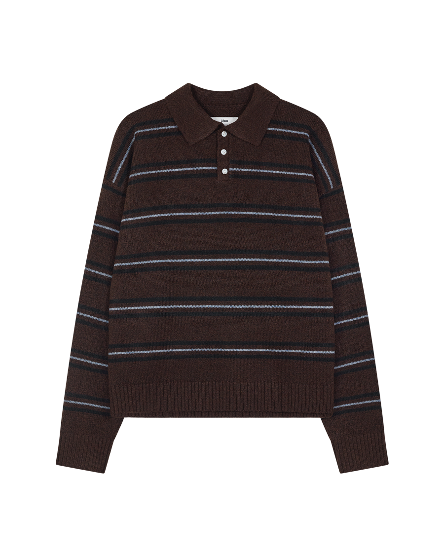 If we directed a coming-of-age movie, the main character would wear this. A classic polo structure meets relaxed knitwear to give you Myles, complete with stripes, a relaxed collar, and button detailing. Featuring dropped shoulders and ribbed edges around the openings.