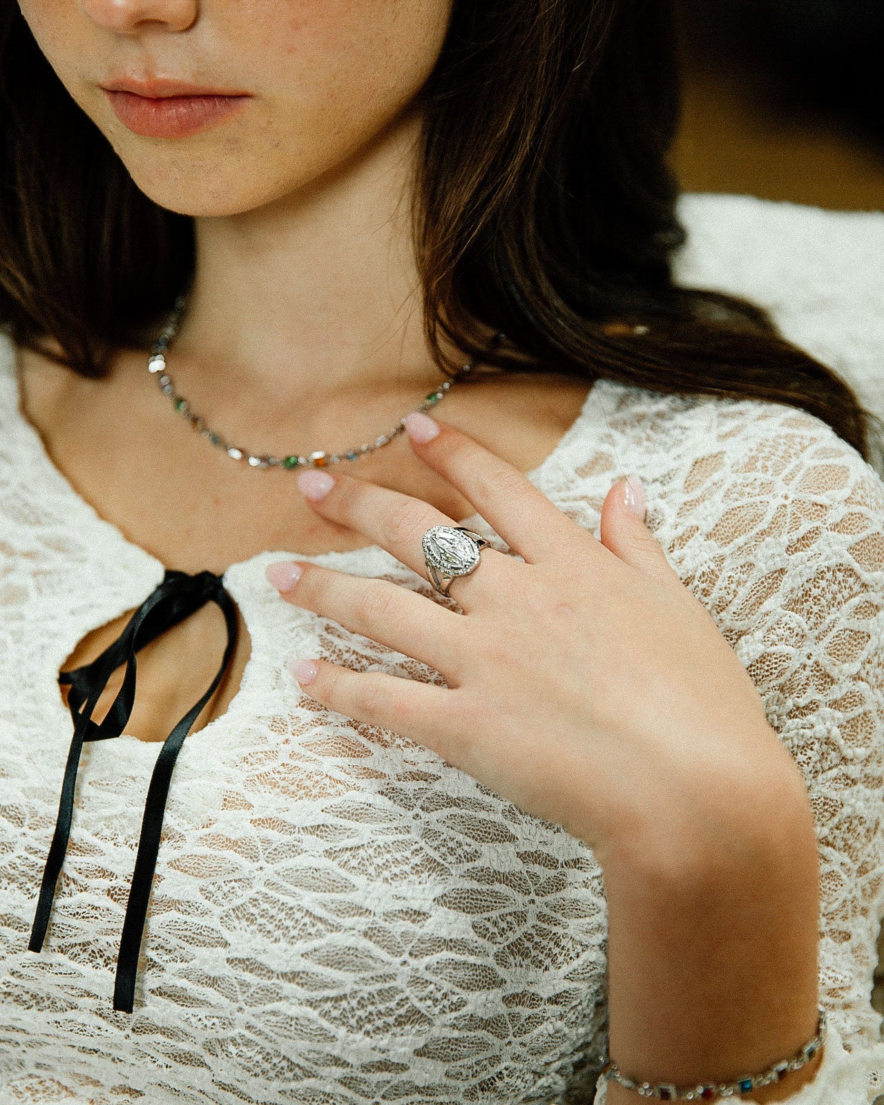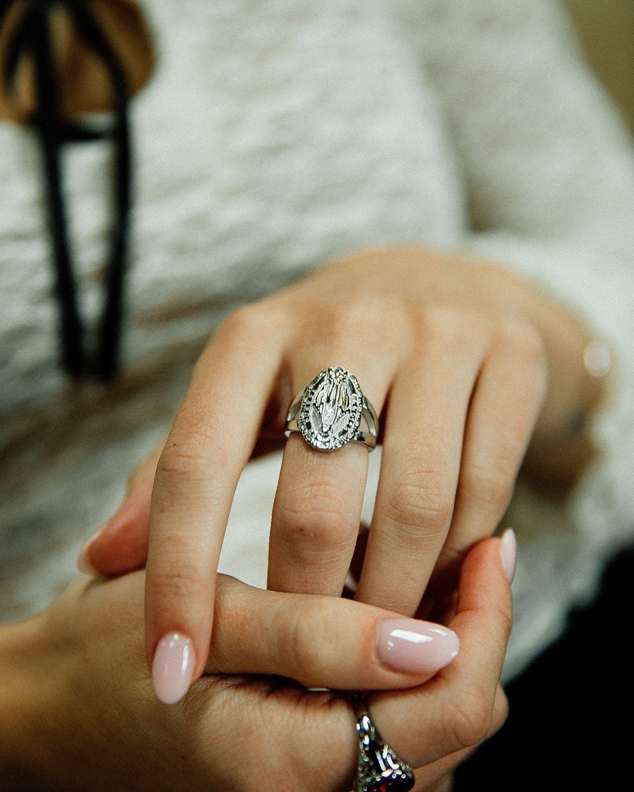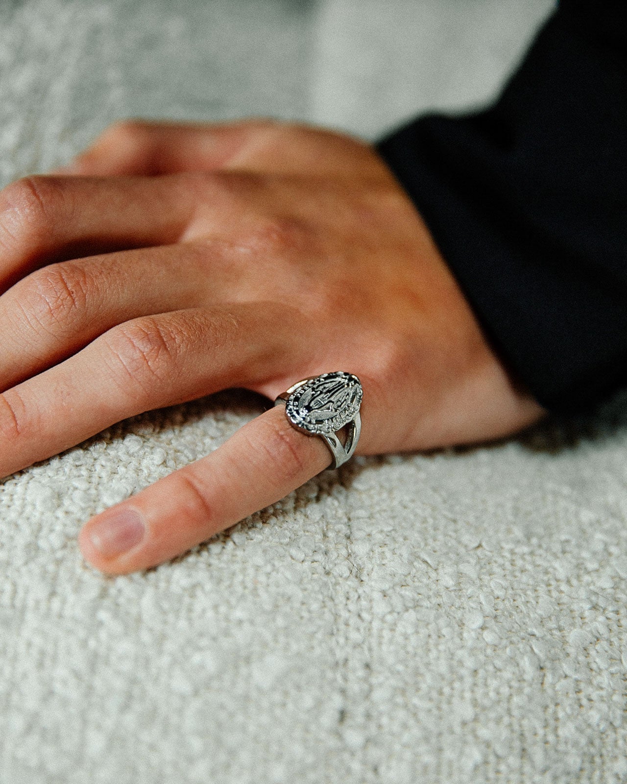 Vintage inspired Virgin Mary ring featuring "Bendita Sea Tu Pureza" engraving and a split shank band design. Made with stainless steel, it's waterproof and tarnish-free, so it will stay beautiful wear after wear.