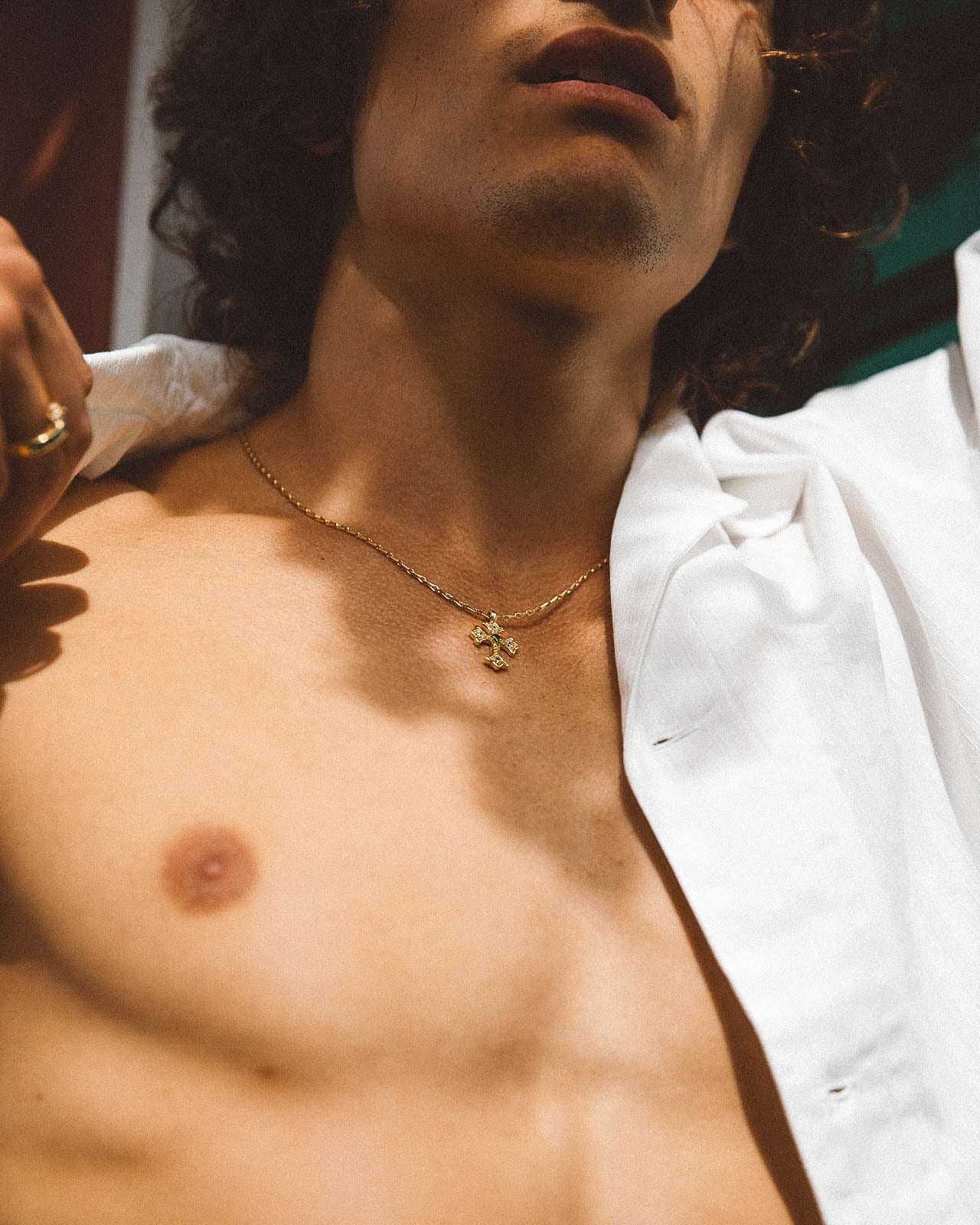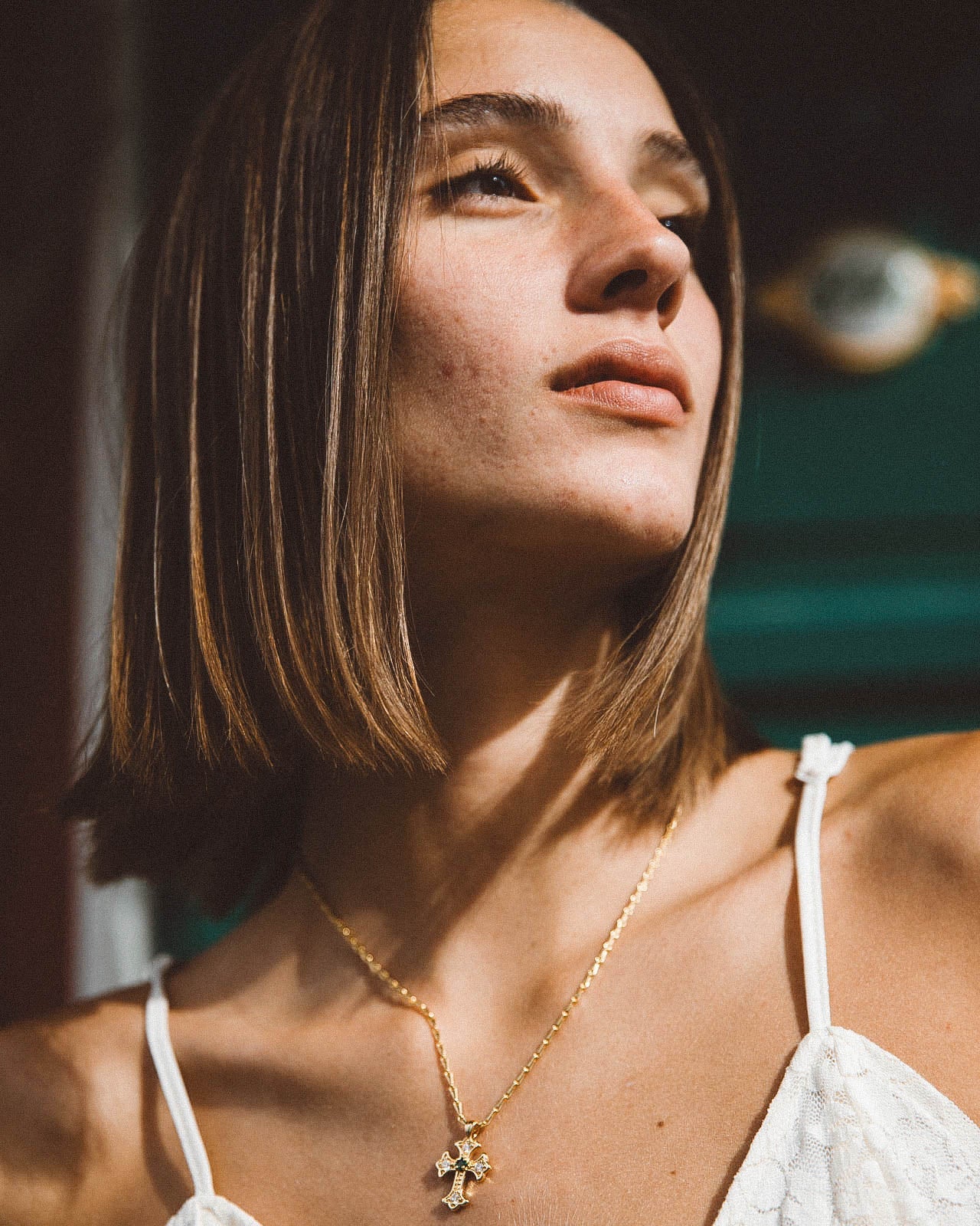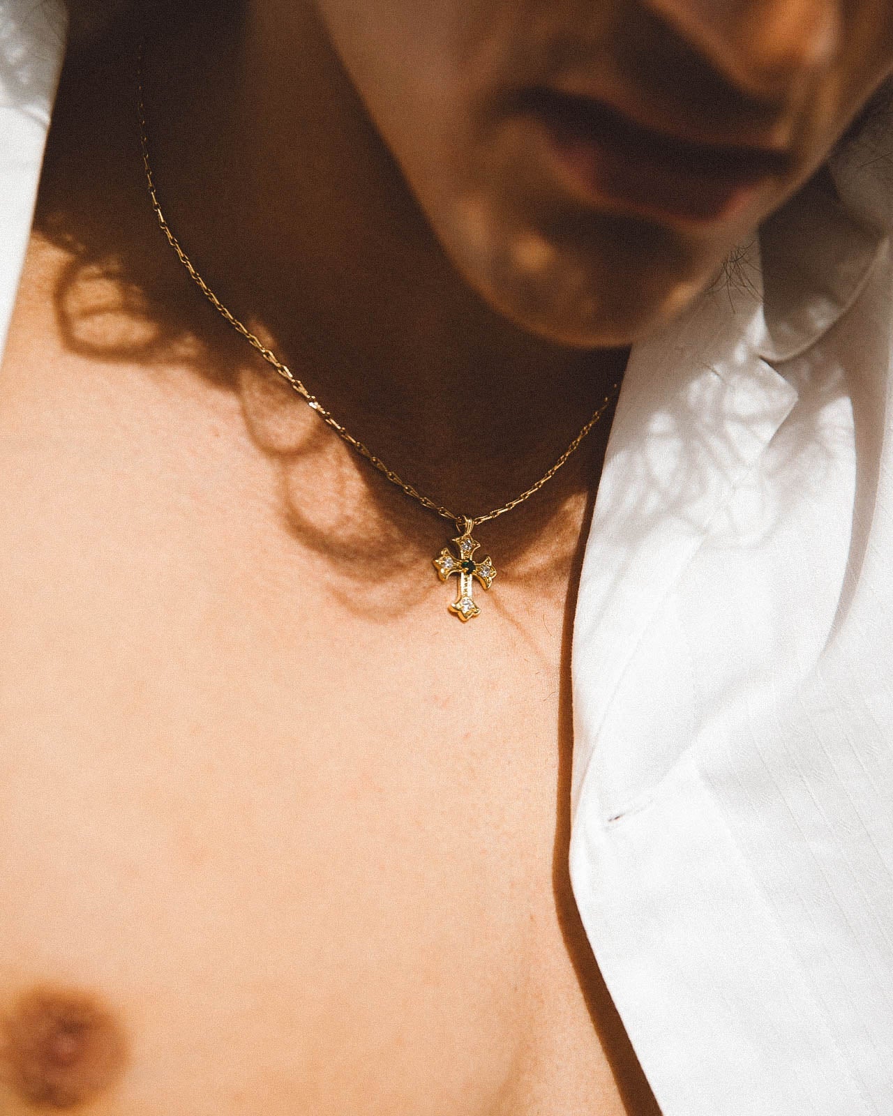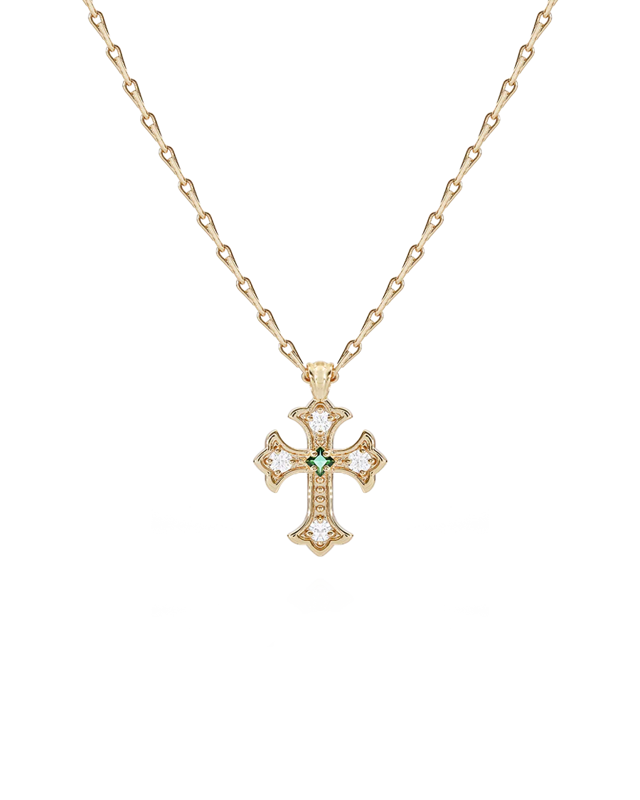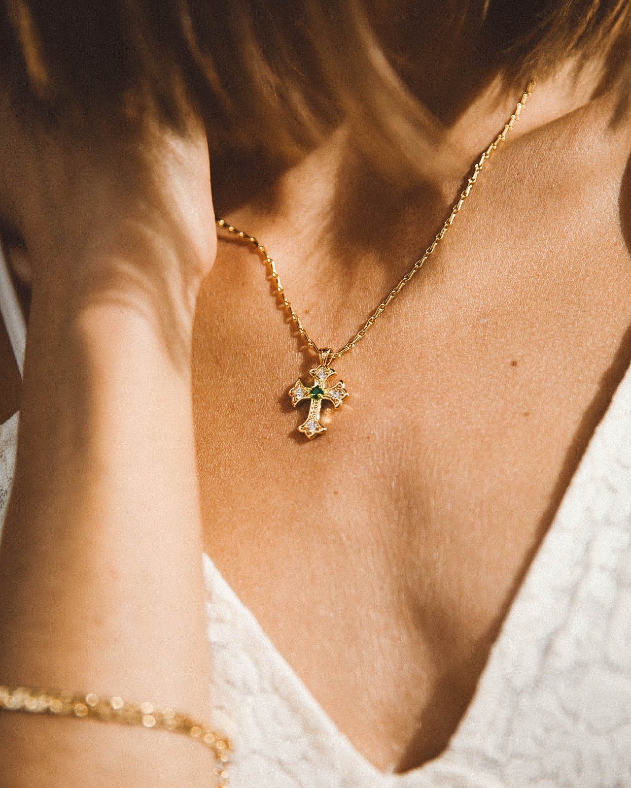 Inspired by the decadent vintage crosses you see whilst browsing European flea markets. Sicily features a thin link chain with emerald and crystal cubic zirconia gemstones.