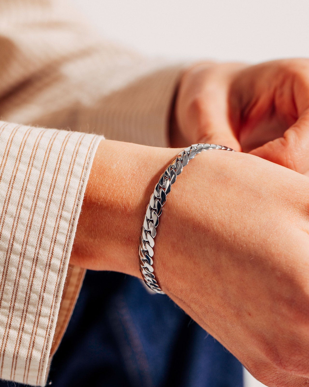 Introducing the 'Theo' Cuban Chain Bracelet, our first stainless steel jewelry. Crafted with rhodium plated stainless steel, this minimalistic piece is a wardrobe essential. Versatile and elegant, it effortlessly elevates any look with its sleek design. Embrace the durability and timeless appeal of the 'Theo' Cuban Chain Bracelet for a stylish and polished finish.