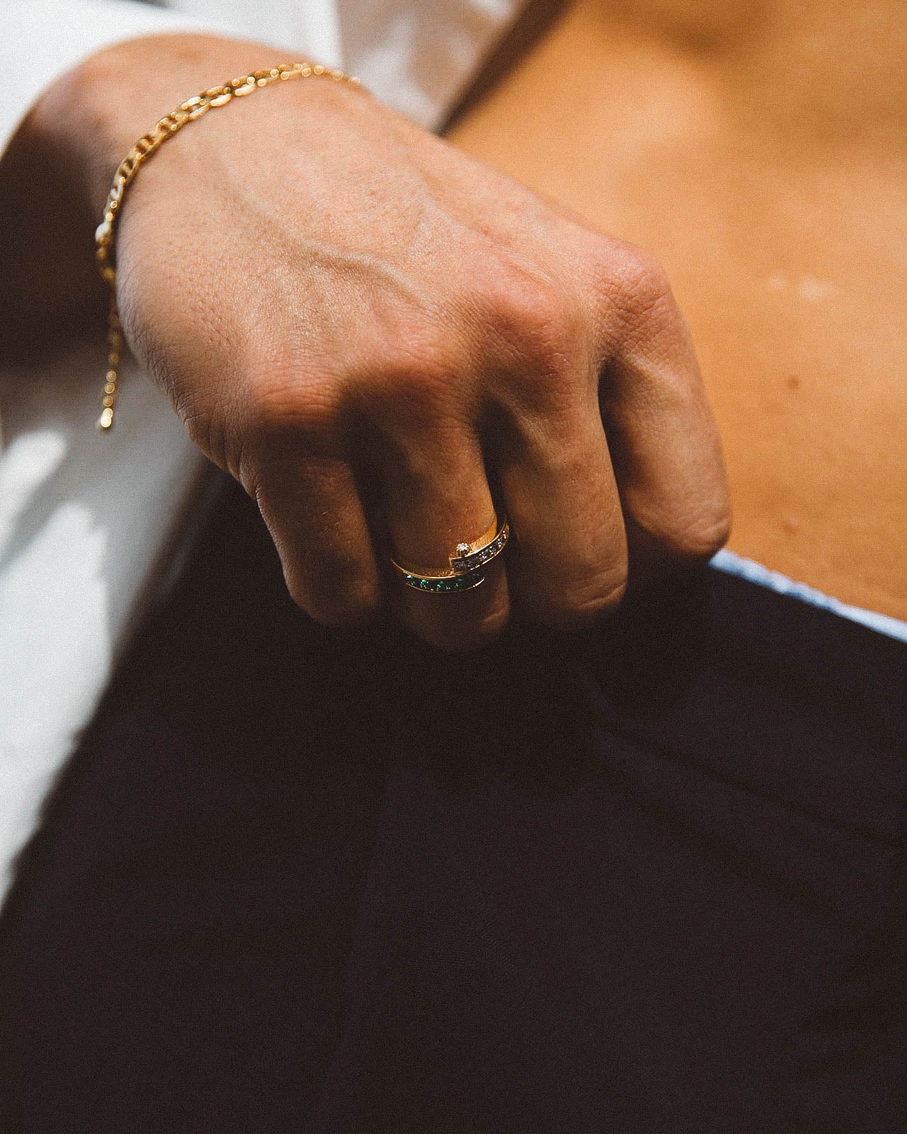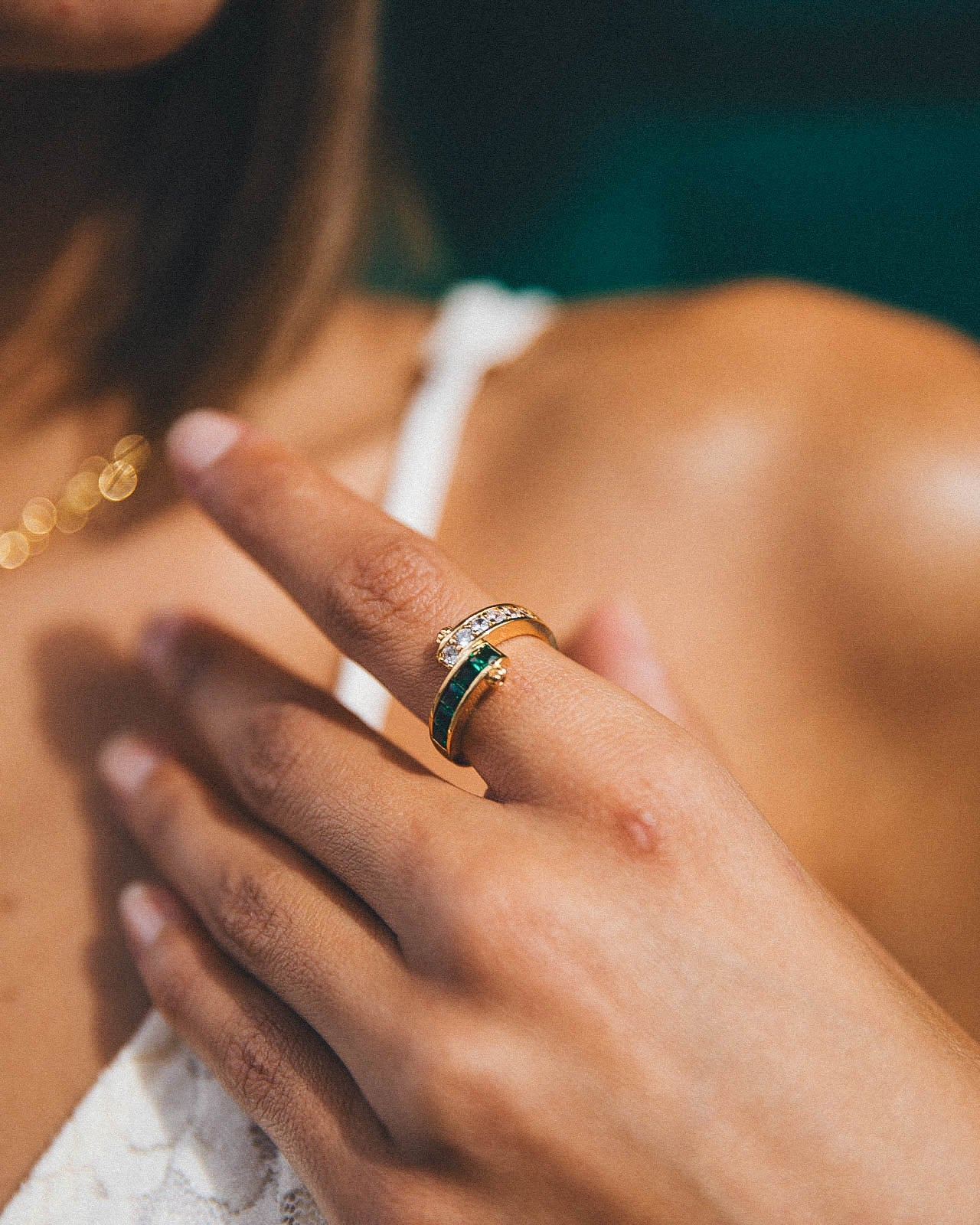 The ring that you friends will be envious of. Vesper features a beautiful curved design of both emerald and crystal cubic zirconia gemstones.