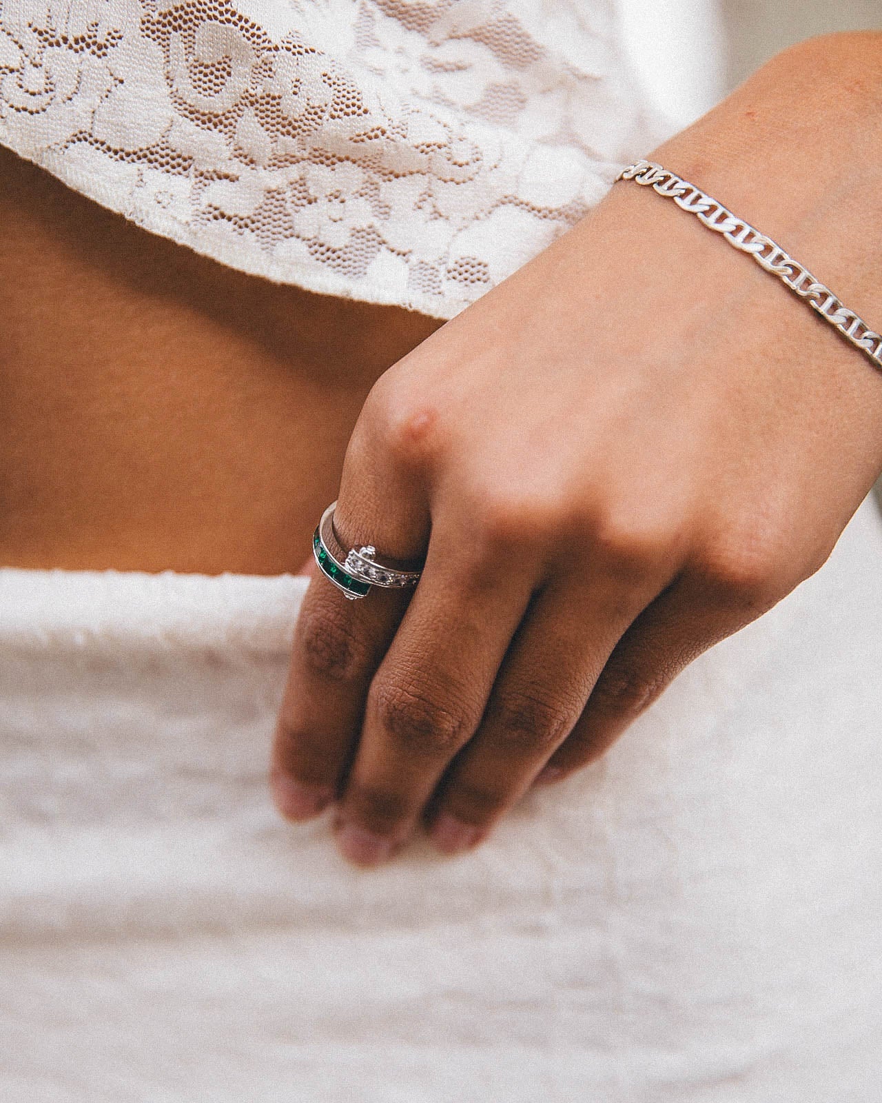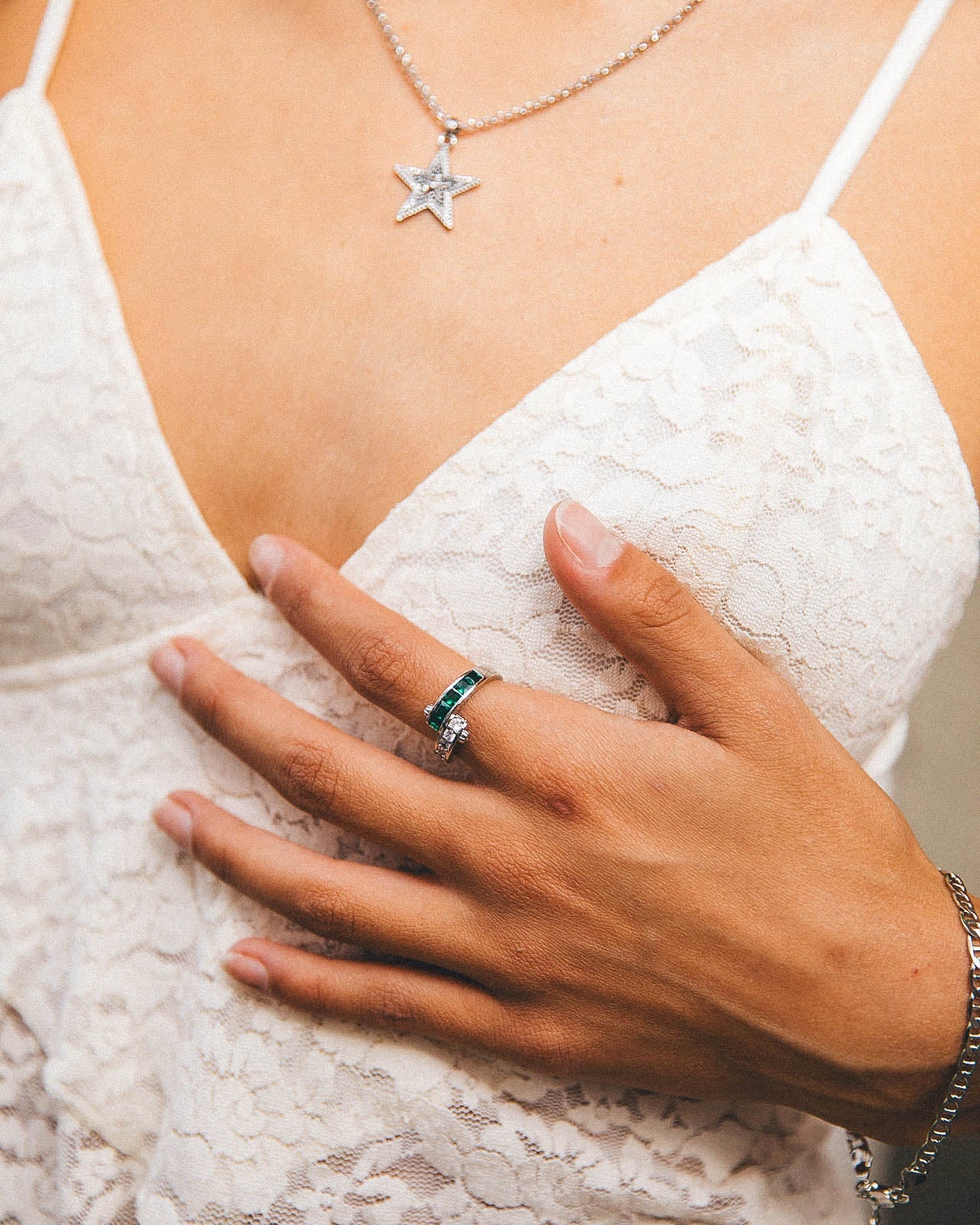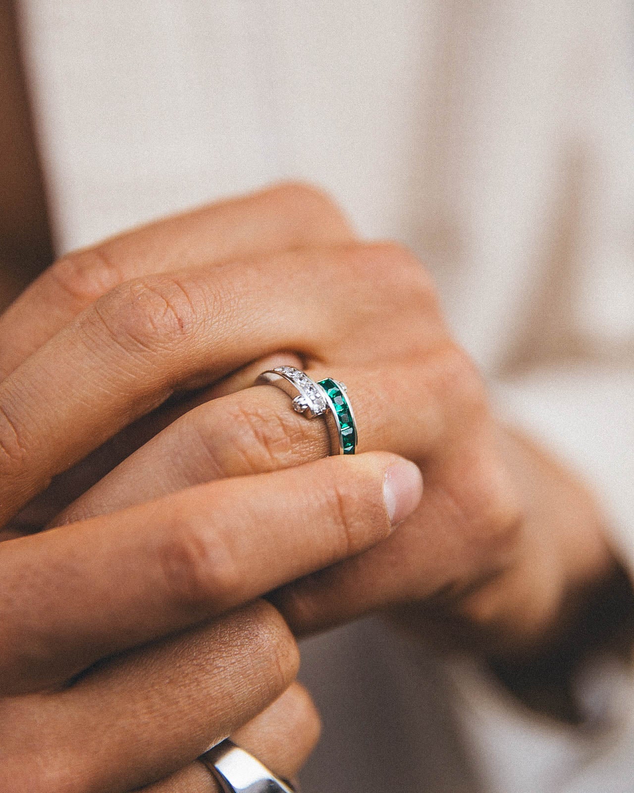 The ring that you friends will be envious of. Vesper features a beautiful curved design of both emerald and crystal cubic zirconia gemstones.