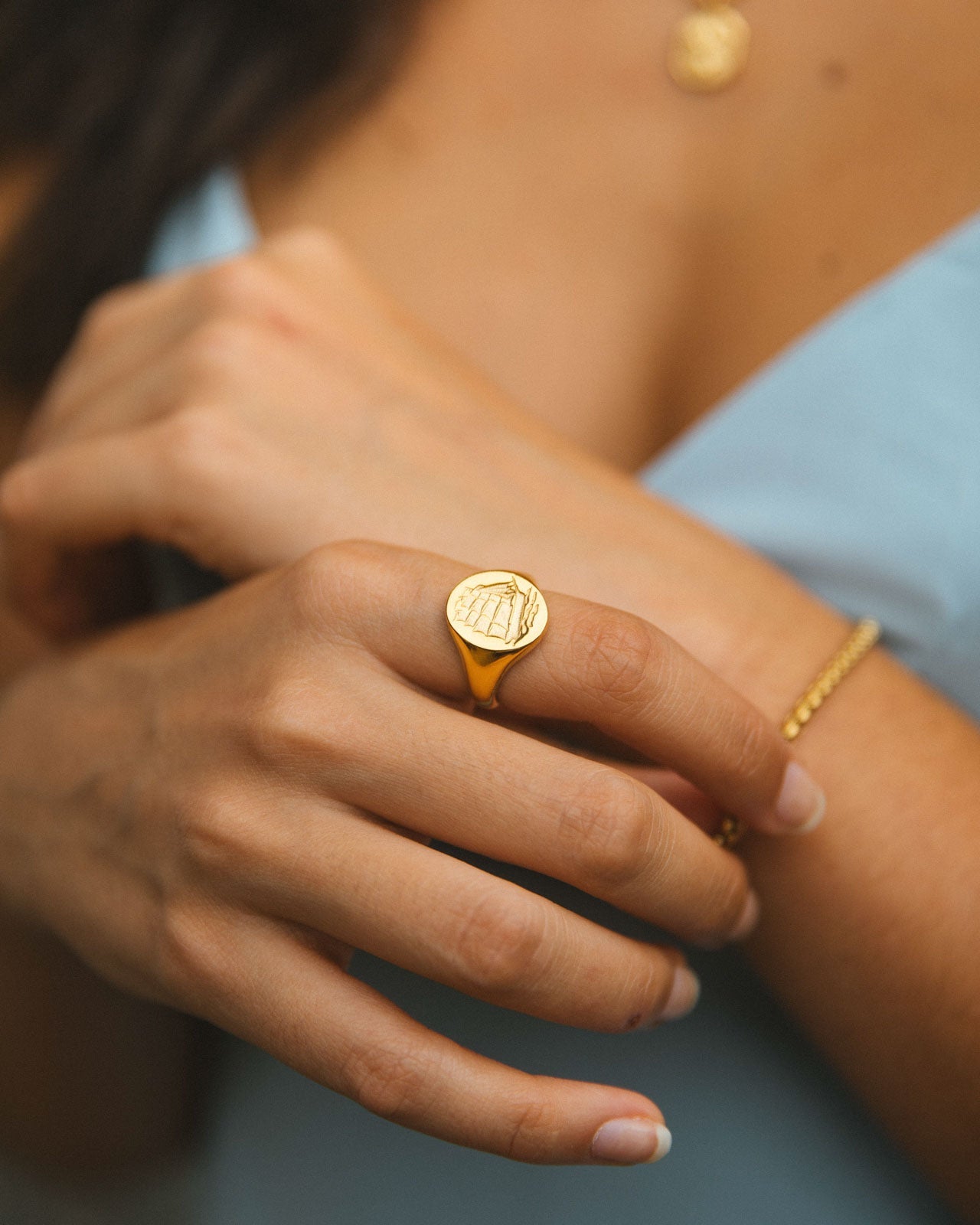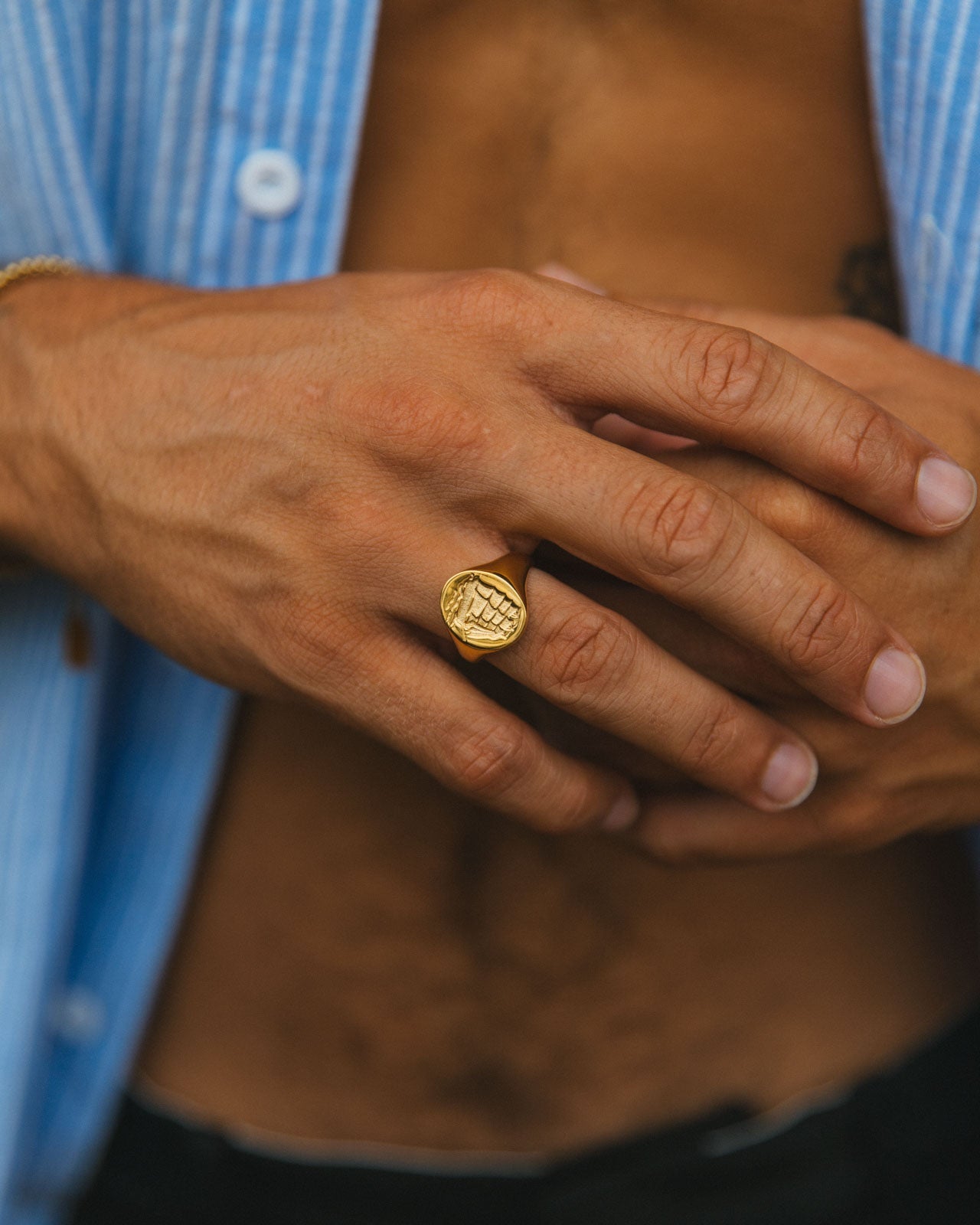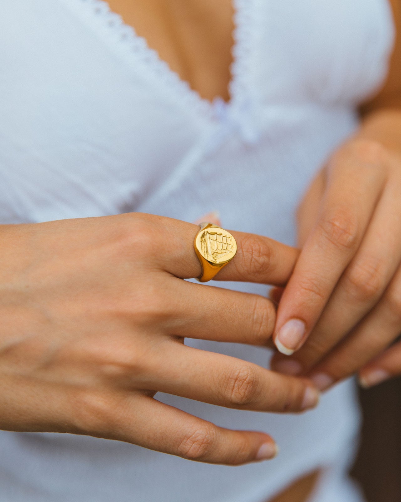 Introducing Zale, the classic signet ring featuring a finely engraved boat that embodies adventure and freedom. In Greek, the name Zale translates to "power of the sea" reflecting its maritime heritage and timeless elegance. Made with 14k gold PVD plated stainless steel, it's waterproof and tarnish-free, so it will stay beautiful wear after wear.